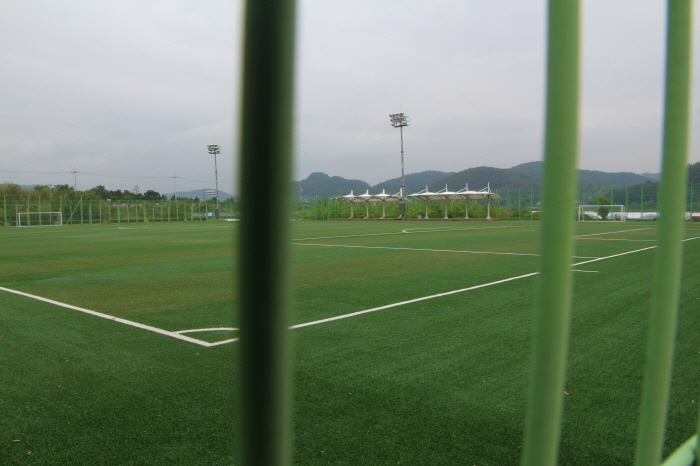 완사시장에서 큰길을 건너면 공원이 나옵니다. 공원 주차장에 차를 세우고 공원으로 향하자 먼저 잔디밭이 먼저 싱그럽게 다가옵니다. 축구 등을 할 수 있는 체육 공간을 지나자 푹신푹신한 흙길이 나옵니다. 곤명면 11개 마을 주민들의 부지 기부채납으로 만든 학습장이자 공원입니다.