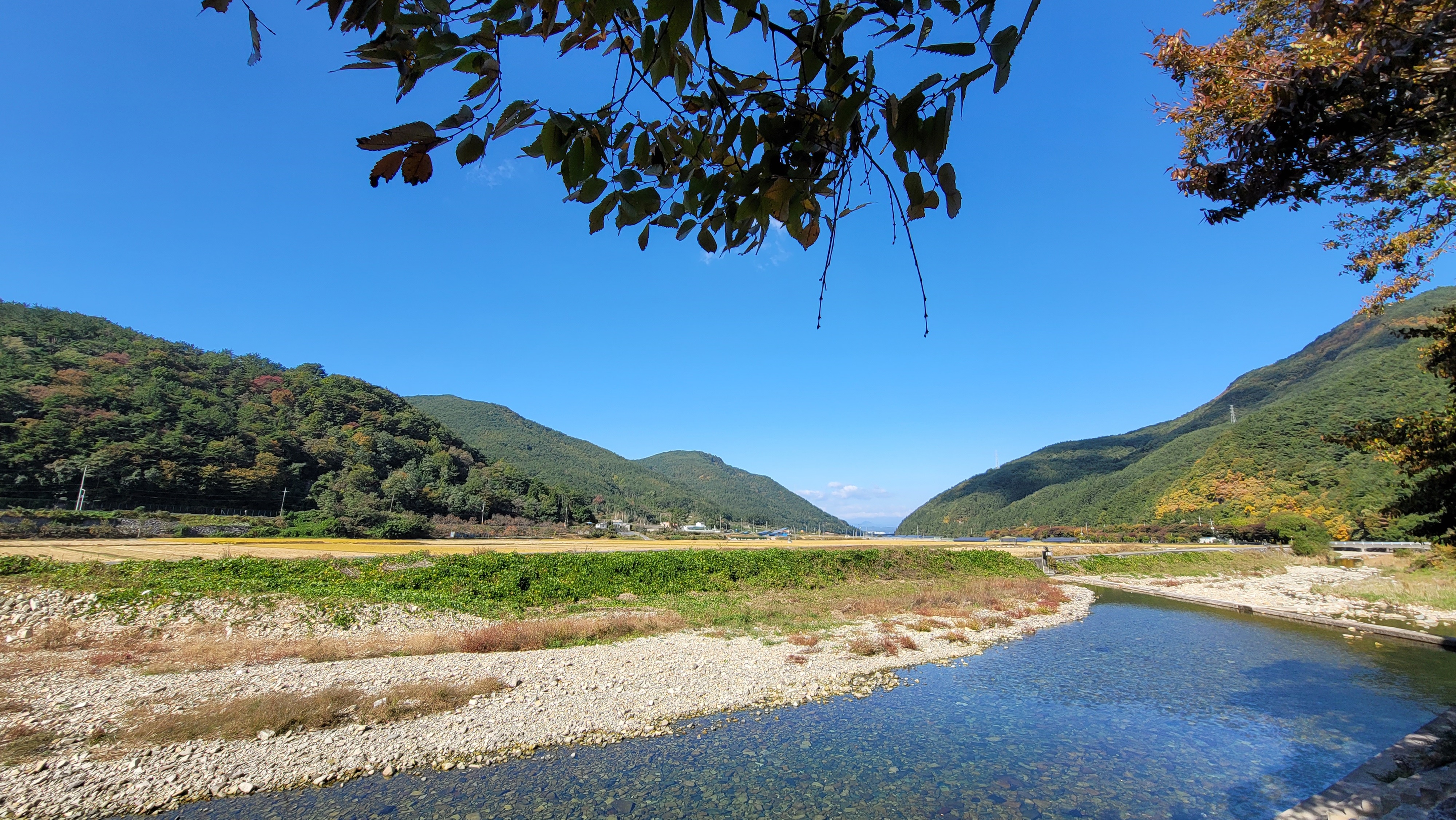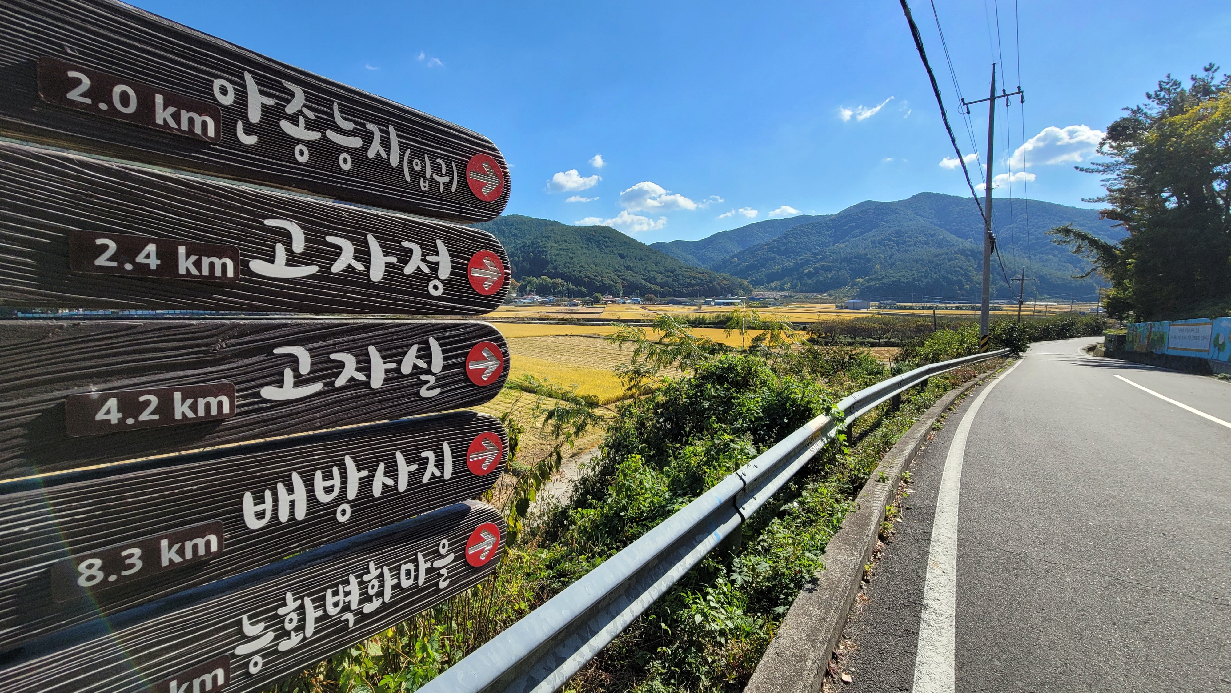 황금 들녘 너머로 제왕의 고향이라는 뜻인 풍패지향(豐沛之鄕)이라는 글귀가 눈에 들어옵니다. 마을 골목길은 어린 현종이 아버지 안종을 그리워한 내용이 그려져 있습니다. 보너스 같은 시간 여행지 마을을 둘러보고 다시금 개울 쪽으로 걸음을 옮기면 마을 숲이 나옵니다.