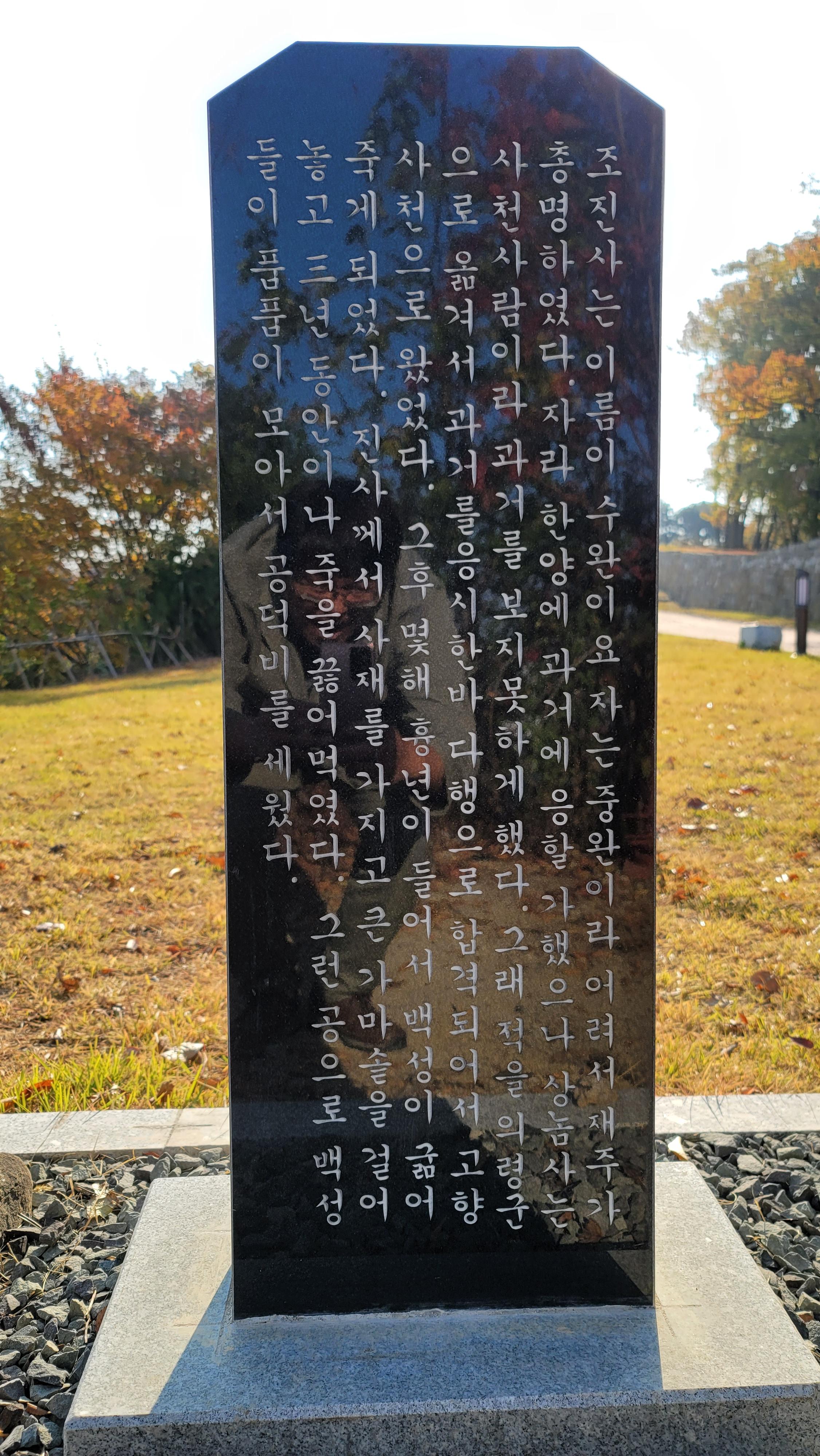 몇 해 흉년이 들어 백성들이 굶어 죽을 때 조 진사는 사재를 털어 큰 가마솥을 걸어 놓고 3년 동안이나 죽을 끓여 먹였다고 합니다. 공덕비 위로 내리는 가을볕이 따사롭습니다.