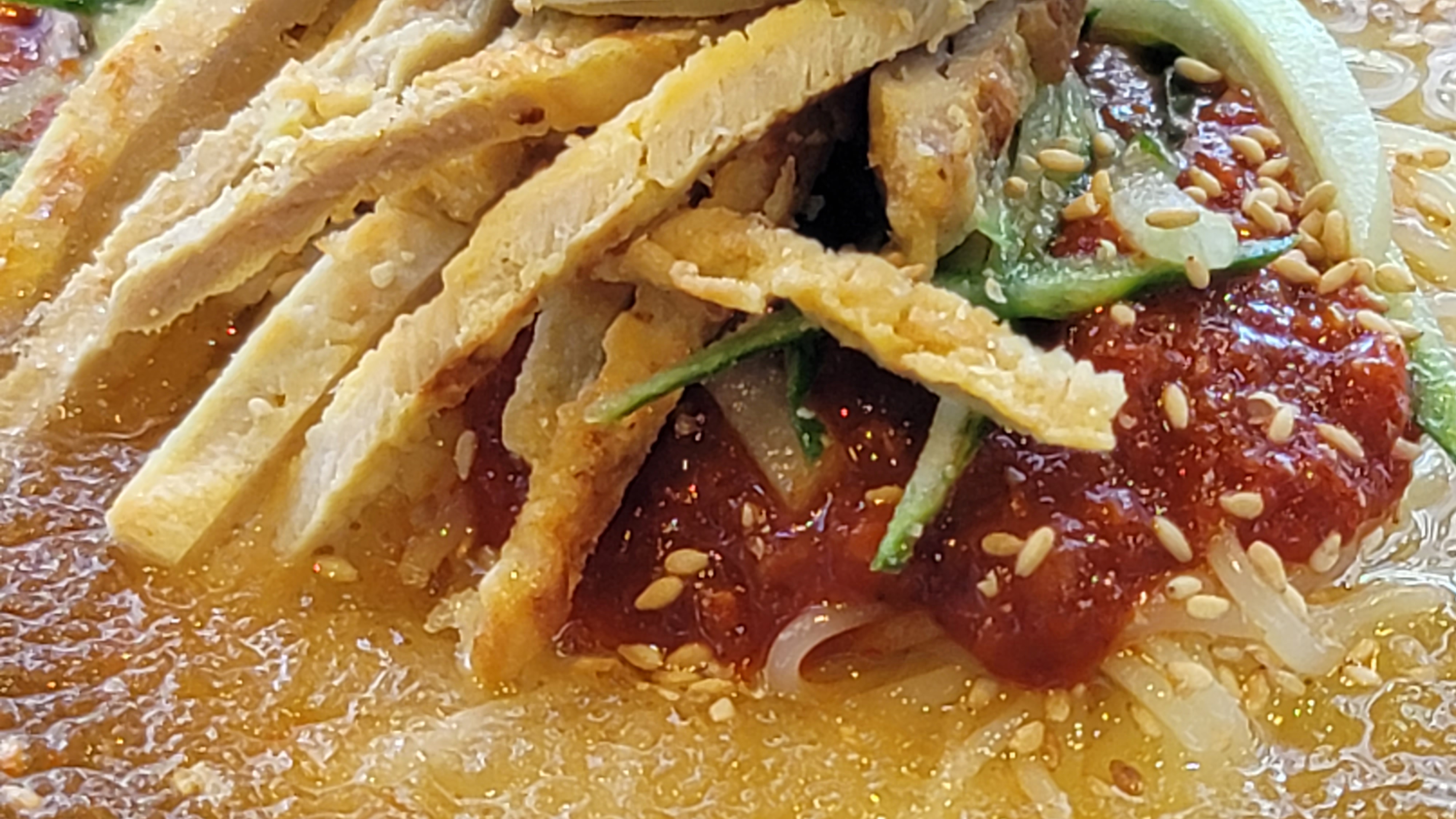 돼지고기 고명도 나오고 화려한 물 밀면은 시각적으로 입에 침이 고이게 합니다.