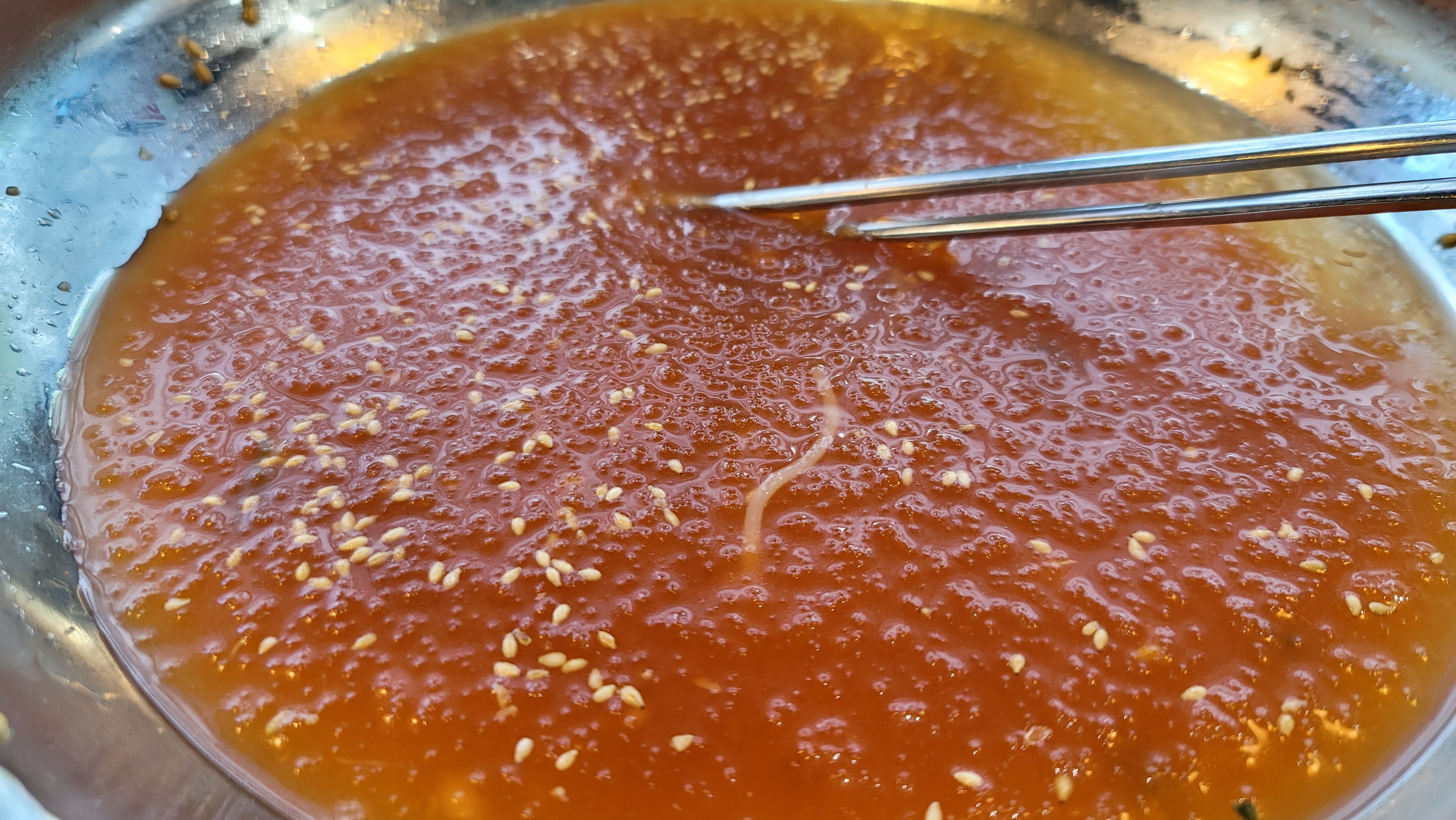 주문하고 주위를 두리번거리는데 온 육수라는 게 눈에 들어옵니다. 소양지를 12시간 이상 끓여 만들었다고 식전에 먹어 보라고 권합니다.