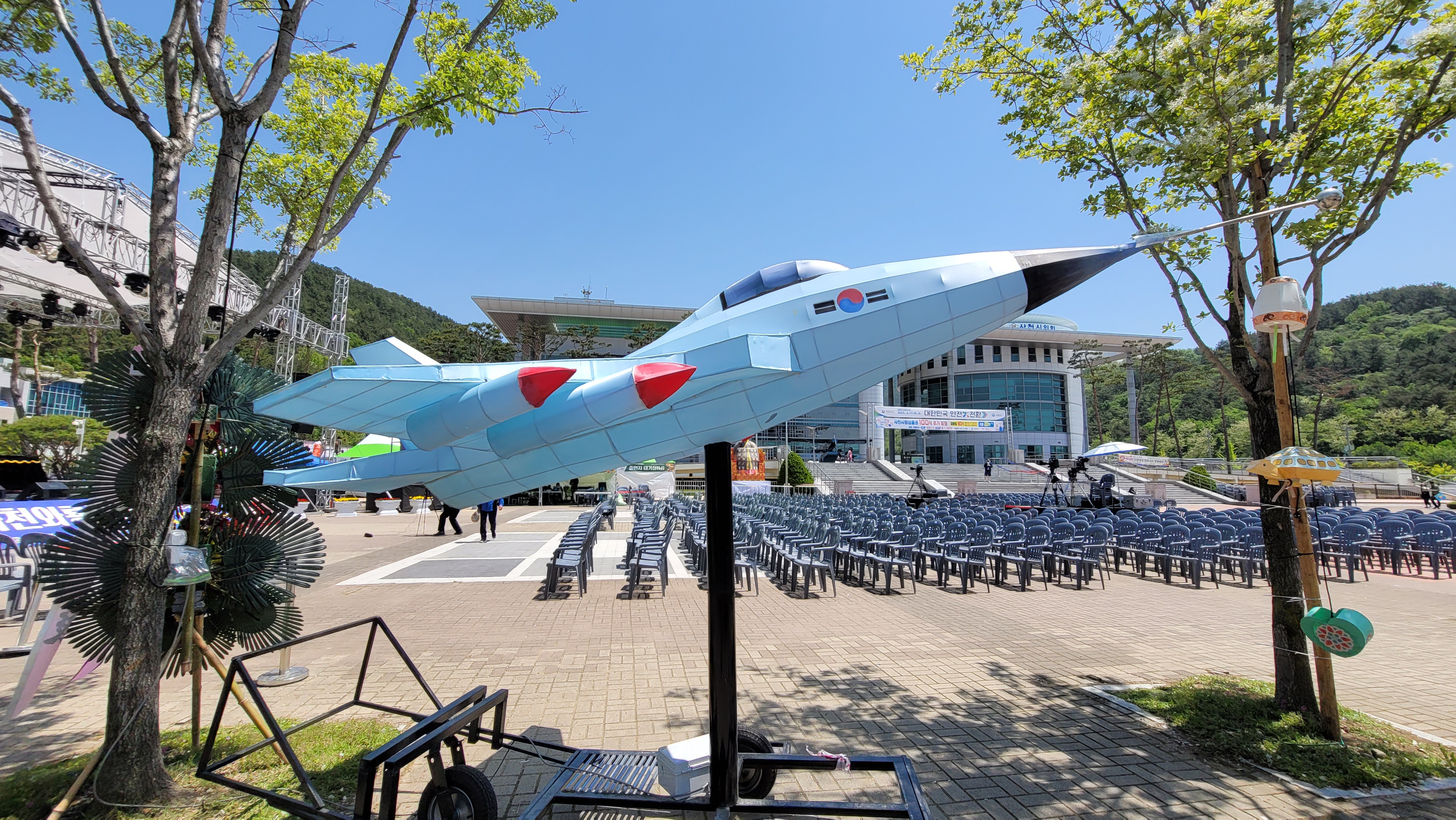 광장에는 하늘을 박차고 나갈 국산 KF-21호 조형물이 우리나라 우주항공산업의 일번지가 이곳 사천임을 떠올리게 합니다. 시청에는 국산 1호기인 재현한 <부활호>가 전시되어 있기도 합니다.