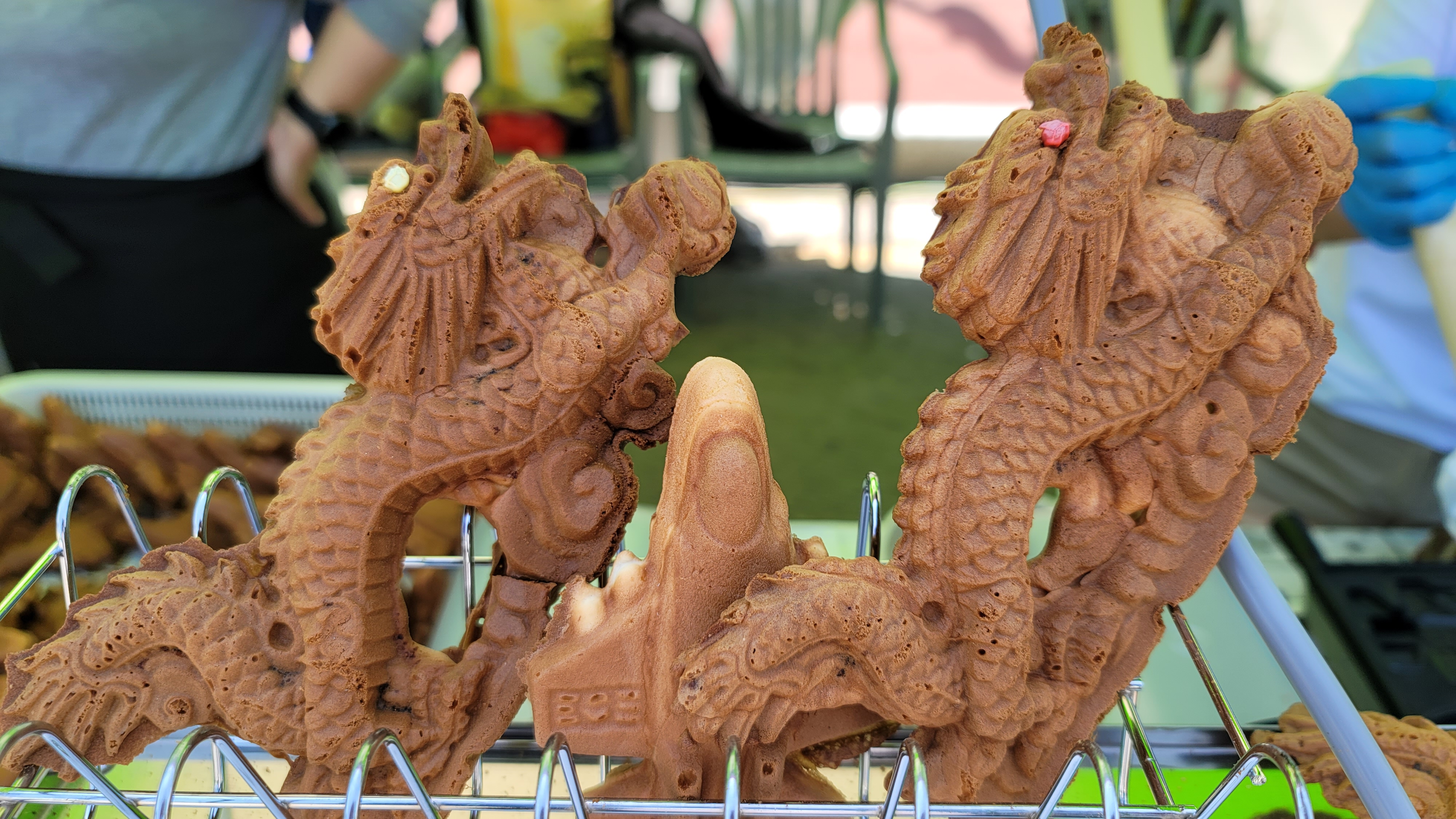 용용카페에서는 축제의 상징이기도 한 용과 지역의 상징인 비행기를 닮은 빵을 팝니다.