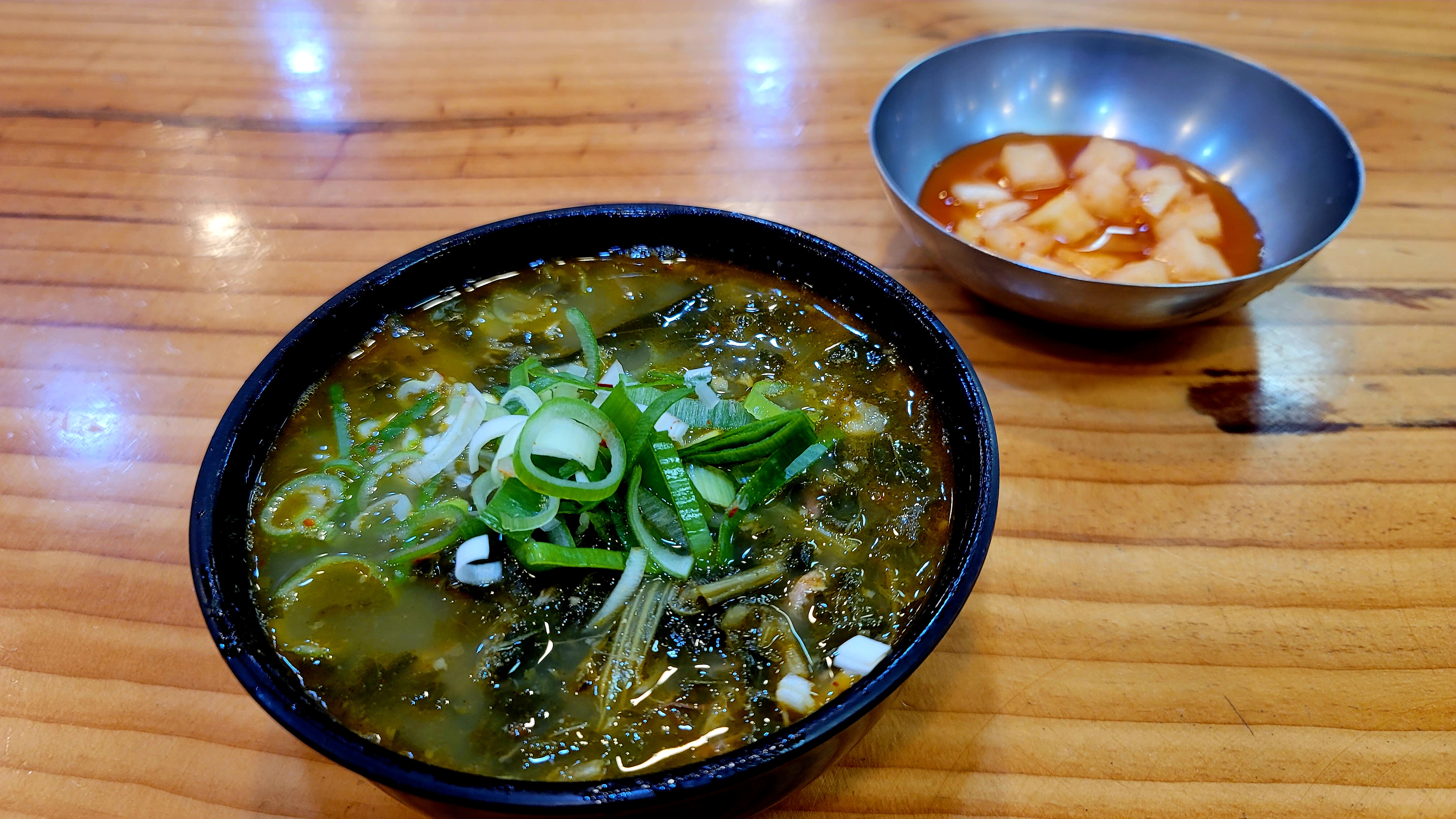 해장국과 깍두기. 단출합니다. 보통 여기서는 숟가락만 사용해 깍두기와 밥을 먹습니다.