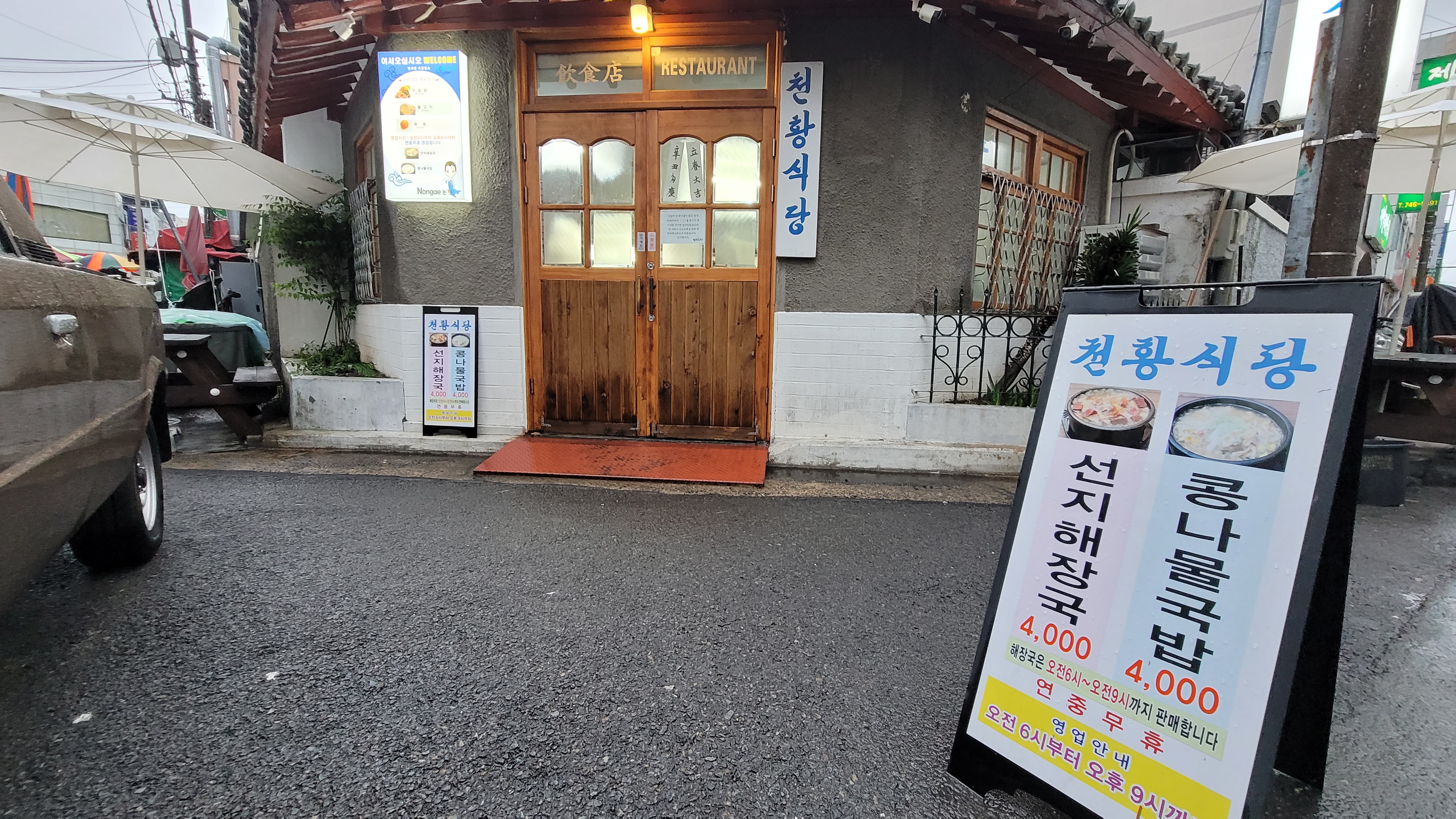 천황식당이 불을 밝혔습니다. 육회비빔밥으로 유명한 식당입니다. 아침에는 선지해장국과 콩나물국밥을 4,000원에 판매합니다.