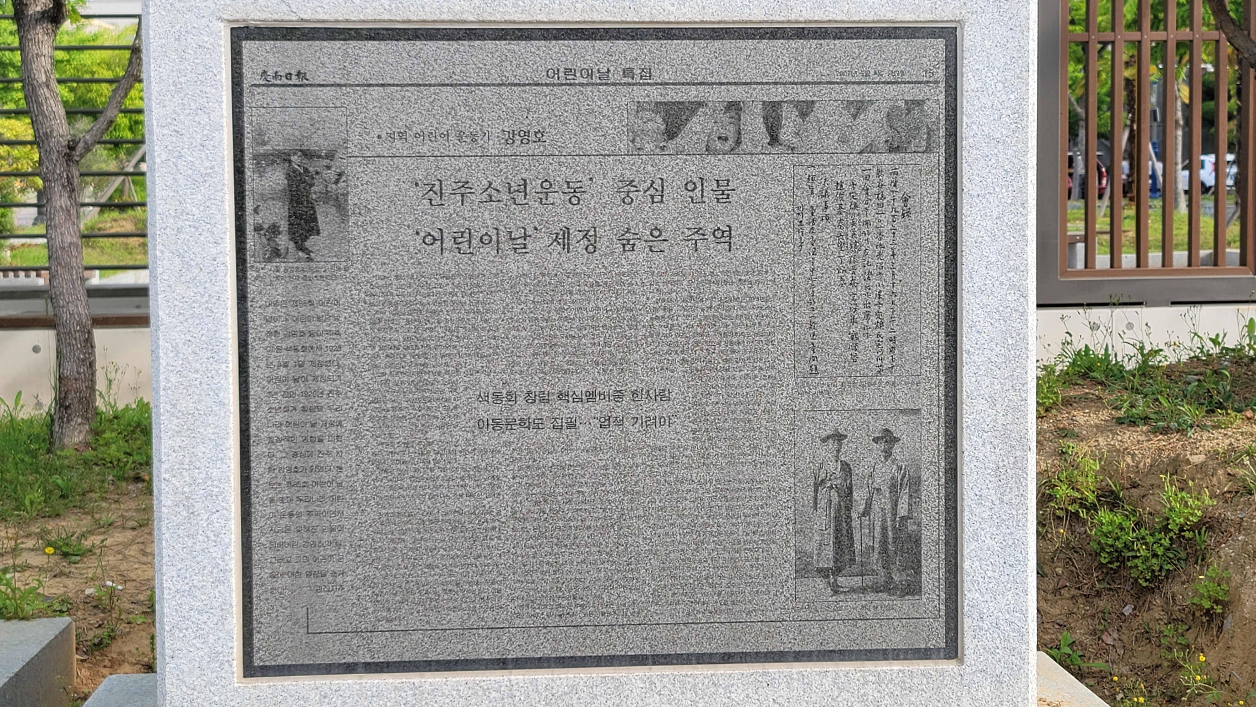 1923년 3월 <어린이> 창간호에서 소파 방정환 선생은 “글방이나 강습소나 주일학교가 아니라 사회적 회합의 성질을 띤 소년회가 우리 조선에 생기기는 경상남도 진주에서 조직된 진주소년회가 맨 처음이었습니다”라고 했습니다. 이를 소개하는 신문기사를 음각한 비가 옆으로 나란히 서 있습니다.