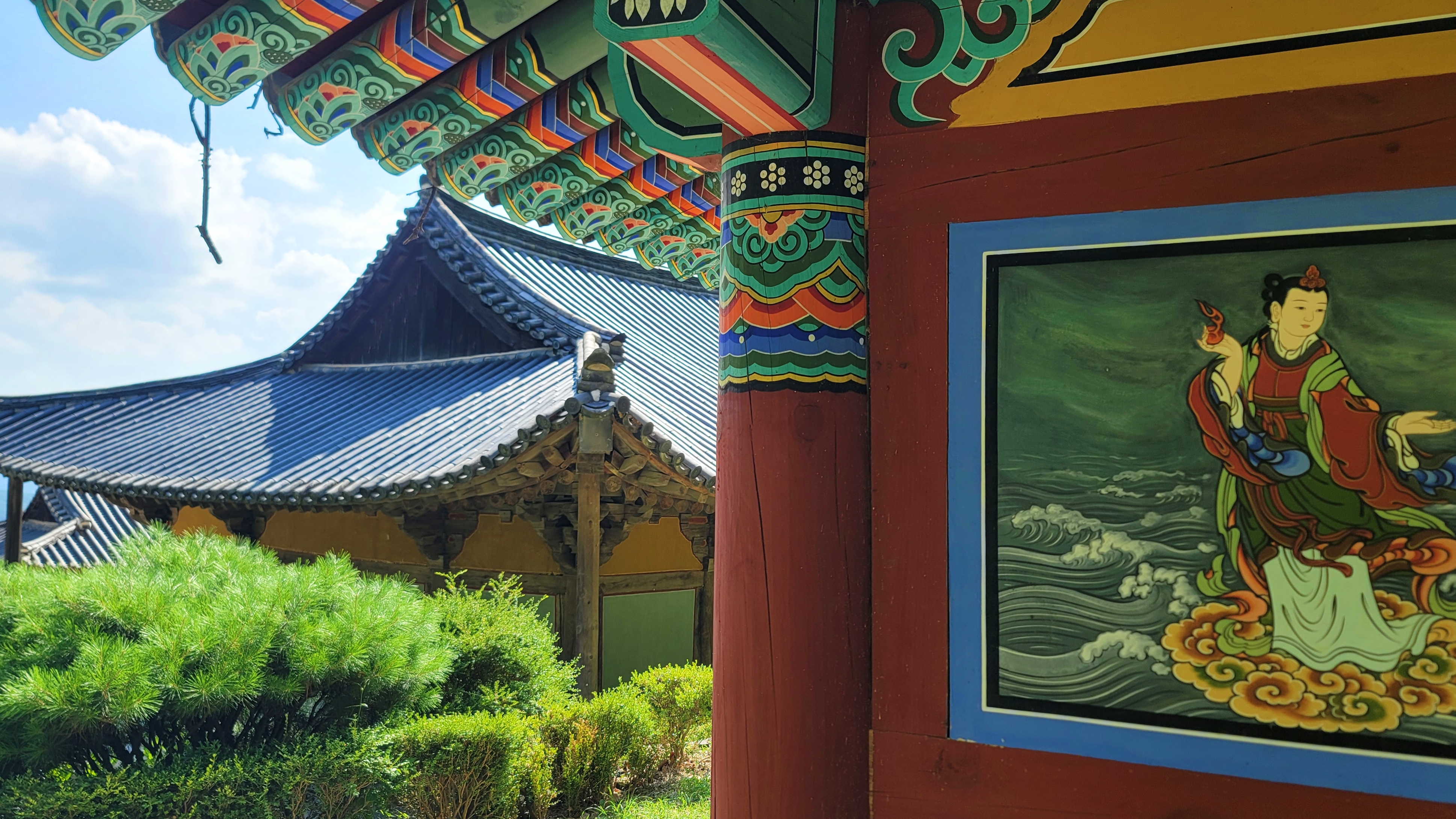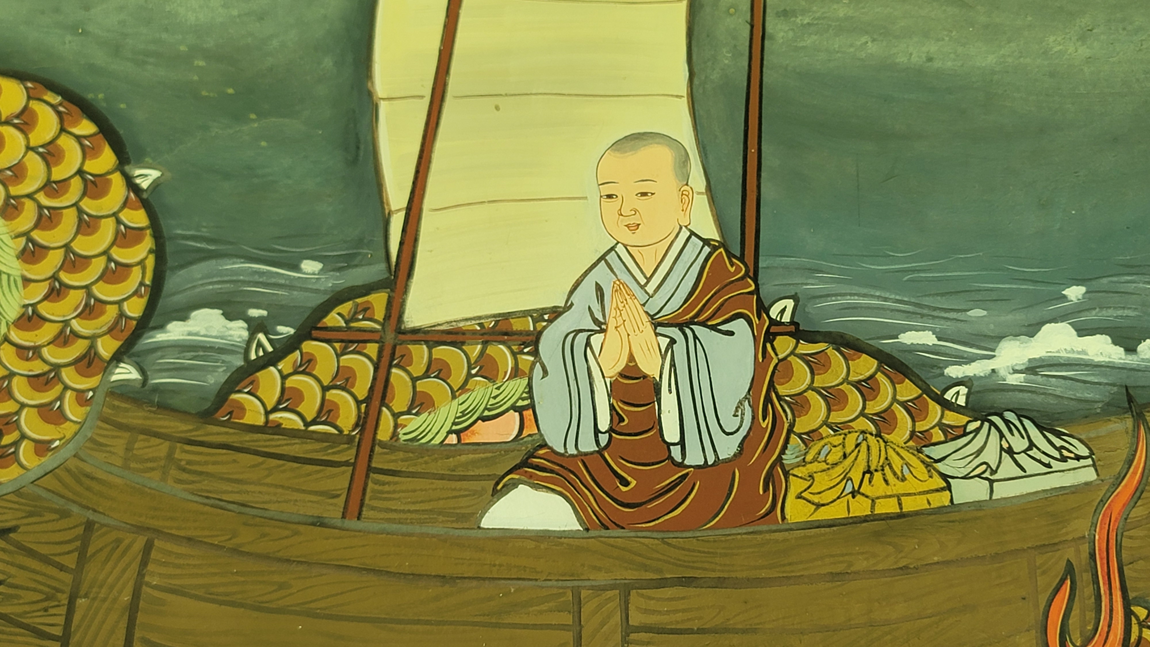선묘각 벽에는 의상대사와 선묘 낭자의 설화를 그린 벽화가 있습니다. 이른바 하숙집 주인 딸과 같은 선묘 낭자가 당나라로 유학 온 의상대사를 혼자 사모했다고 합니다. 그때 의상대사는 37세, 선묘 낭자는 16세. 21살의 나이 차를 떠나 의상대사는 불도에 정진합니다.