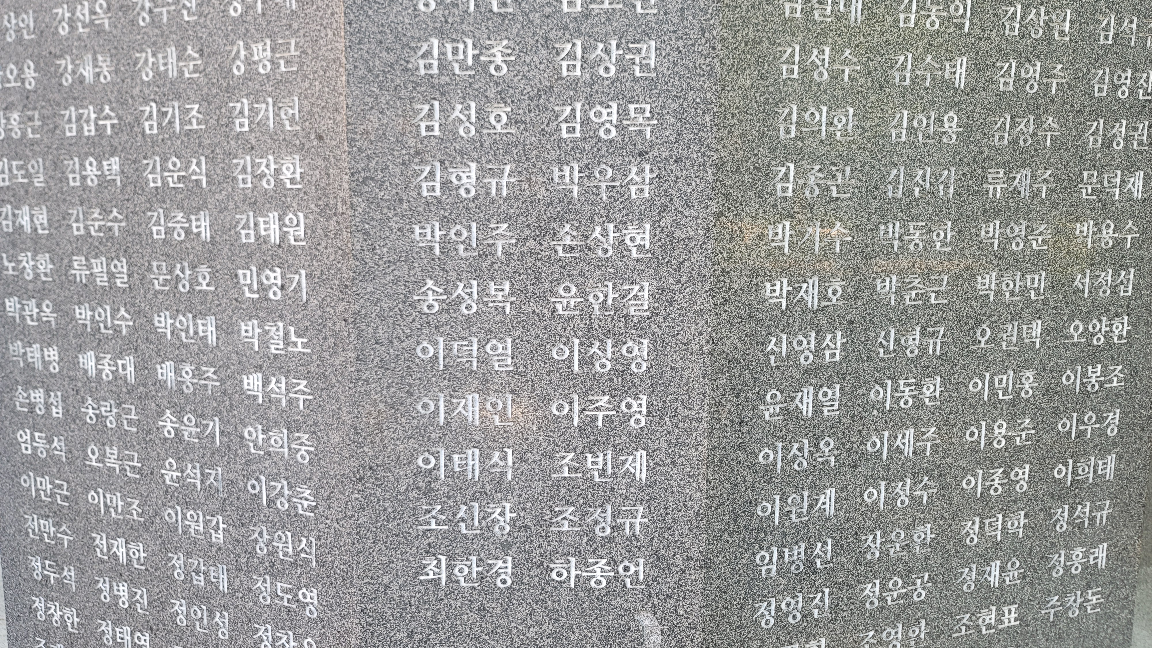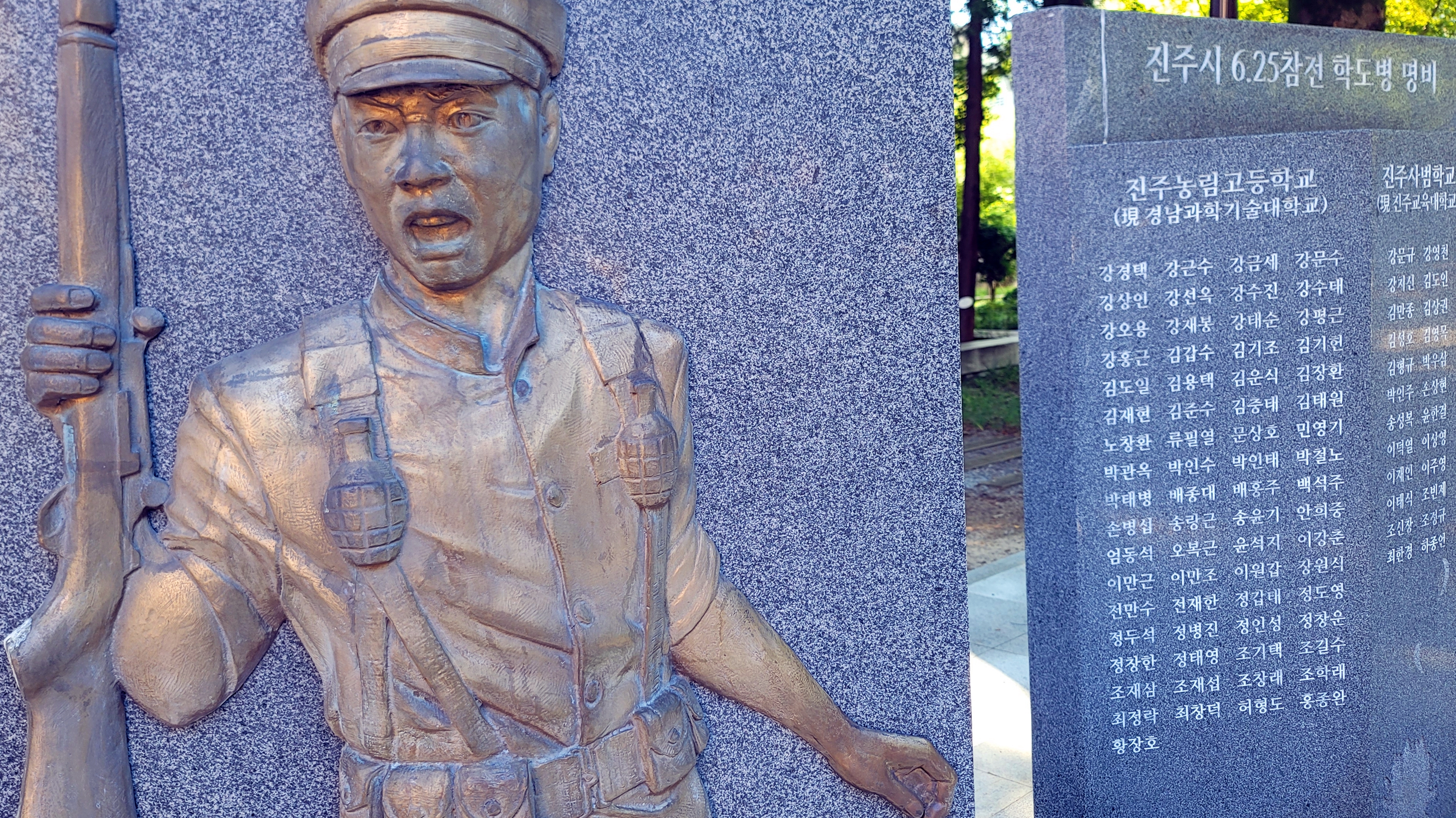 학도병의 모습을 새긴 조각물 옆으로 진주농림고, 진주고, 진주사범대학을 다니다 전쟁이 발발하자 나라를 지키겠다는 일념으로 자원 입대한 학도병 152명의 이름이 학교별로 새겨져 있습니다.