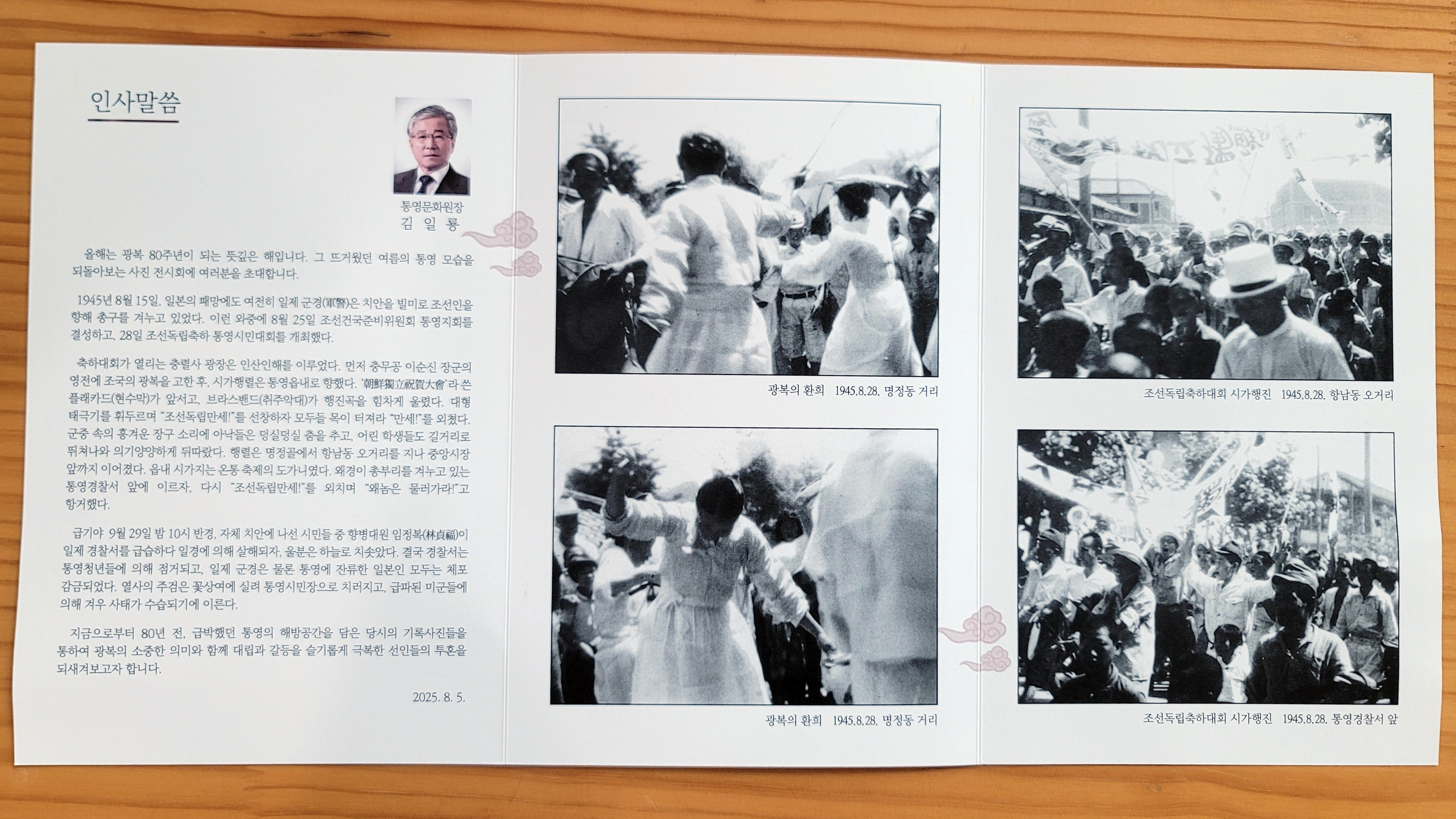 “80년 전 통영의 해방공간을 담은 당시의 기록 사진을 통해 광복의 소중한 의미와 함께 대립과 갈등을 슬기롭게 극복한 선인들의 투혼을 되새겨보자.”라는 김 원장의 전시회 인사말이 예사로 들리지 않습니다.
