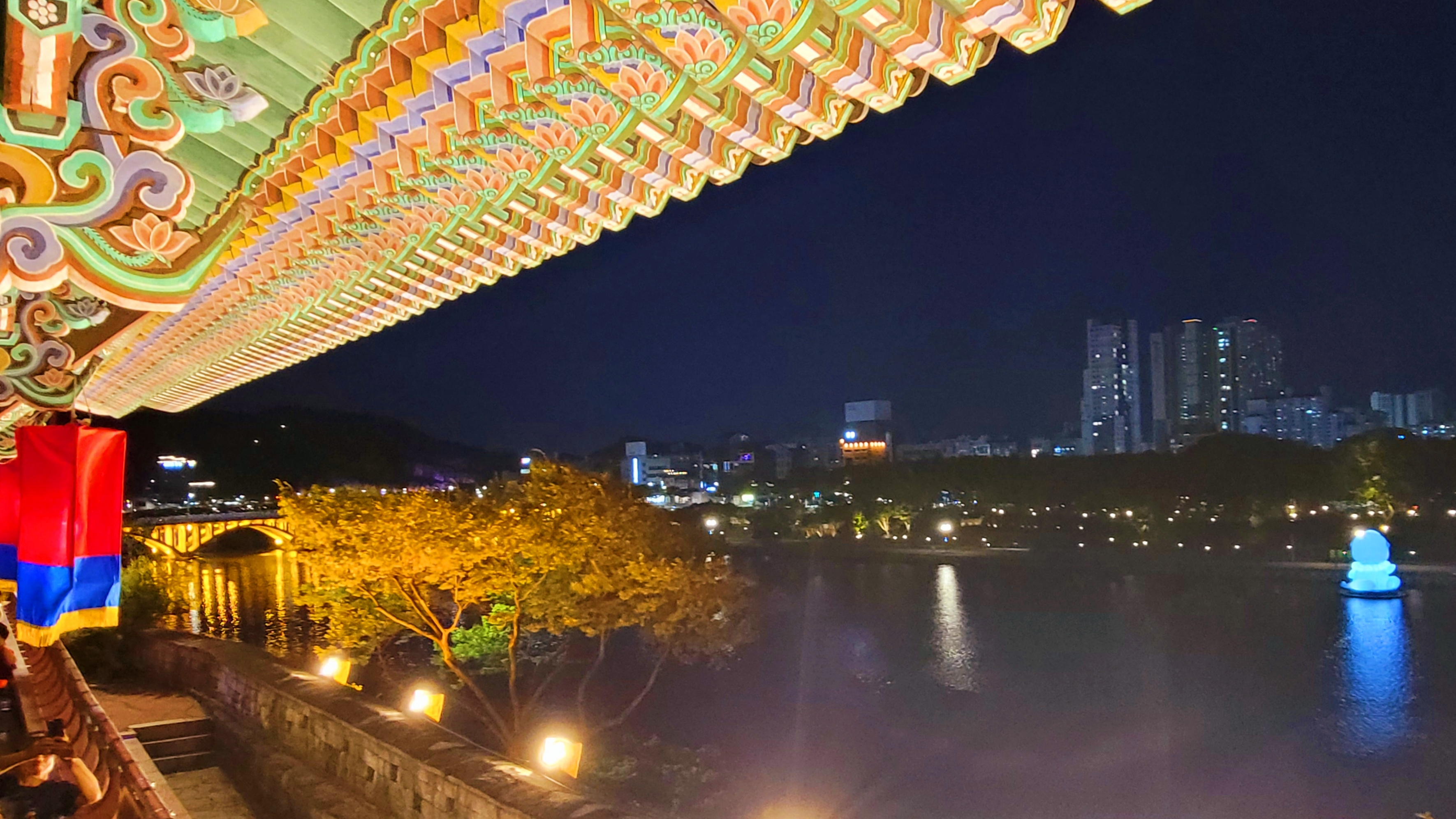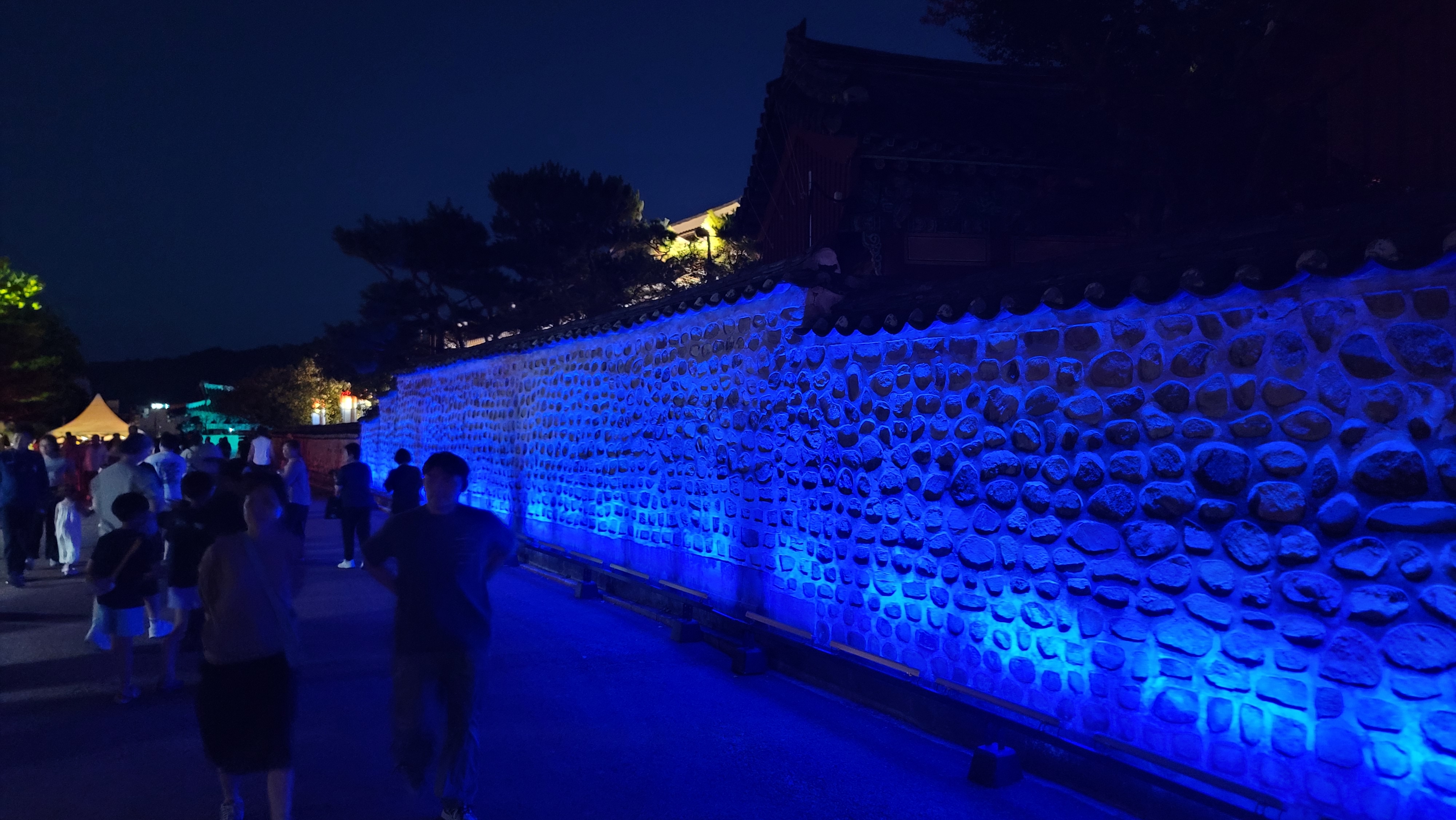 촉석루로 향했습니다. 에워싼 담장이 코발트블루로 시원하게 물들었습니다. 누각 곳곳에 청사초롱이 걸리고 오는 이를 맞습니다.