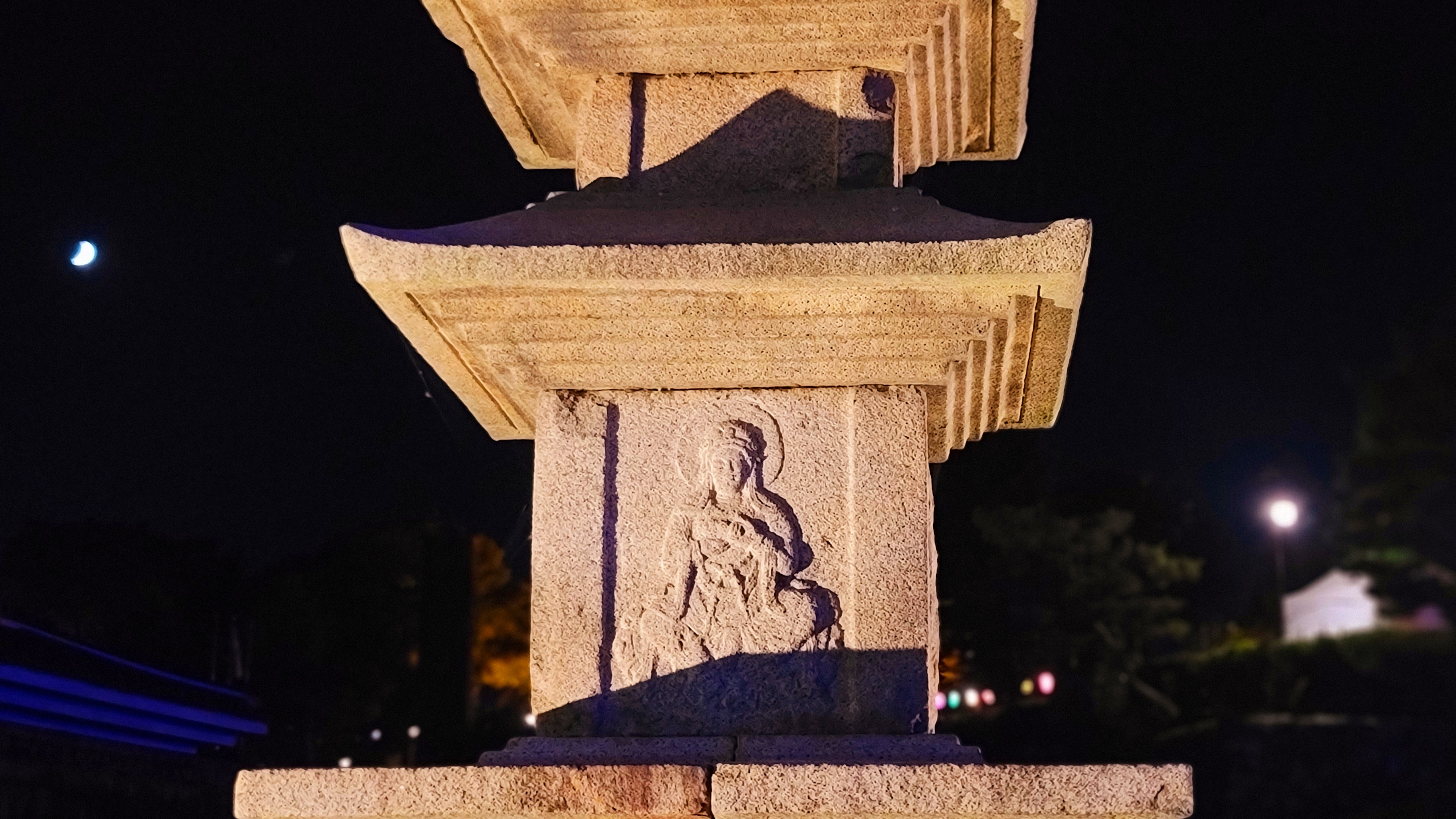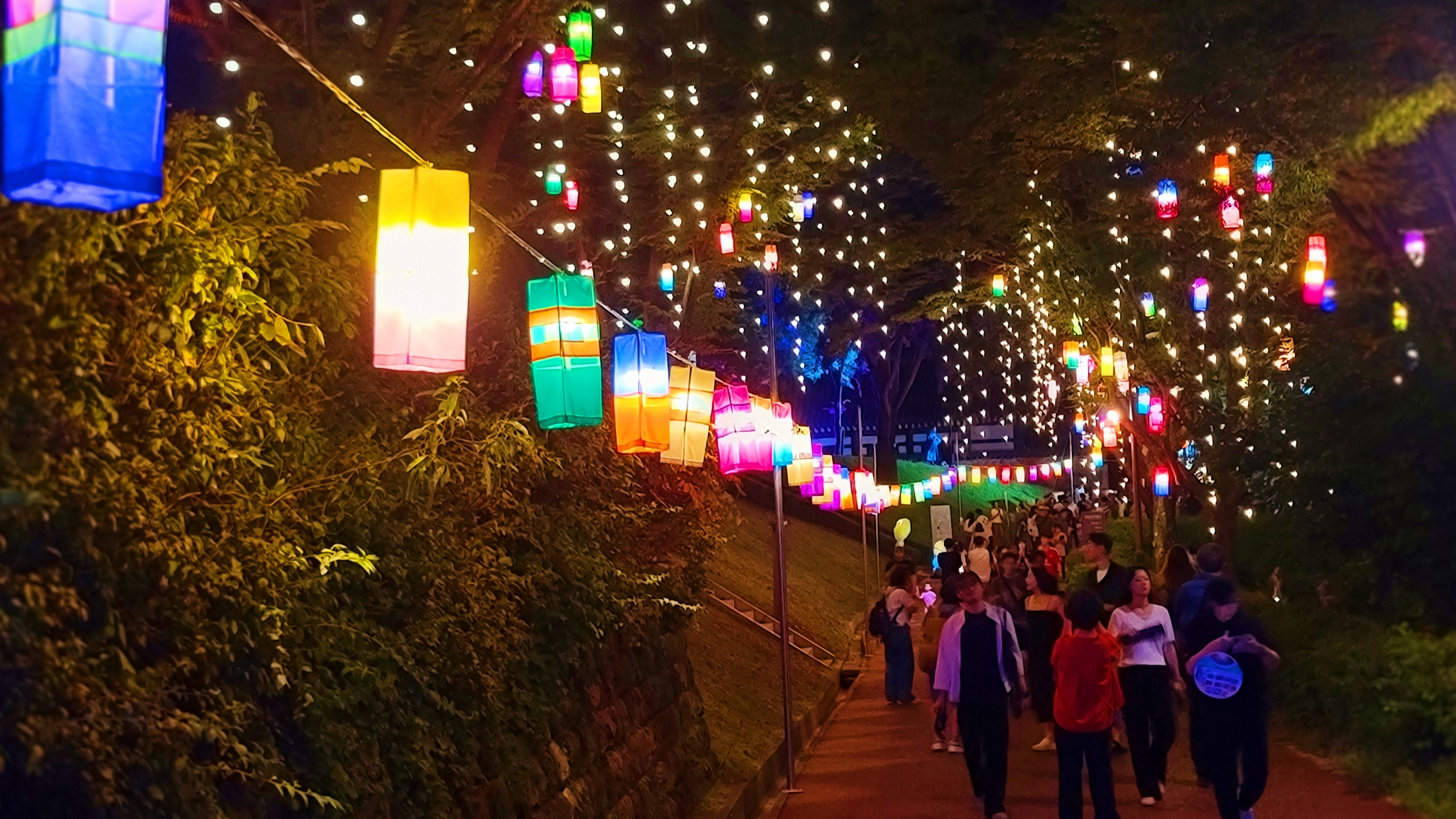석탑을 지나 진주성 북쪽 성곽으로 향하자 고운 빛들이 쏟아져 내려옵니다. 햇살에 비친 은빛 윤슬처럼 반짝이는 불빛들…. 덩달아 일상 속 찌꺼기를 화려한 불빛에 씻는 듯 개운합니다.