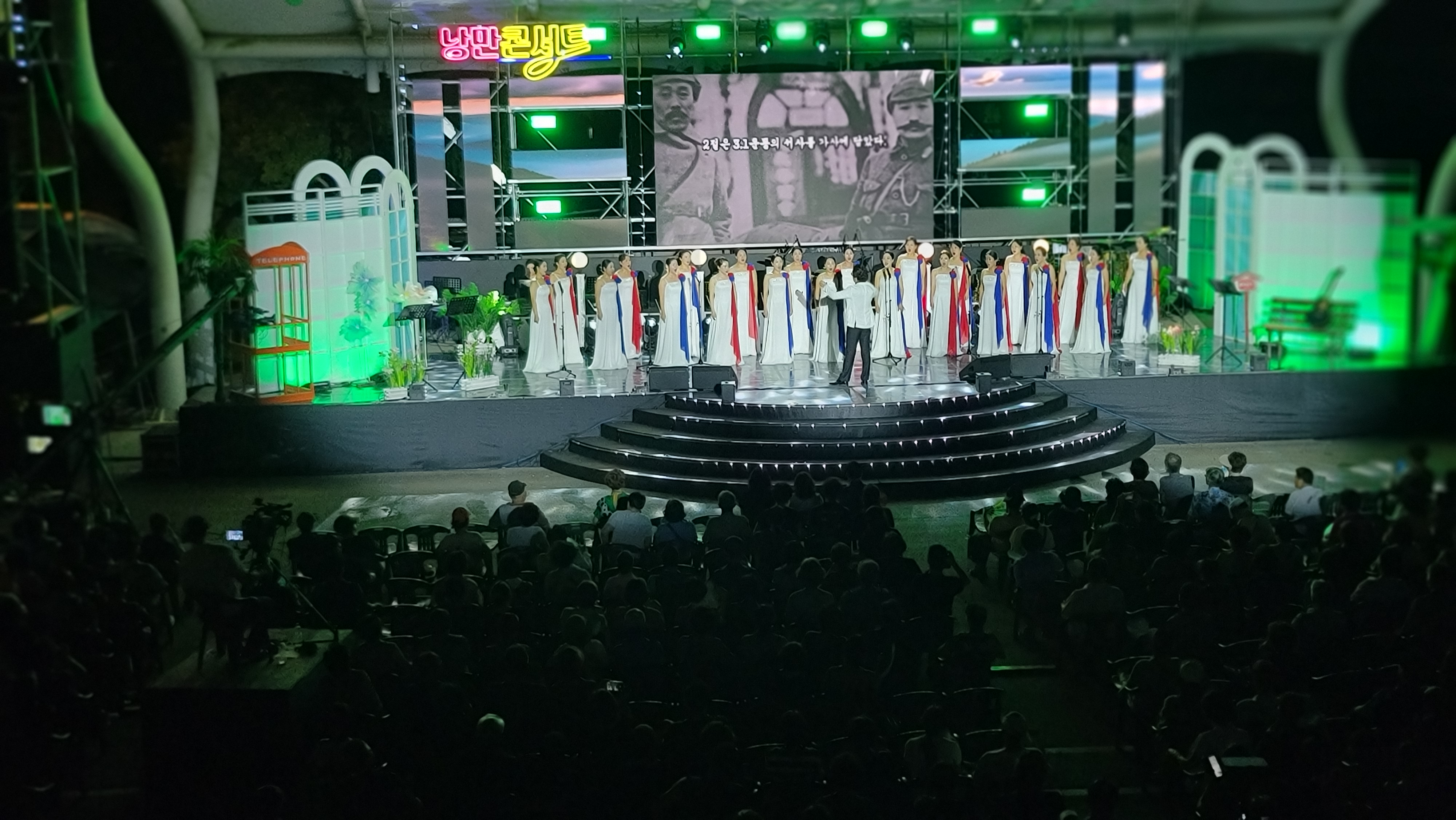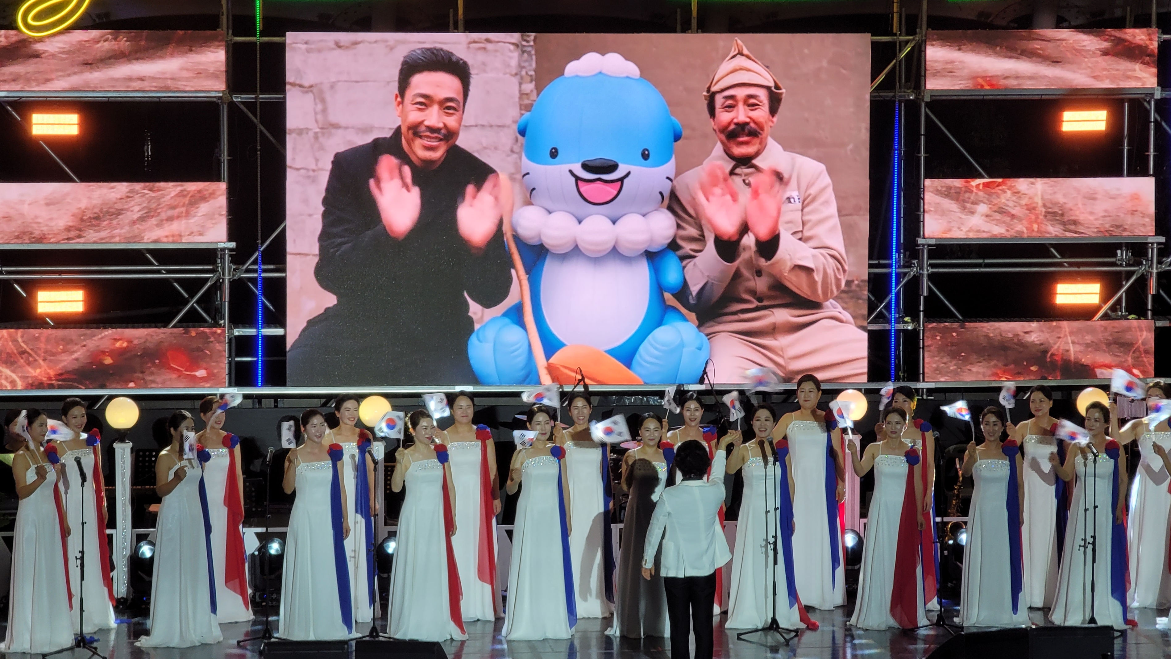 어둠이 깔리고 조명이 들어오자 사회를 맡은 한승완 MC의 재담으로 즐겁게 웃으며 시작합니다. 후니용이, 두 명의 트로트 가수가 나와 ‘여행을 떠나요’를 부릅니다. 덩달아 오늘 이 자리를 함께 이들이 모두 광복의 기쁨으로, 80년전 그날로 시간여행을 떠납니다.