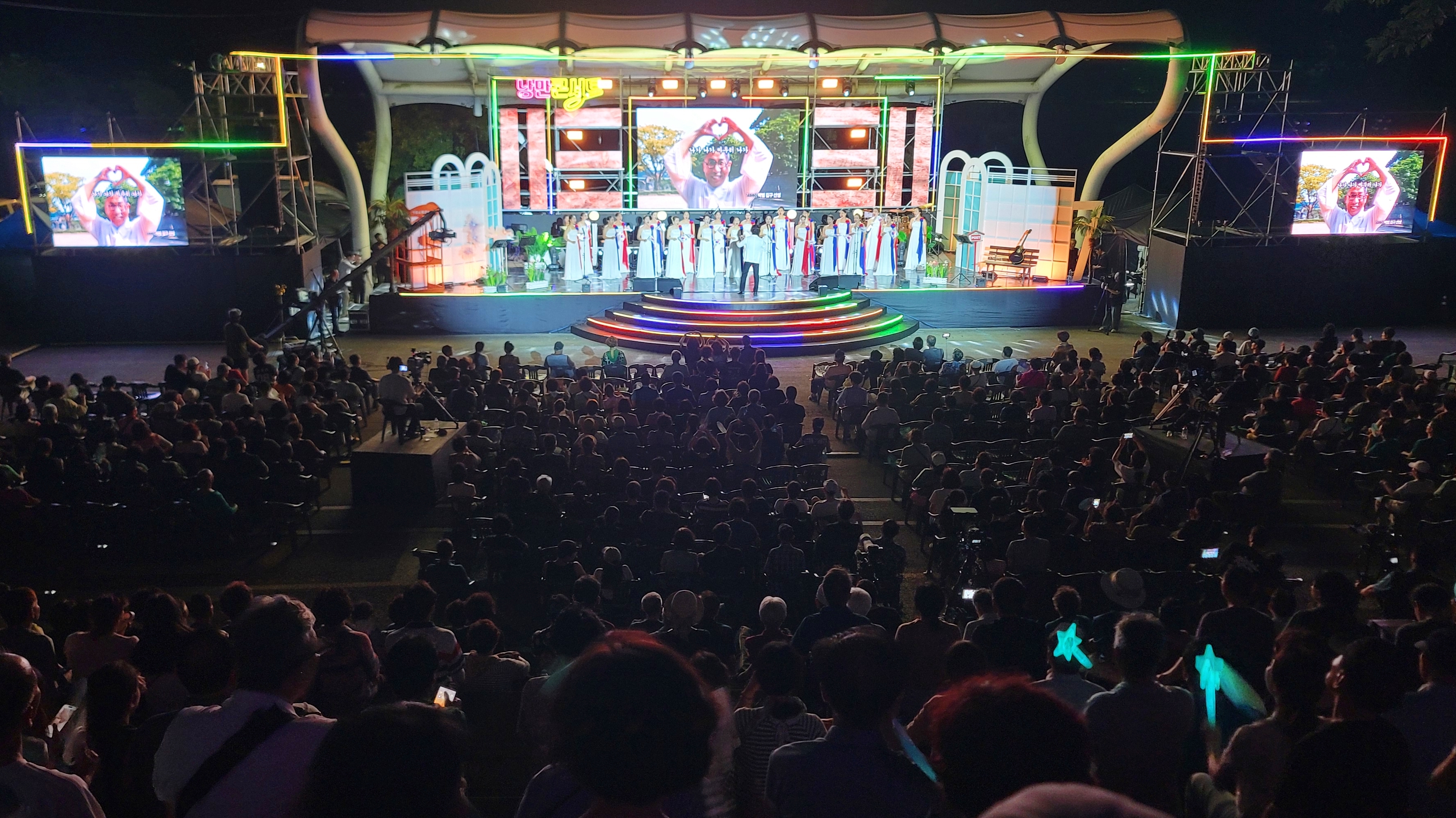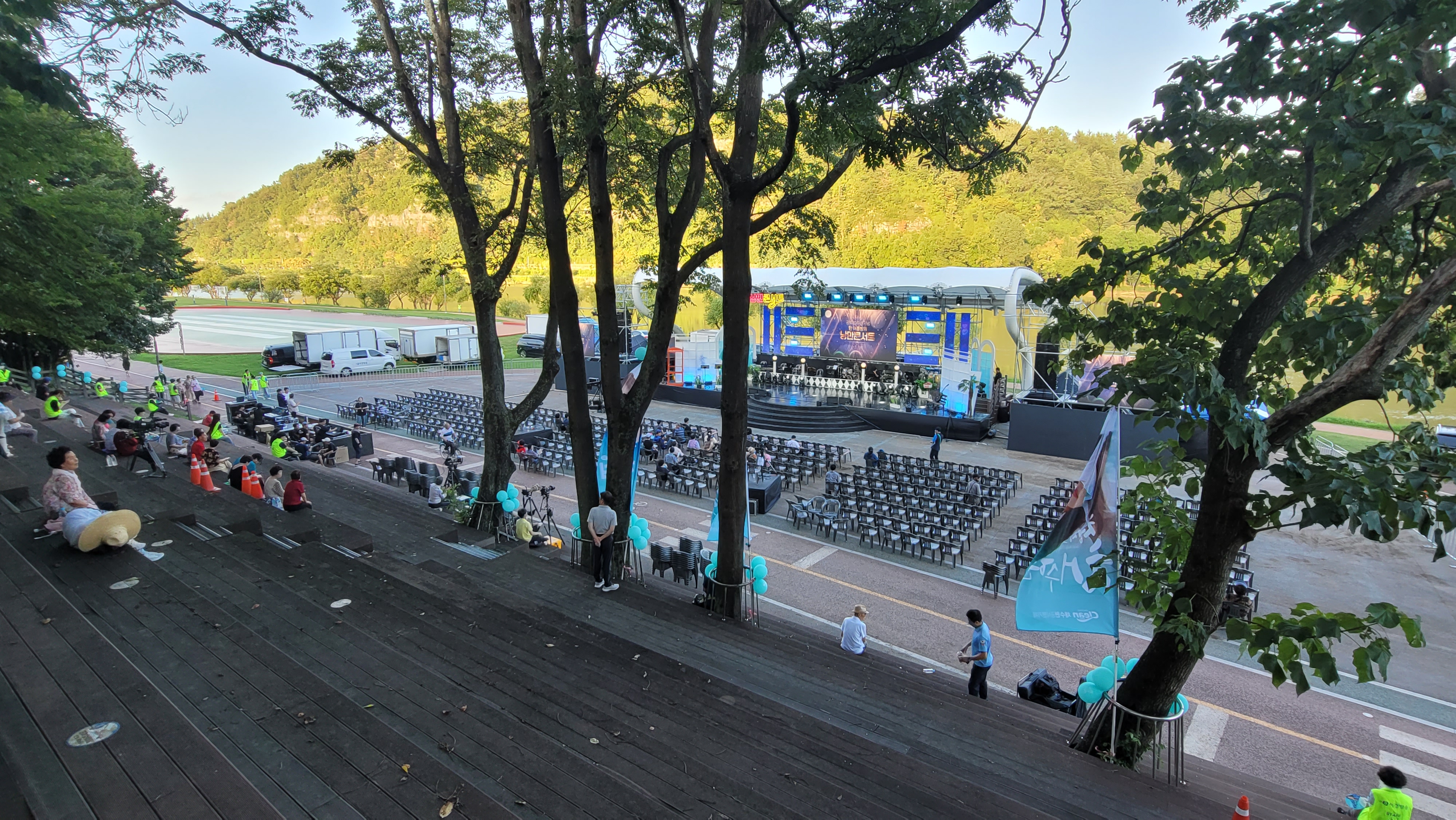 진주 지역 가수 채수현 팬클럽들이 벌써 여기저기 풍선을 달고 오가는 이들에게 부채를 나눠줍니다. 덕분에 객석에 앉아 멍때리듯 남강 속에 하나의 풍경처럼 다가서는 사람들을 구경합니다.