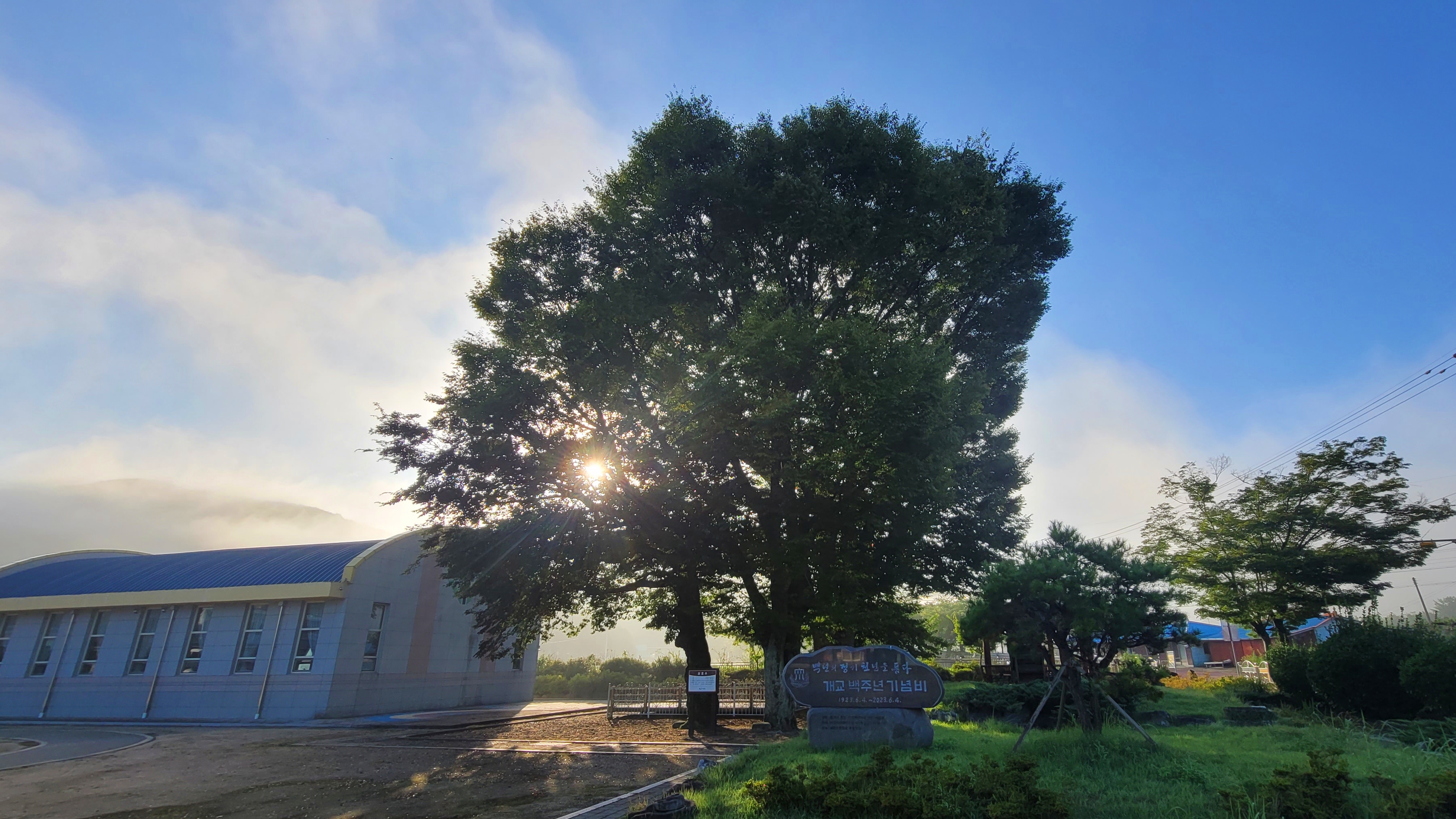 담벼락 시멘트 블록 사이로 난 학교 모습이 정겹습니다. 학교 정문 옆 개교 백 주년 기념비 뒤에는 아름드리나무가 세 그루가 있습니다.