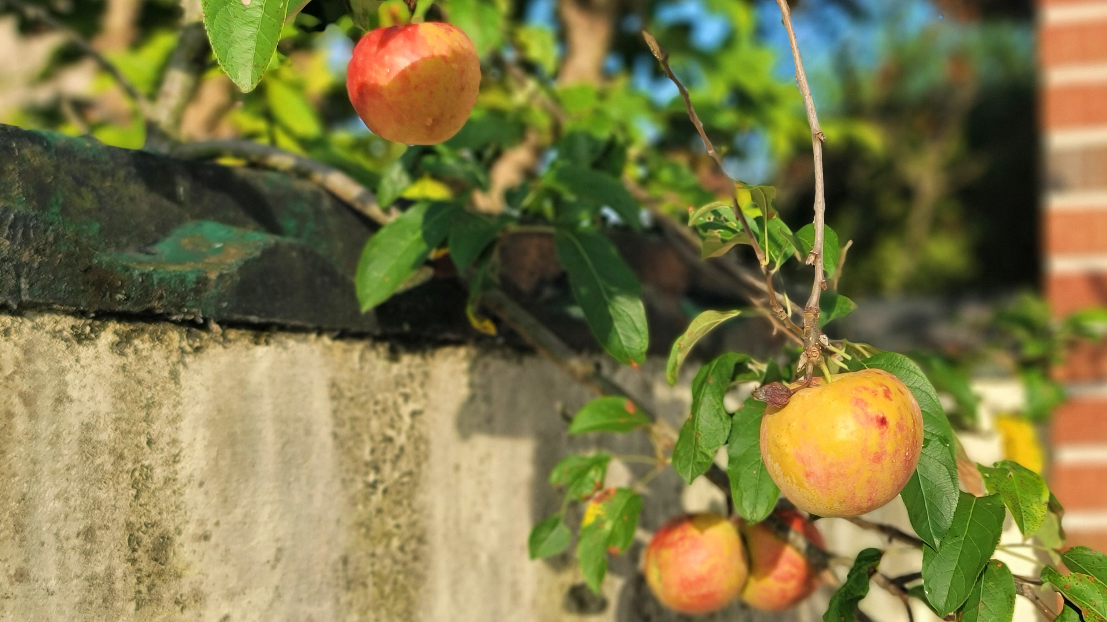 골목 담장 너머로 햇살에 빛나는 사과들이 주렁주렁 반갑게 인사를 건넵니다.