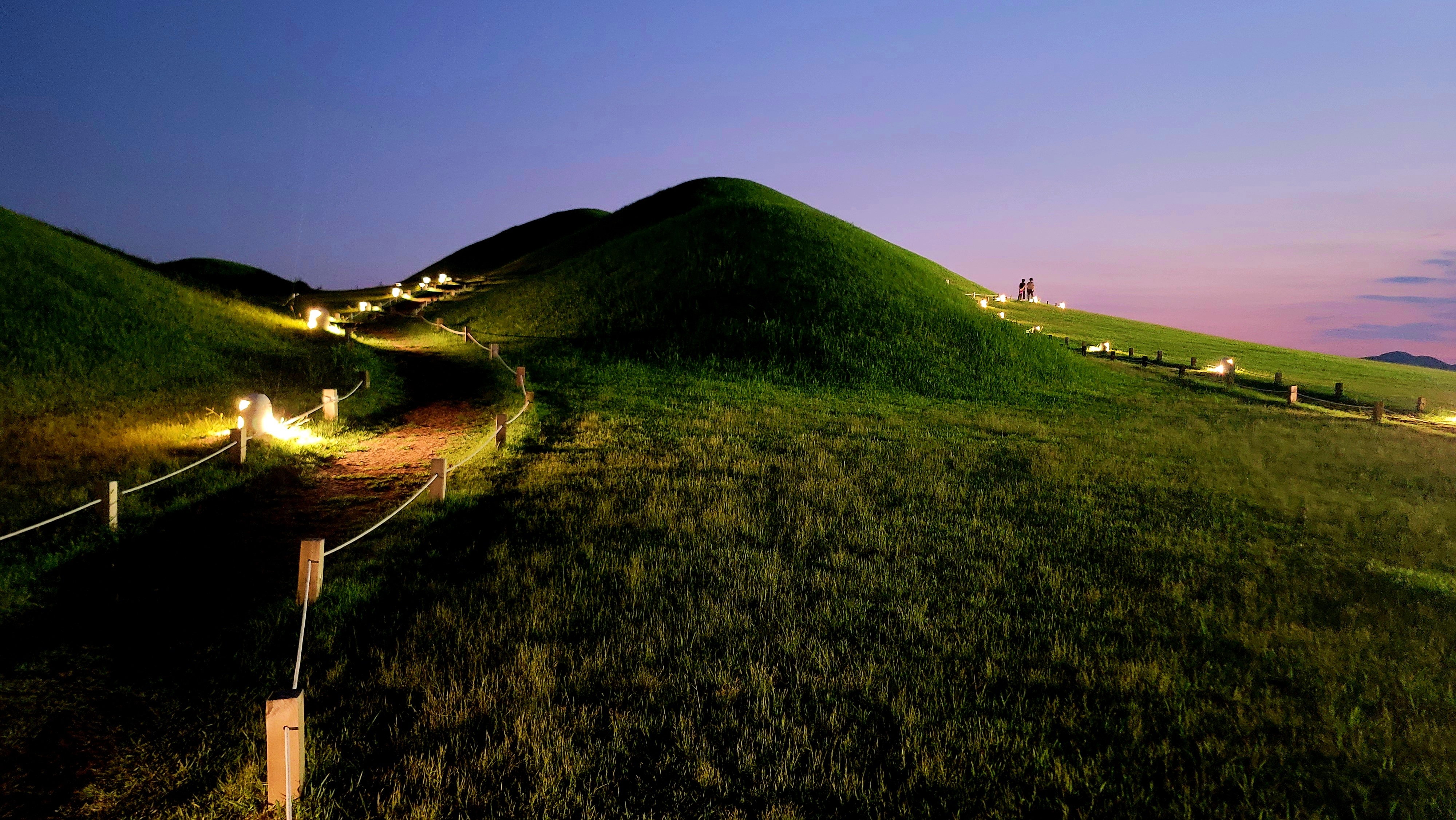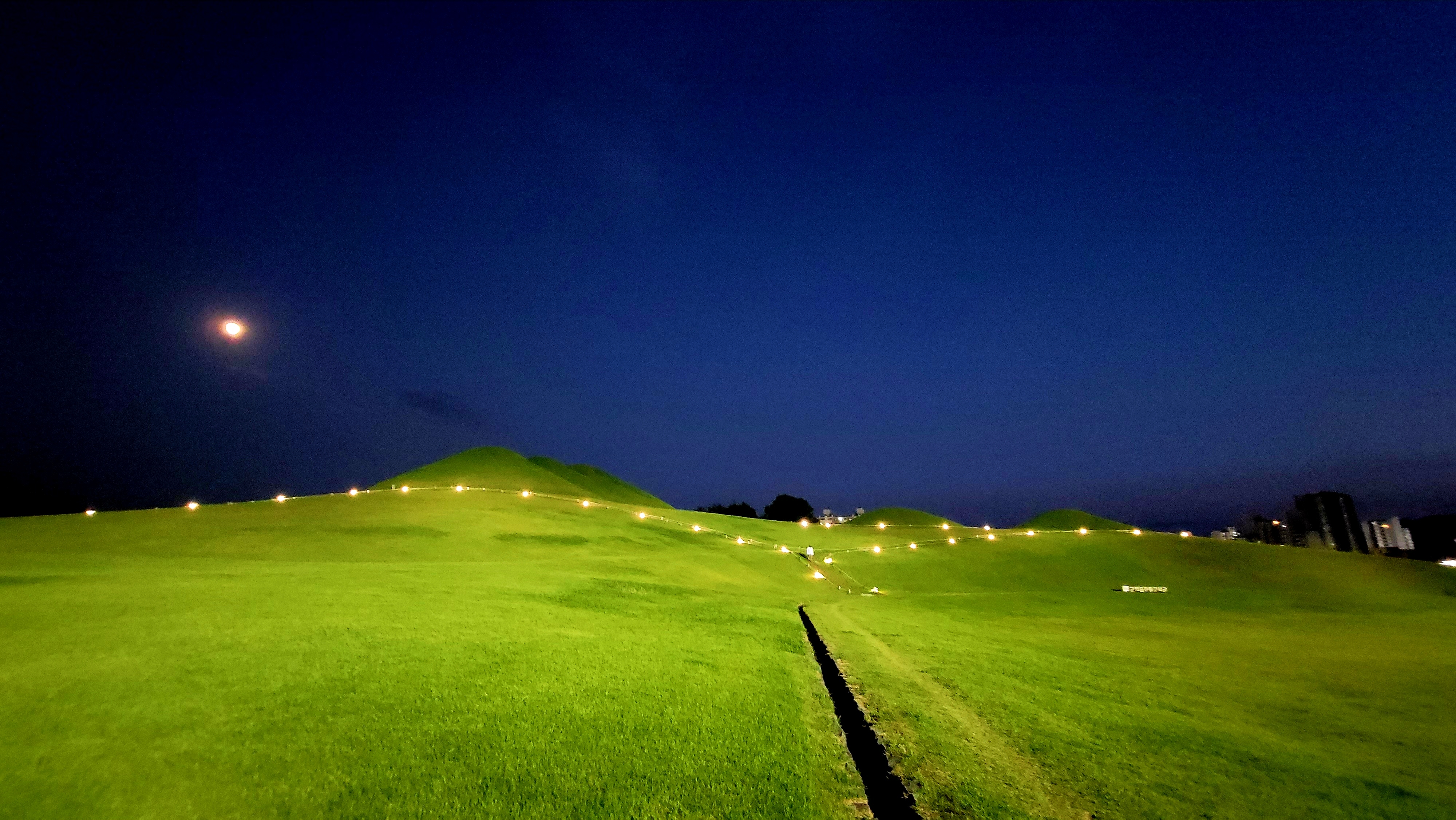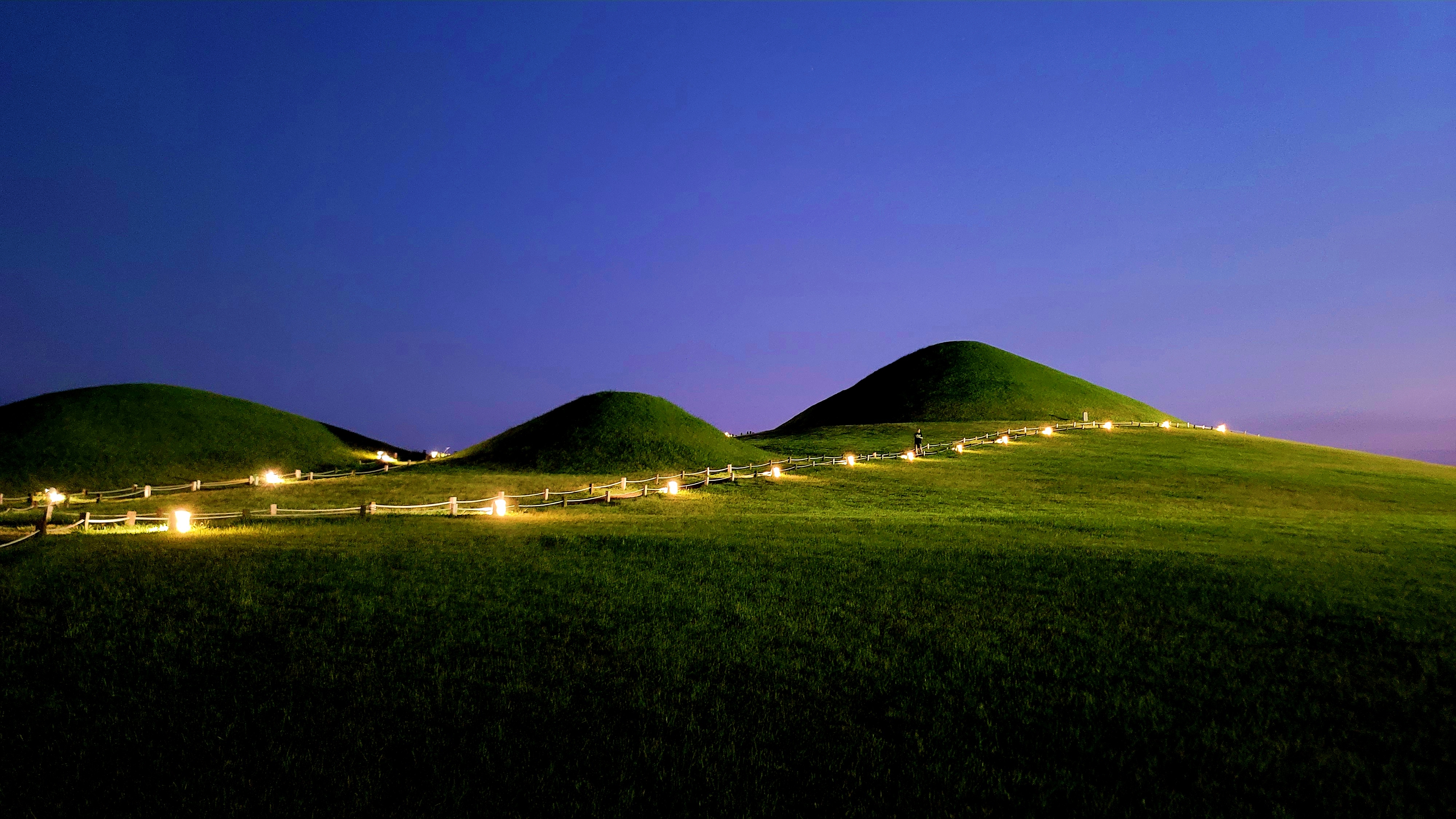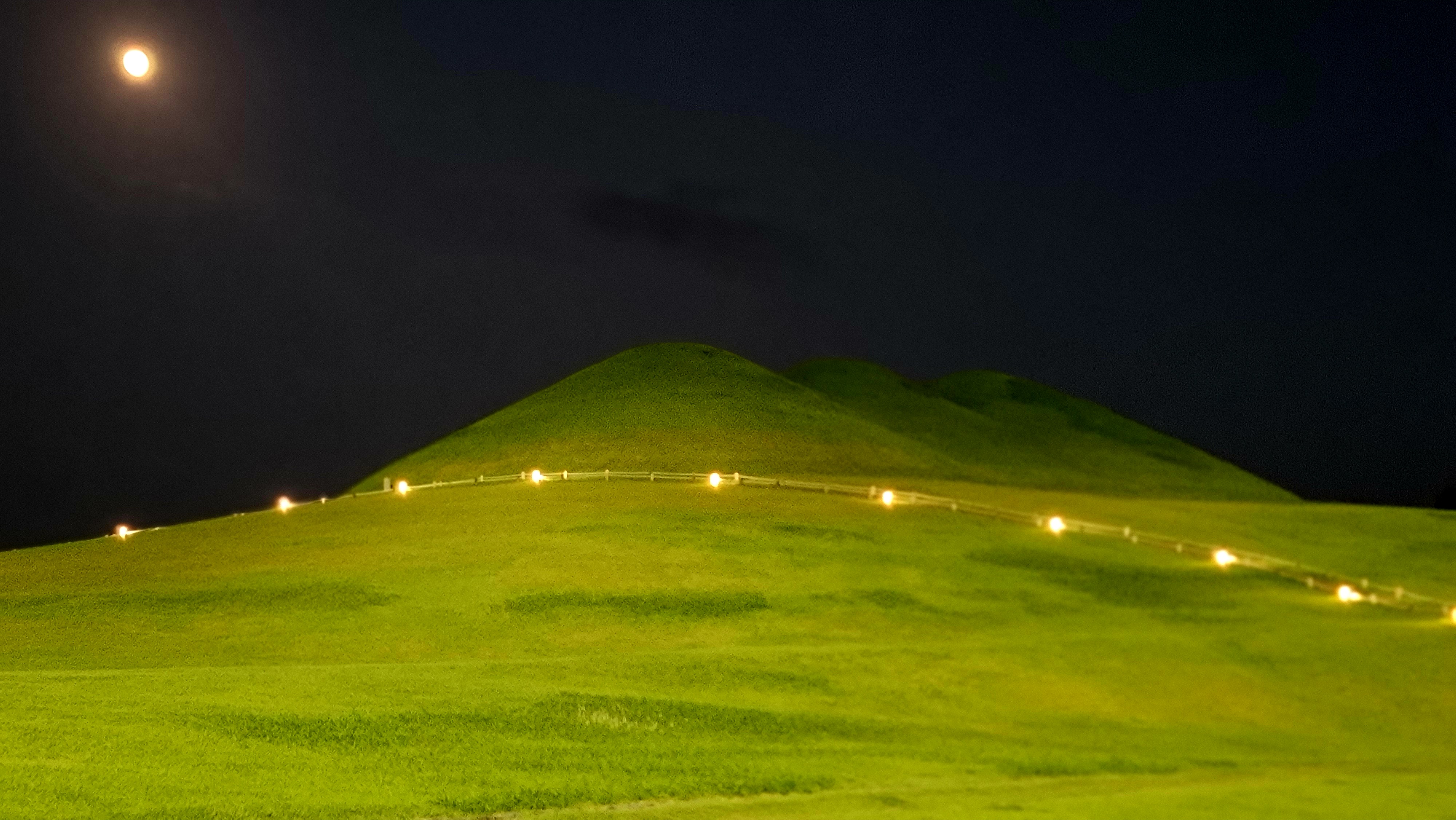 오후 7시쯤. 서치라이트가 고분군을 비춥니다. 덩달아 고분군을 따라 청사초롱처럼 조명이 하나둘 불을 밝힙니다.