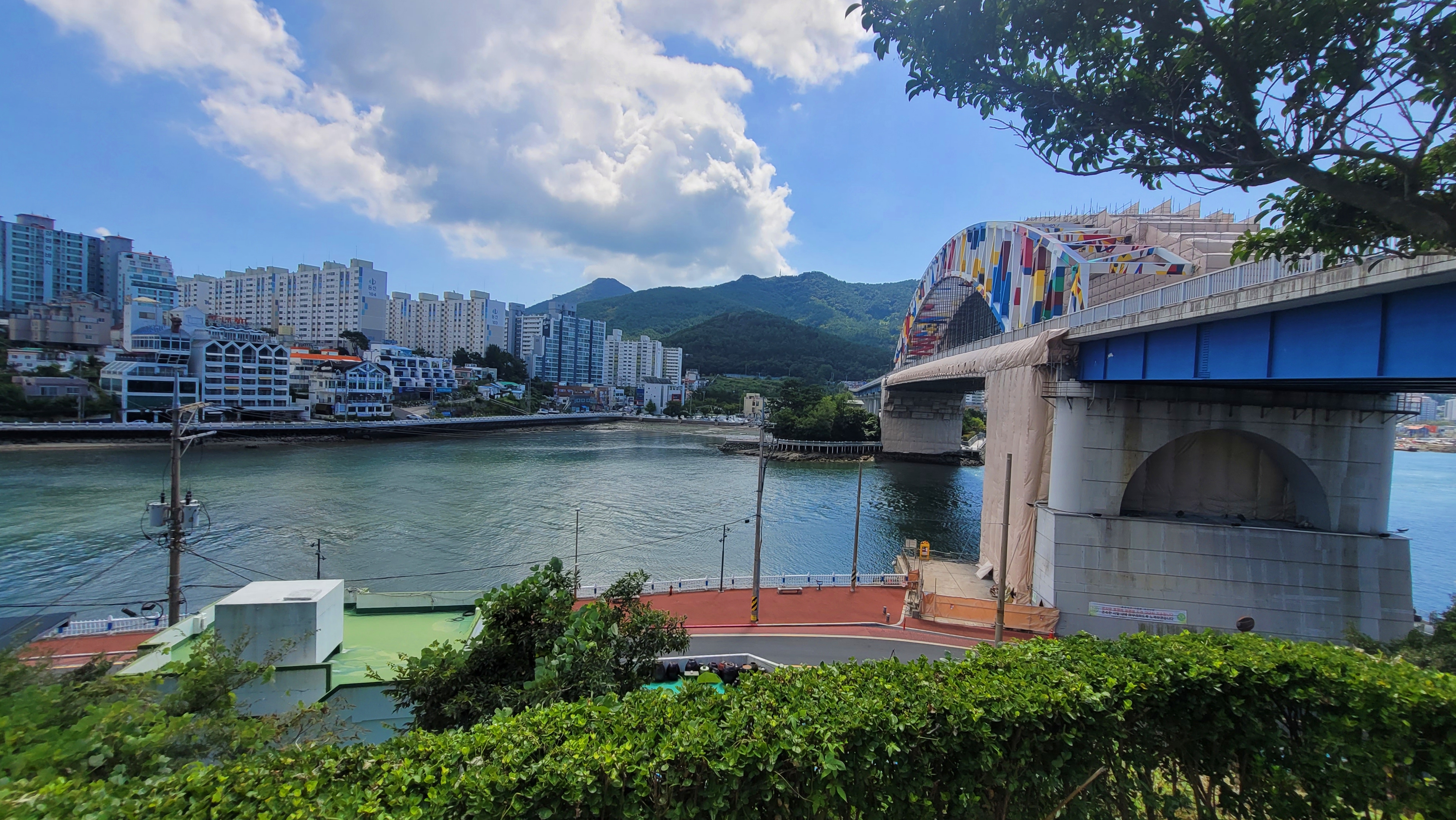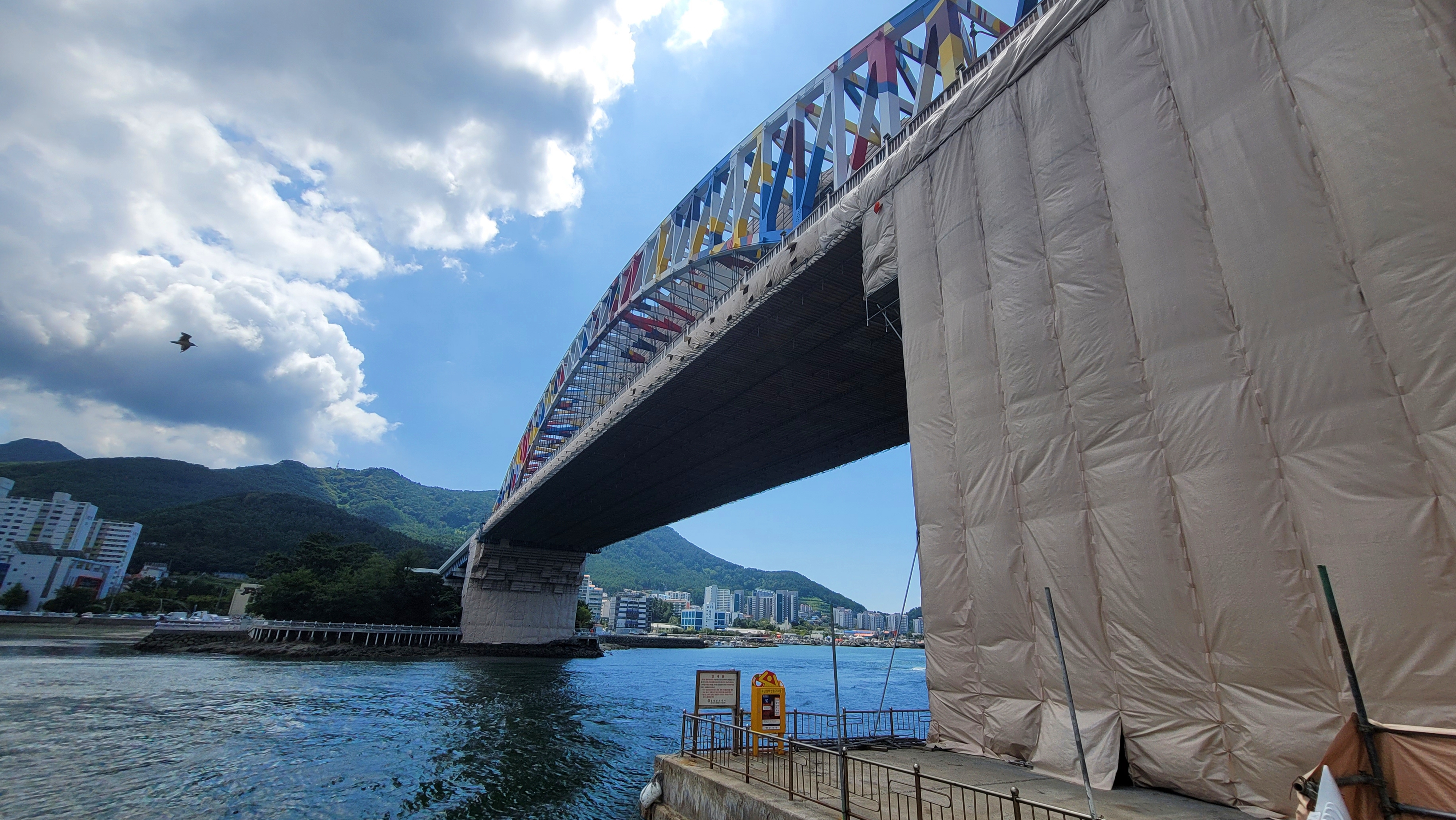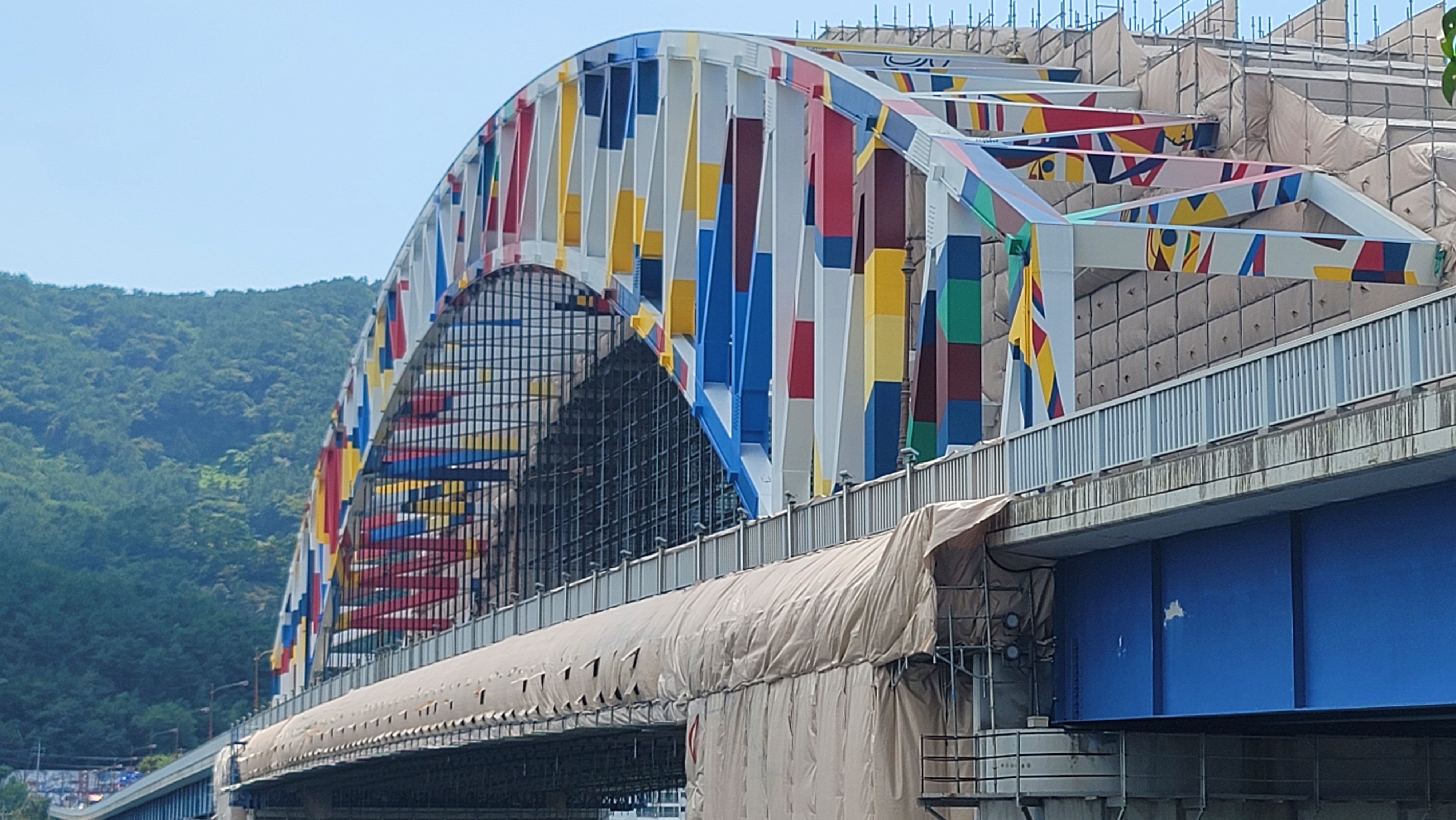 상판 아치 위에 살짝살짝 모습을 드러낸 모양새가 귀엽습니다. 색동옷을 입은 듯 보이기도 합니다. 나름의 짐작으로 전혁림 화가가 오방색으로 표현한 <통영항>이 다리에 재현될 듯합니다. 어떤 옷차림으로 다가올지 벌써 궁금합니다.