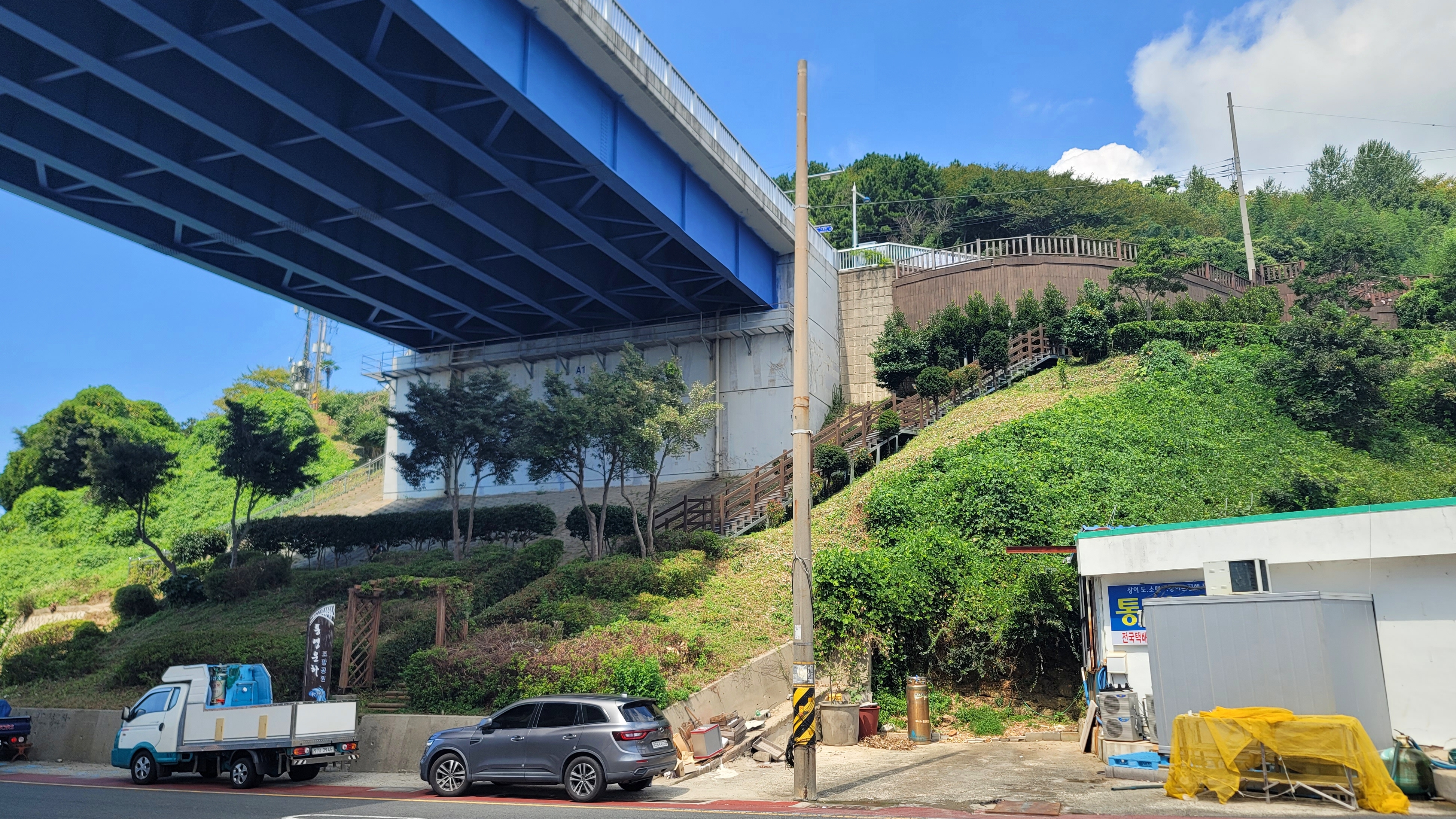 숨을 고르고 공원에 오릅니다. 전망대에 섭니다. 햇볕이 뜨겁습니다. 볕을 가려줄 양산 같은 그늘이 없어 아쉽습니다. 일부 나무데크도 손을 봐야 합니다.