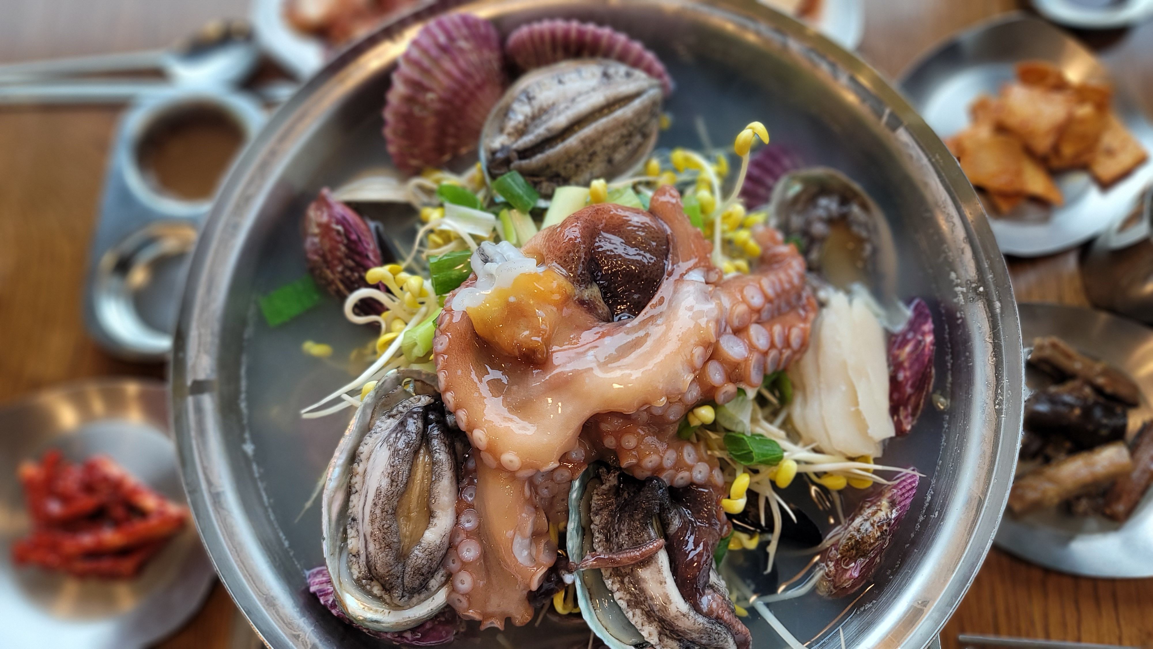 입맛을 다시자 큰 대야 같은 그릇에 낙지를 비롯해 전복 등이 한가득 든 채로 왔습니다.