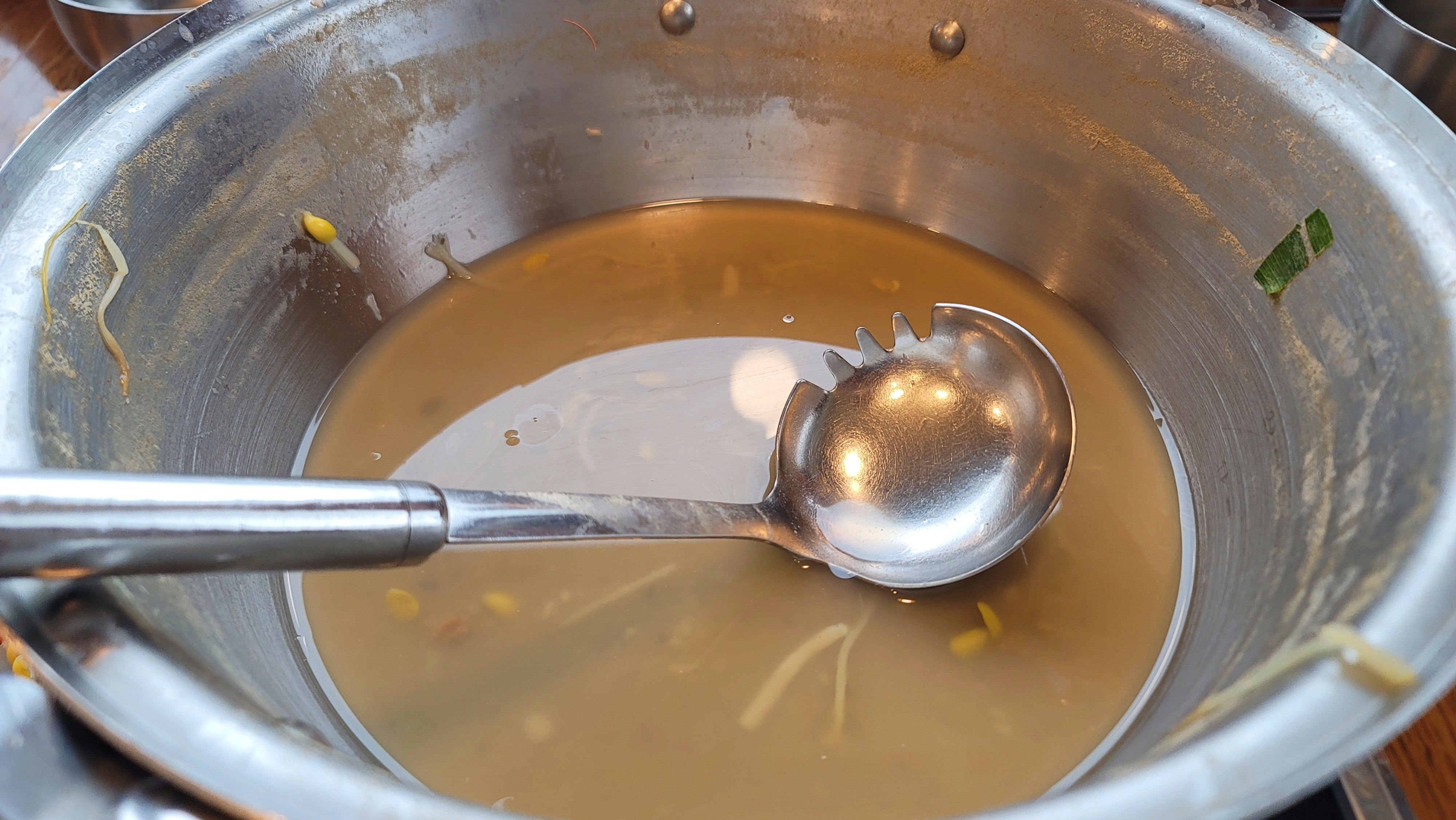 맑은 국물에 곁들입니다. 다시금 불을 올리자 넓은 대야 같은 그릇은 열기를 마치 기적소리처럼 거품을 만들며 토해냅니다.