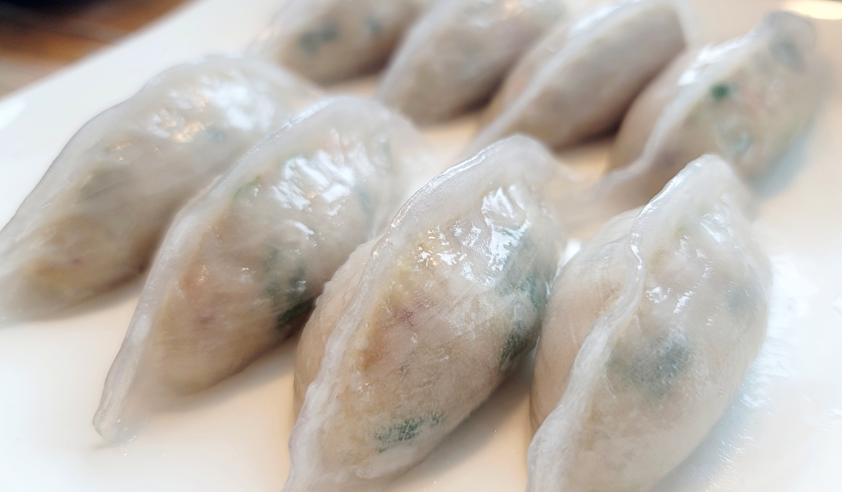 밑반찬이 차려진 뒤 속이 보일 듯한 얇은 피를 자랑하는 낙지만두 8개가 귀엽게 접시 위에 올려져 우리 곁으로 왔습니다. 피가 졸깃합니다. 만두소에 든 낙지가 덩달아 쫄깃한 맛을 보탭니다.