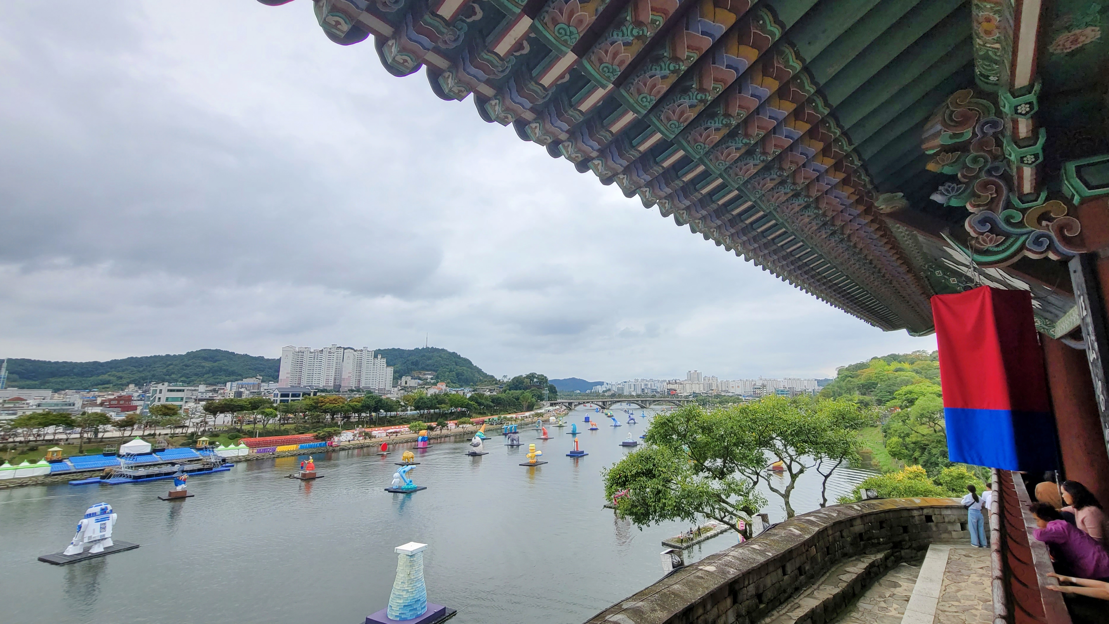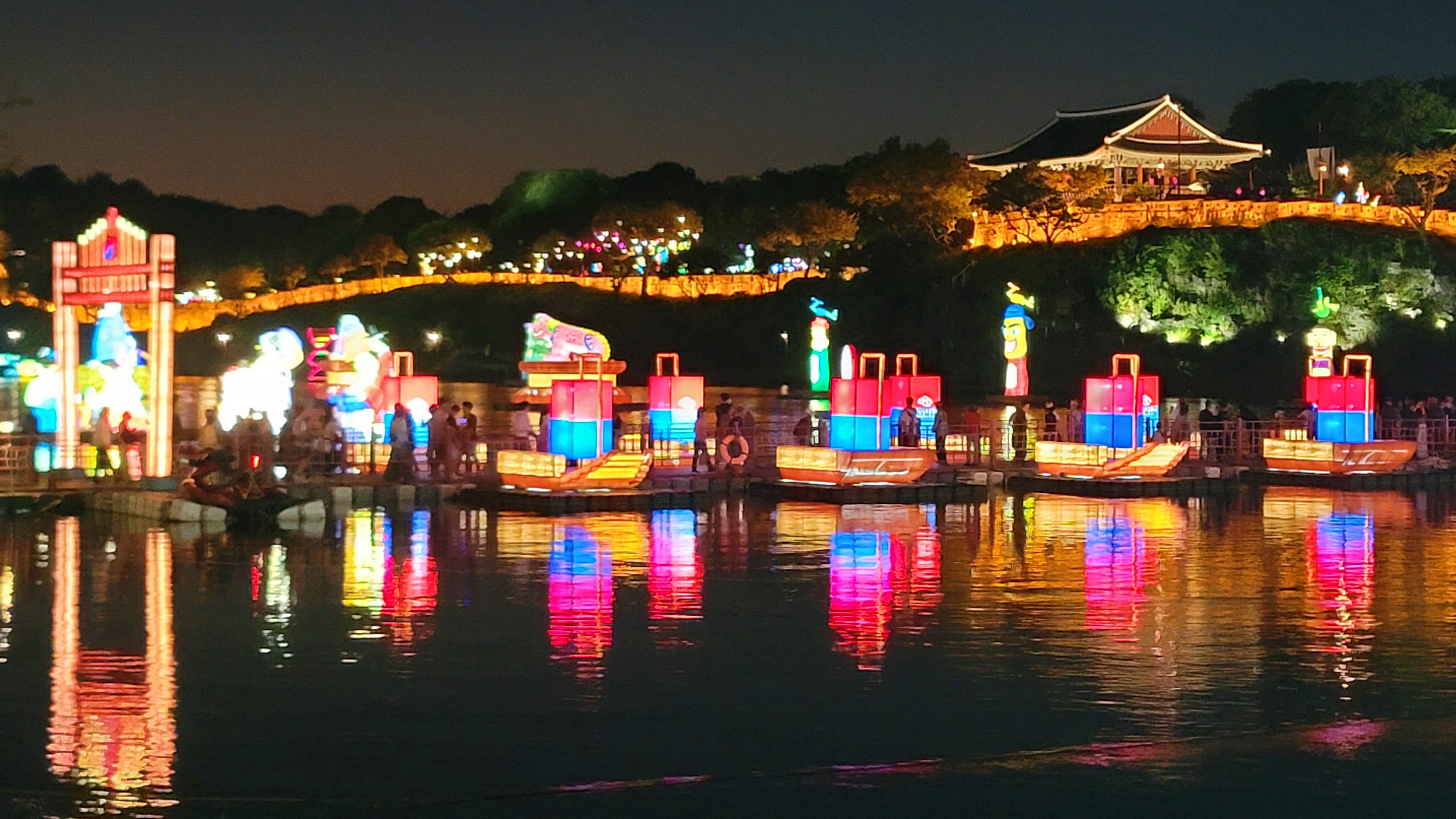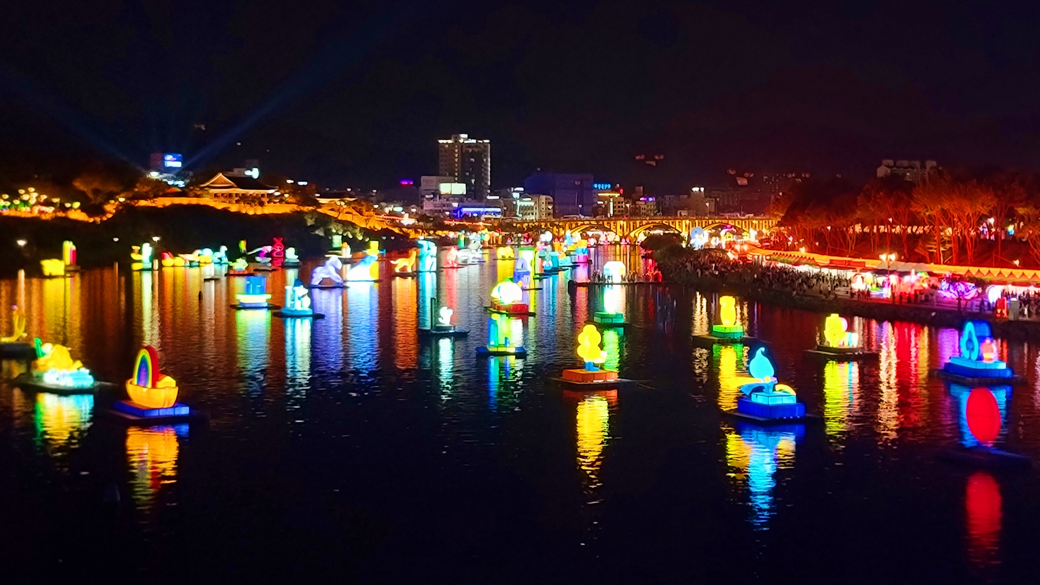그 밖에도 다양한 조형물로 만들어진 등들이 곁에서 반깁니다. 남으로 걸음을 옮겨 성곽 너머를 봅니다. 강바람이 시원하게 뺨을 어루만지고 지납니다. 강에는 온갖 유등들이 한 폭의 그림처럼 떠 있습니다.