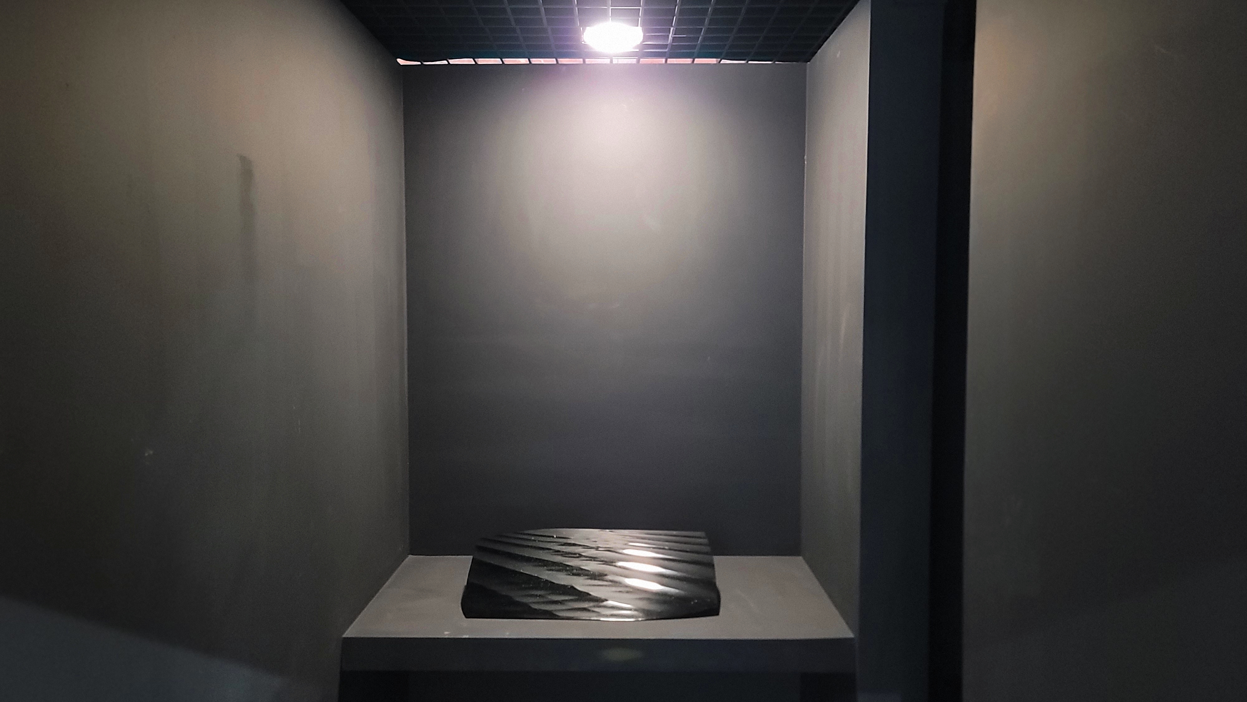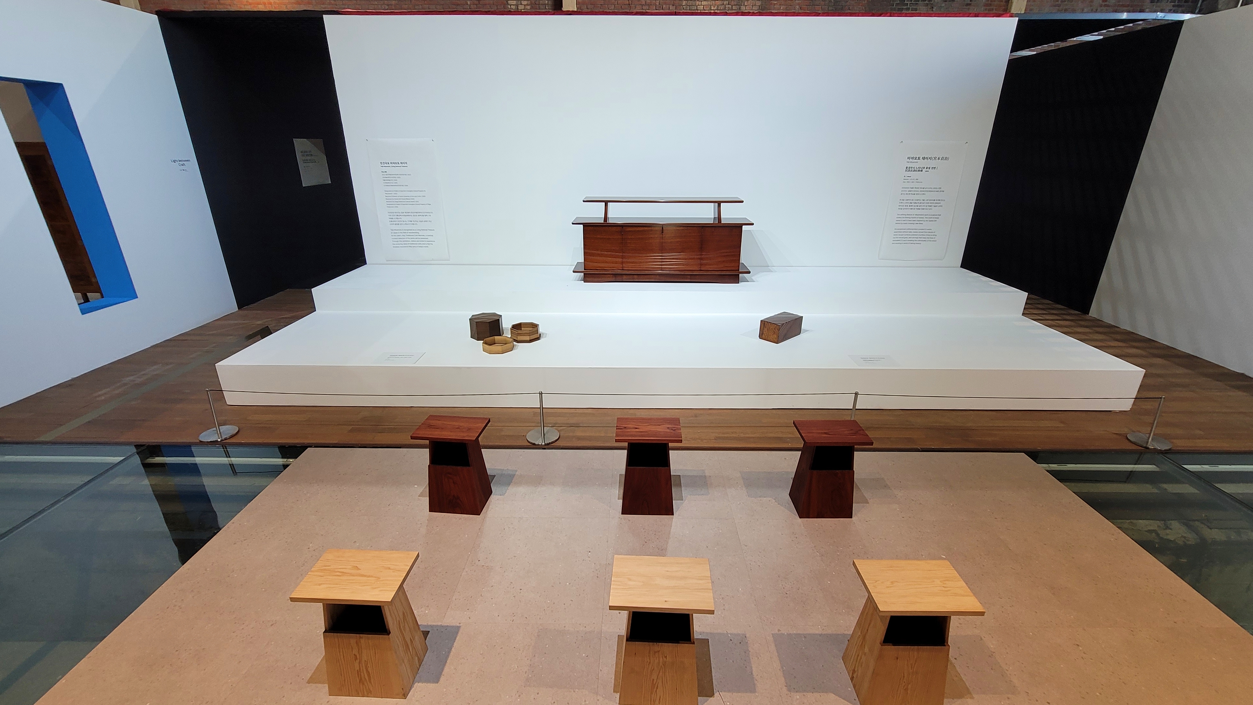 국내 작가들의 전시가 끝나자 마치 학교 교실처럼 나무 의자가 놓여 있고 교단 같은 전시 공간에 일본의 국보급 장인 미야모토 테이지의 작품 <물결무늬 느티나무 옻칠 선반>이 우리를 반깁니다.