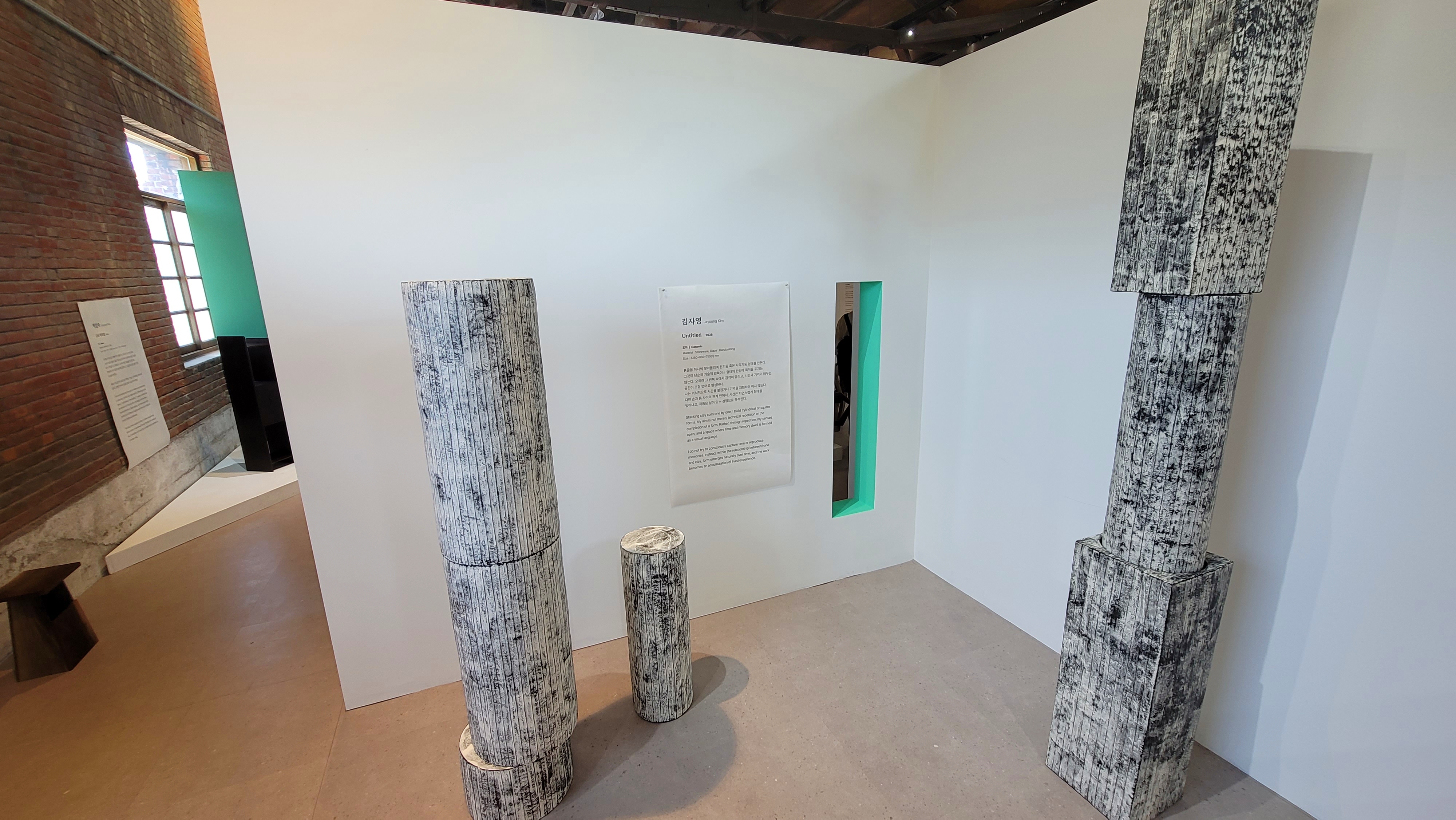 도자로 만든 작품들... 흙줄을 하나씩 밀어 올린 원기둥…. 낯선 풍광이 상상의 나래를 펼치게 합니다.
