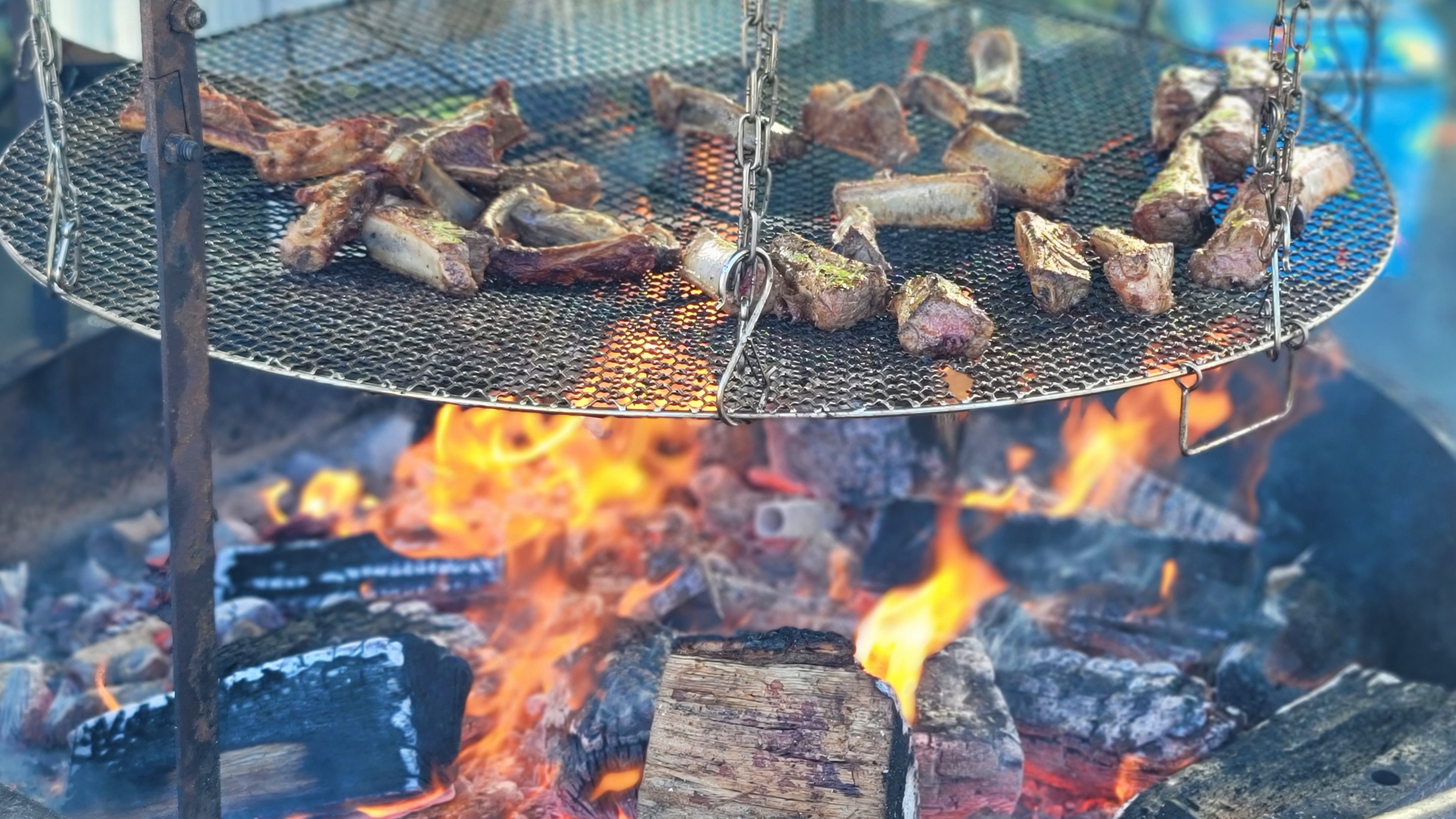 찬찬히 둘러보는 데 저만치에서 고기 굽는 냄새가 솔솔 우리의 발길을 이끕니다. 장작불에 돼지고기가 맛나게 익어갑니다.