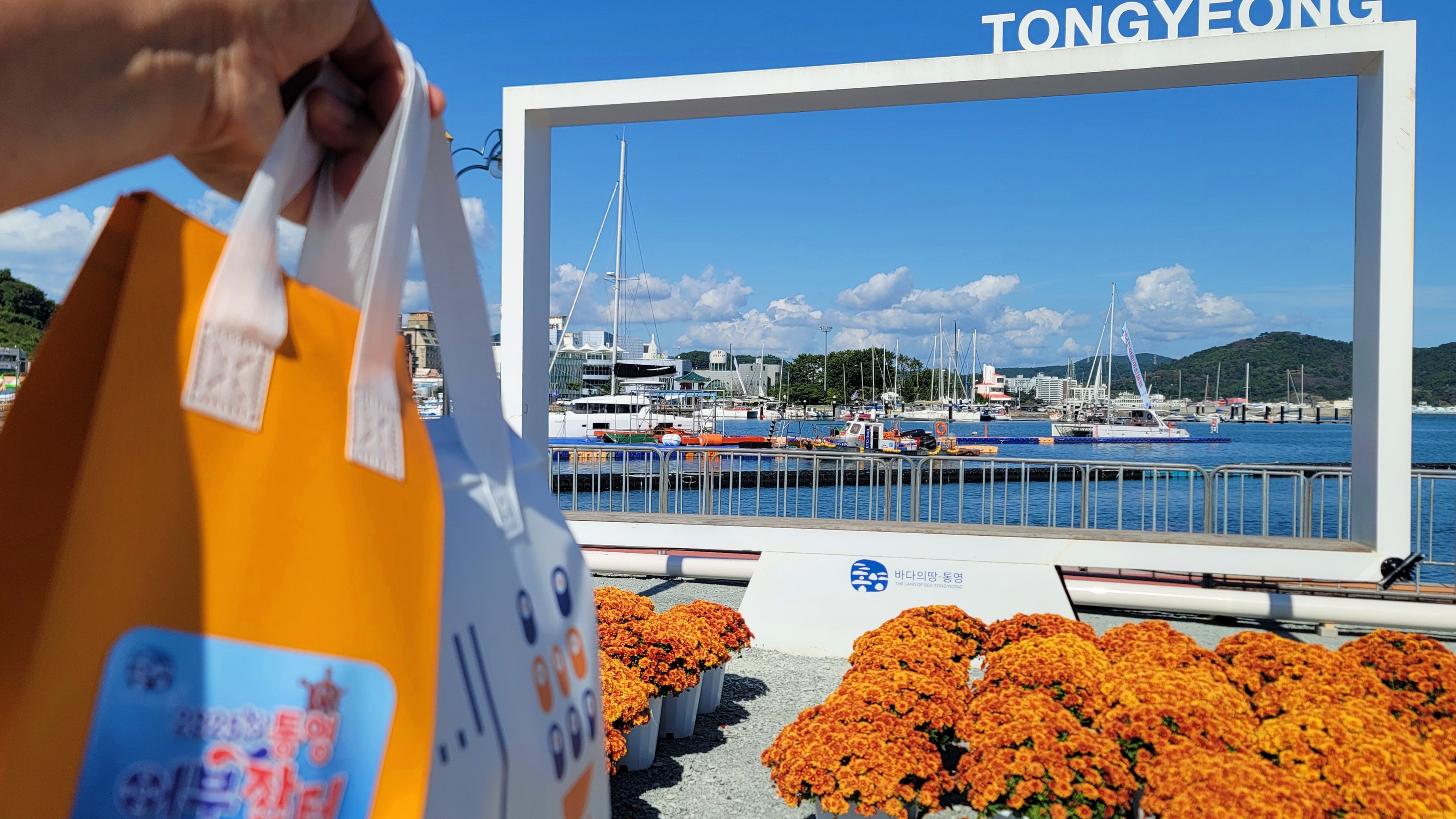 곳곳에는 우리의 눈길과 발길을 붙잡는 홍보물들이 많습니다. 통영시 유튜브와 인스타그램을 구독 장면만 보여줘도 귀엽고 시원한 동백이 부채를 선물 받을 수 있습니다.