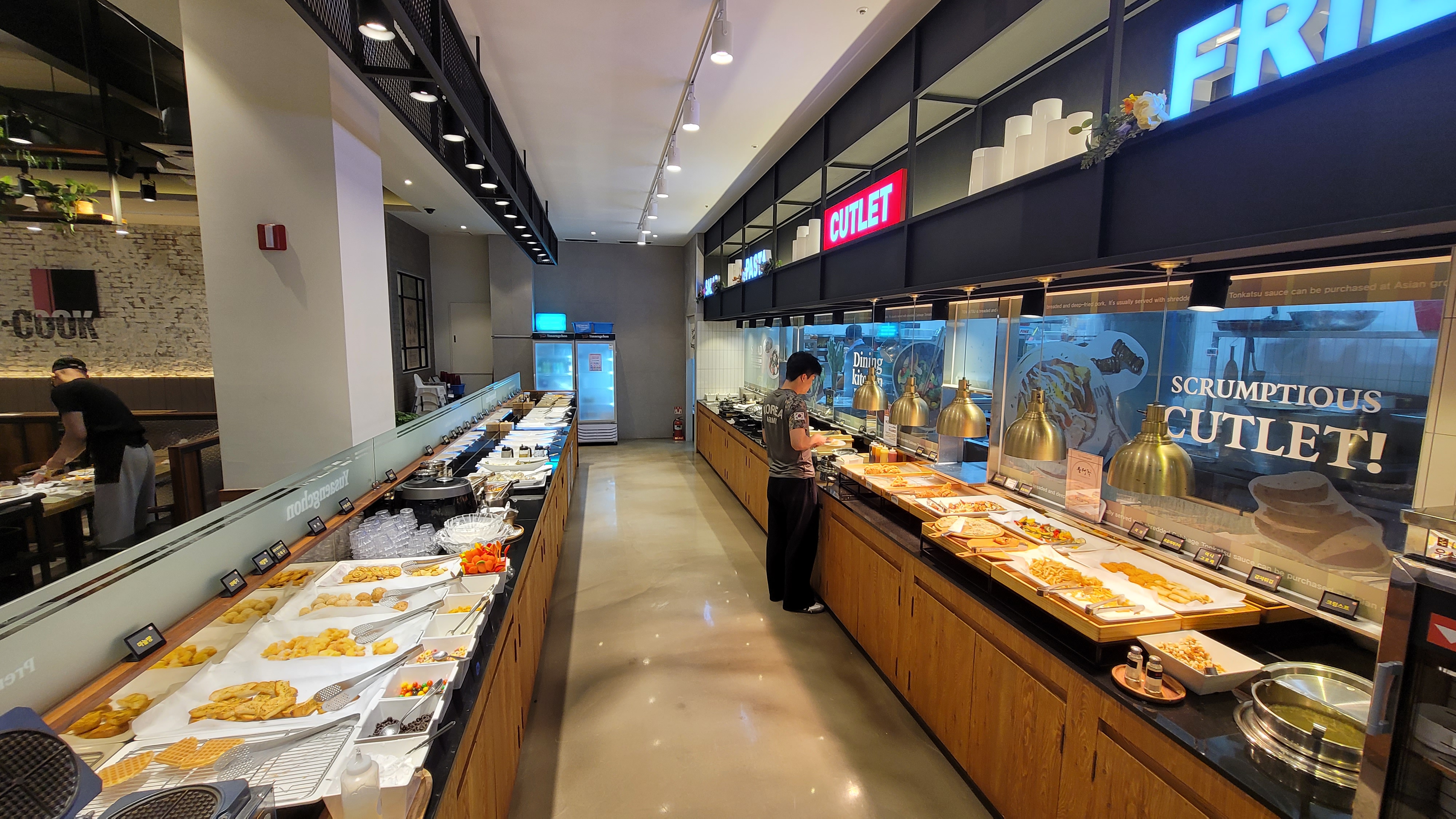 가게 문을 열고 들어서자 탁 트인 공간이 시원함을 안겨줍니다. 자리를 잡고 천천히 음식들이 기다리는 곳으로 향했습니다.
