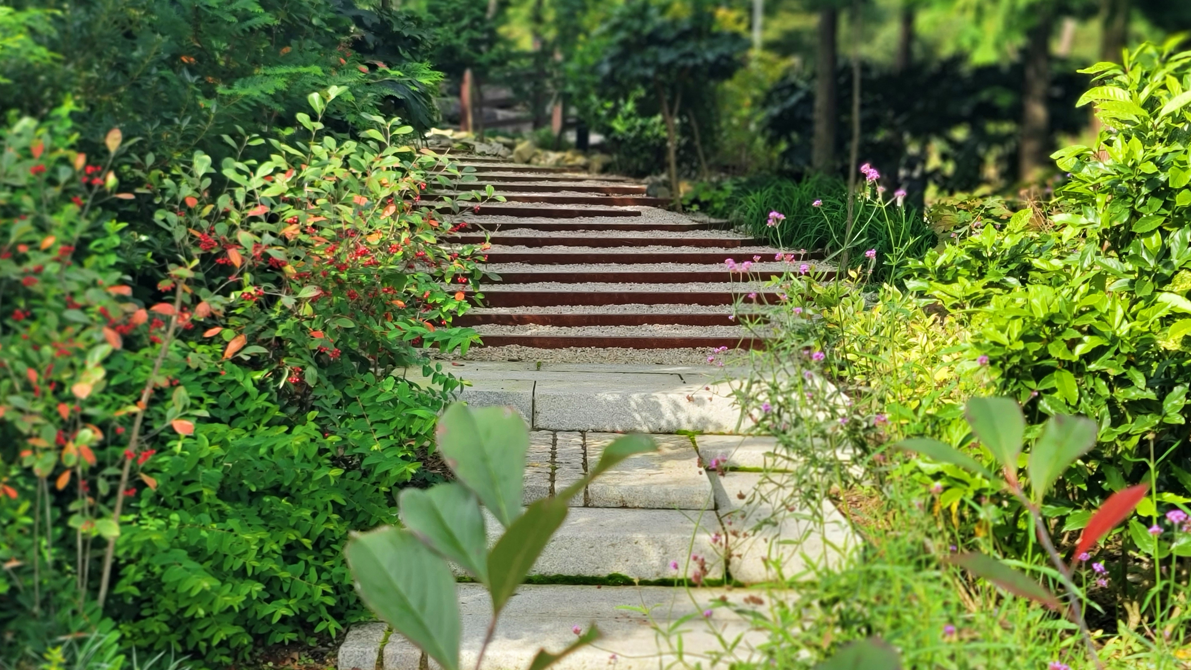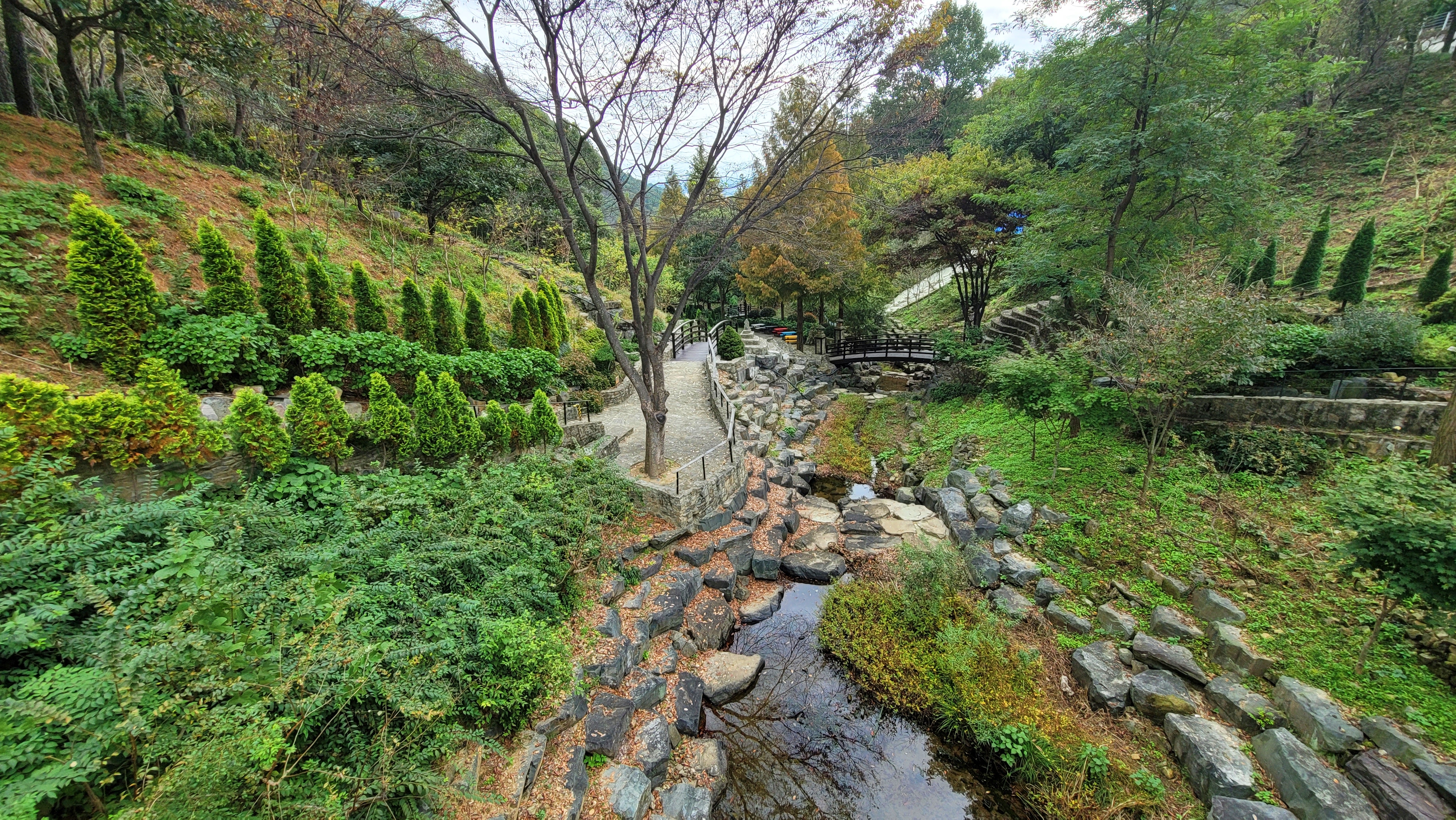 계곡을 가로지른 다리를 건넙니다. 꽃들이 양쪽에서 우리를 열렬히 맞이합니다.