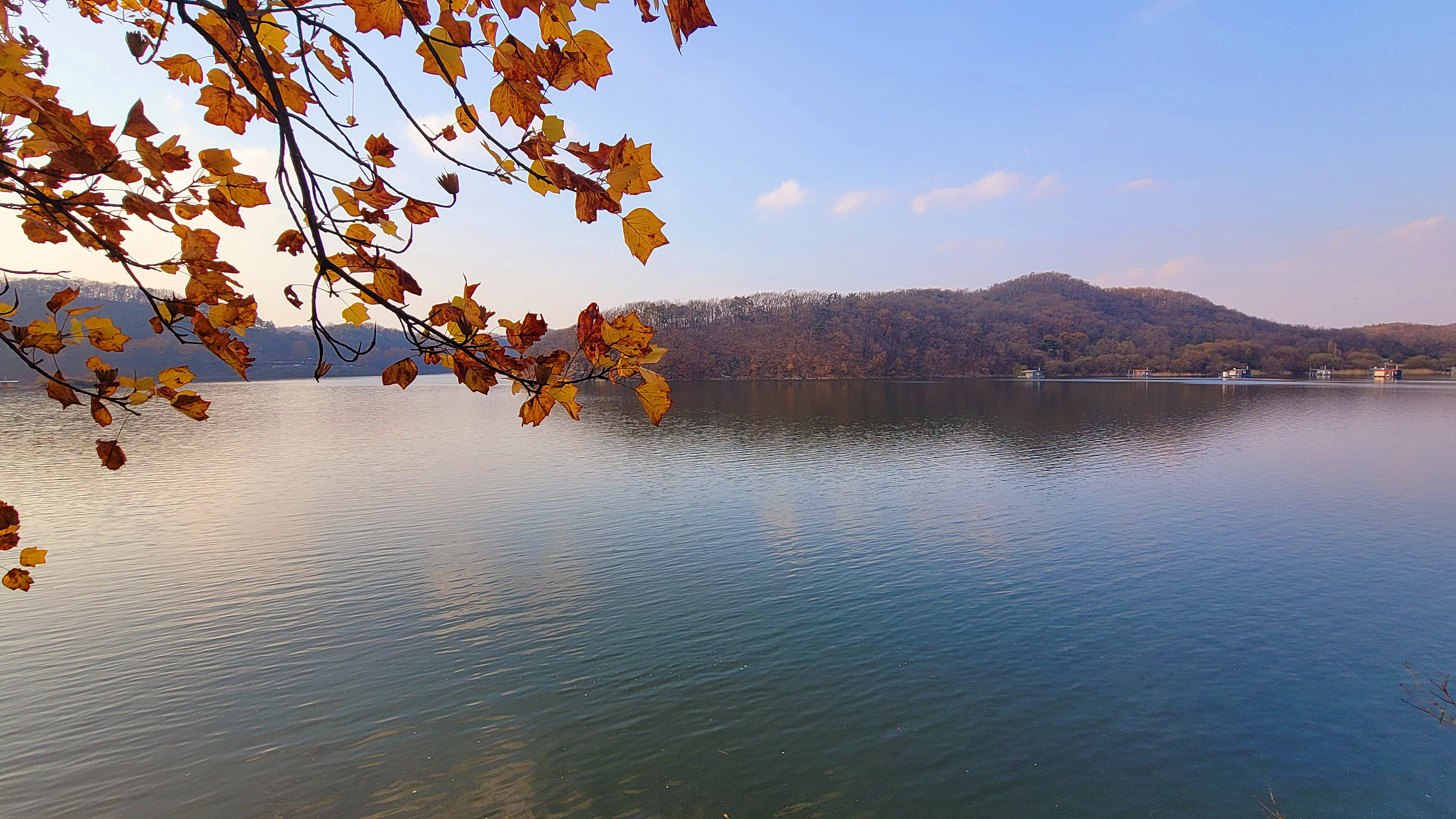 구부러진 가지 끝에서 마지막 잎들이 햇빛을 받아 얇게 빛났다. 호수 너머 산자락은 겨울의 문턱에 선 색을 띠고 있었다.