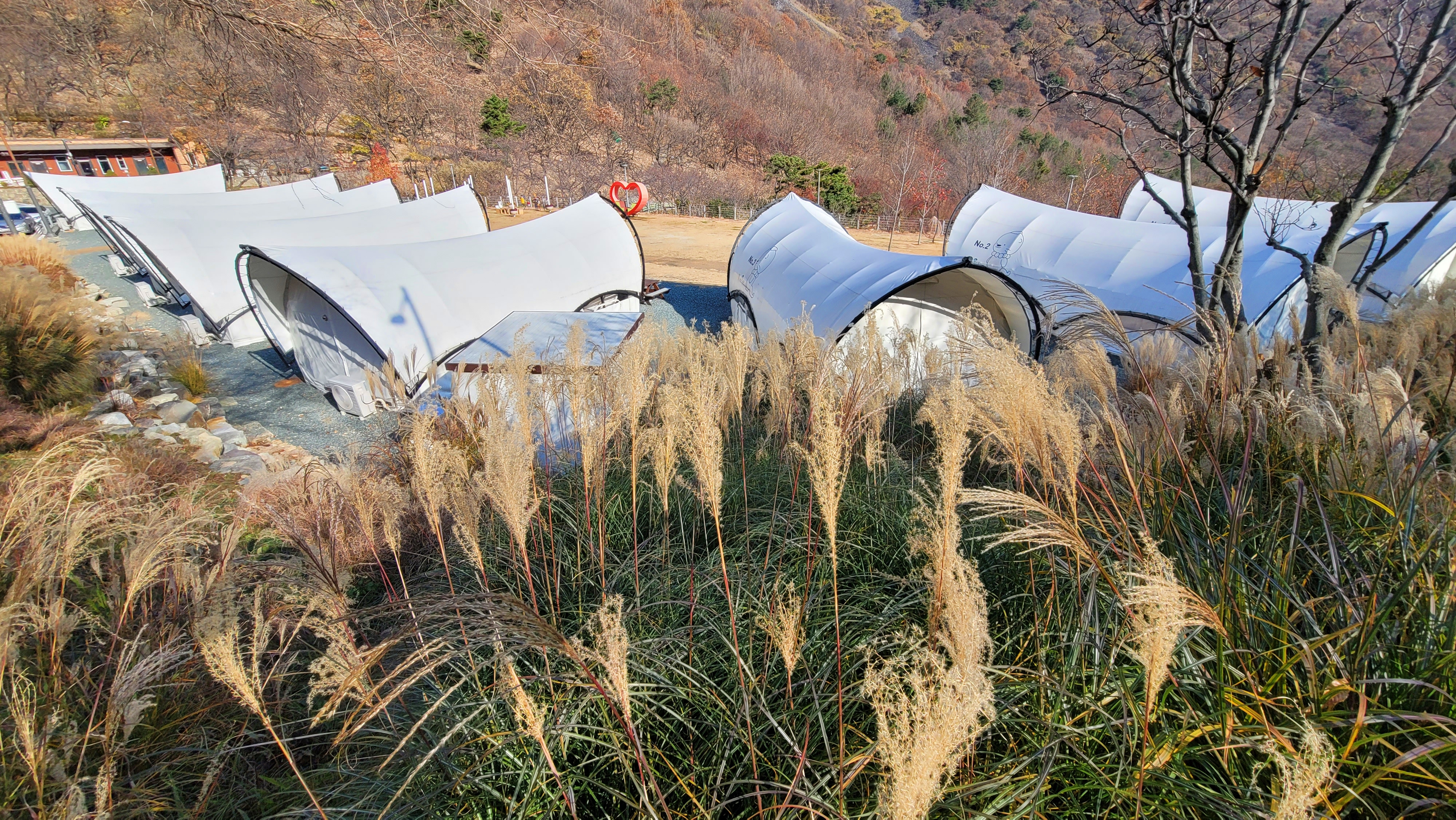 자연휴양림 언덕길에는 흰 지붕을 가진 텐트형 숙소가 산 능선에 차분히 자리했습니다. 억새가 얹힌 풍경이 은빛 호흡처럼 흔들렸습니다. 사진 속 그대로의 분위기였습니다. 겨울나기 좋은 산중의 집들이 포근하게 다가왔습니다.