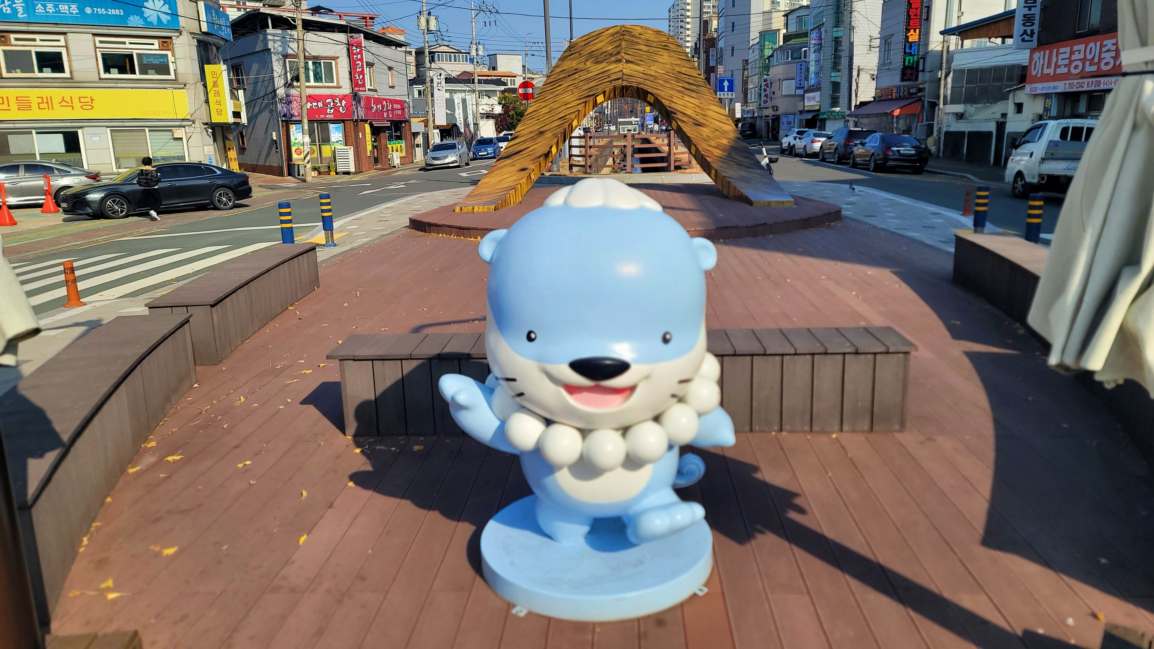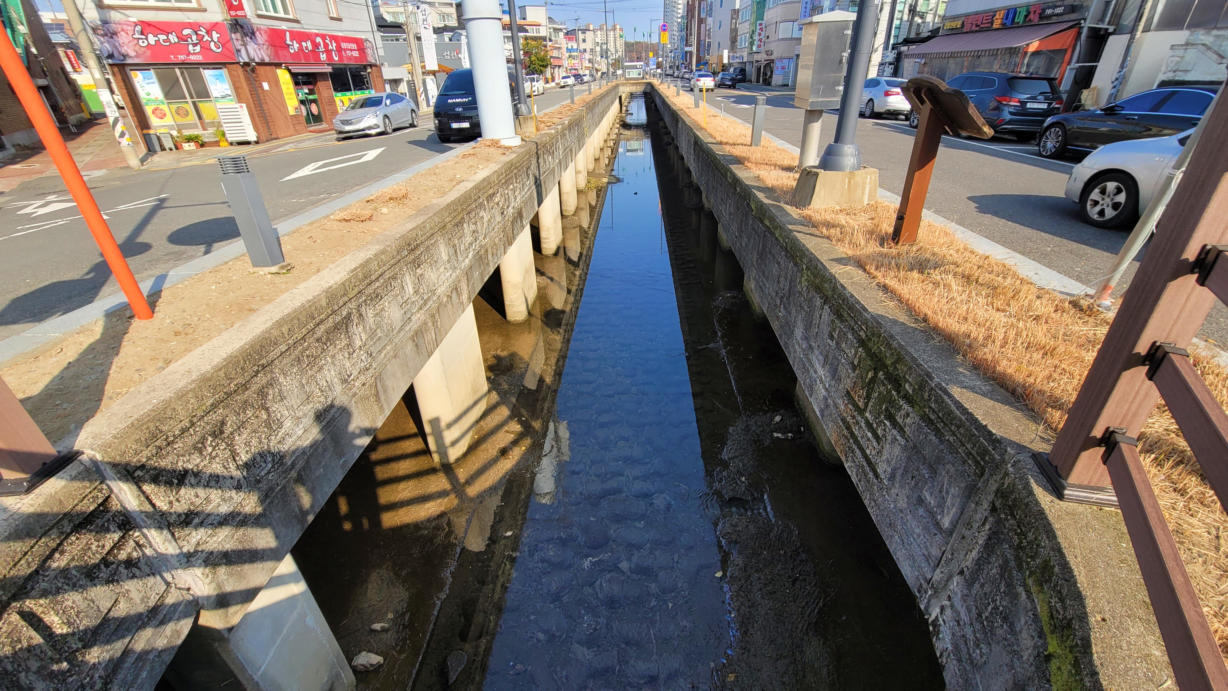 옆 수로에는 곡안천의 흔적이 남아 있습니다. 노출된 배관과 돌바닥이 드러난 수로 풍경이 도시 기반 시설의 속살을 보여줍니다. 한 시대를 달리던 버스와 그 길을 따라오던 시민들의 시간이 자연스럽게 떠올랐습니다. 데크 쉼터와 나무 난간, 지역 캐릭터 ‘하모’ 조형물이 더해져 작은 휴식 공간으로 자리 잡고 있었습니다.