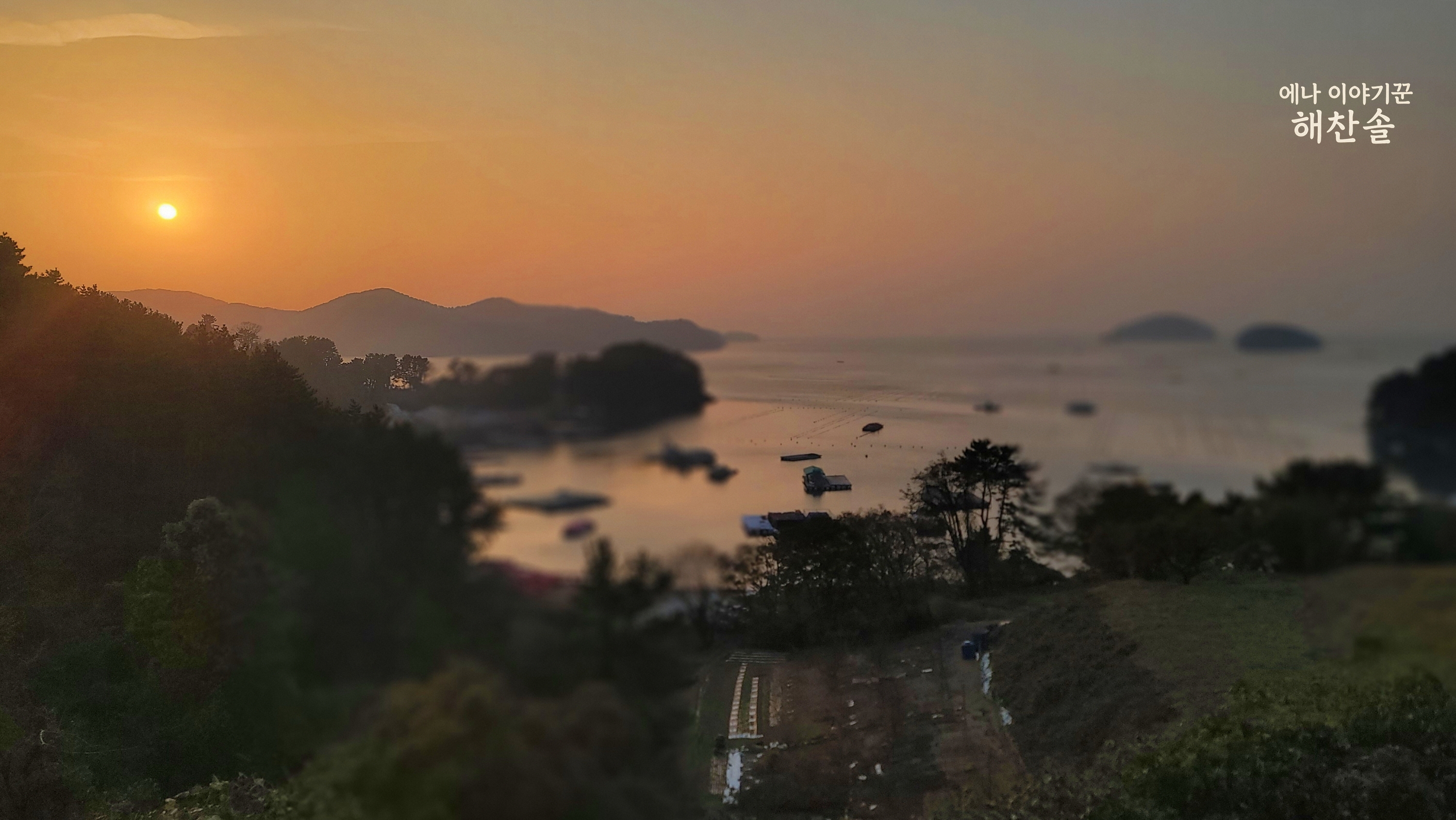 전망대 아래로 펼쳐진 포구와 산의 윤곽이 주홍빛으로 물들었습니다. 지나온 계절의 잔향이 금빛 물결 사이에서 잦아들며 고요하게 마무리되었습니다.