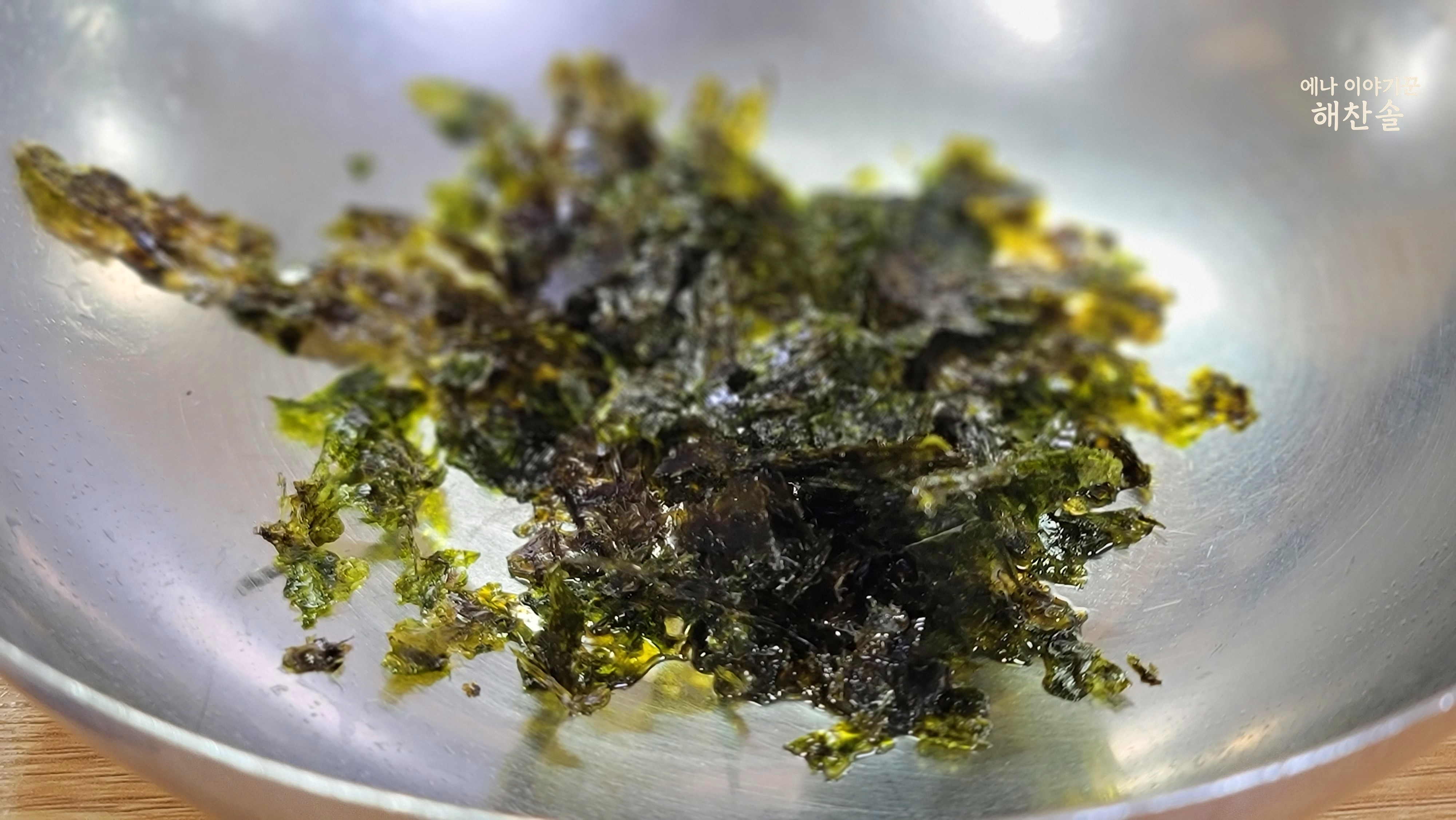자리 잡고 주문을 마치자 먼저 김 가루가 뿌려진 스테인리스 대접이 놓입니다.