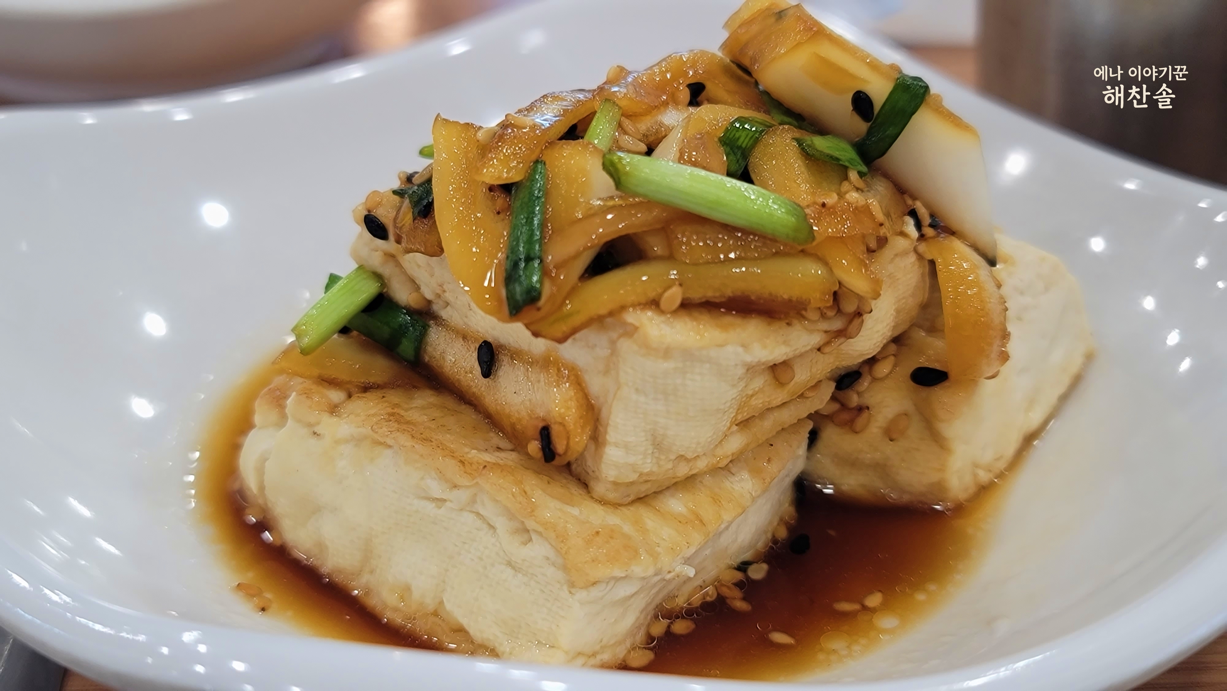 주메뉴보다 밑반찬이 먼저 나옵니다. 김치는 붉은빛을 과시하지 않습니다. 잘 익은 결이 차분합니다. 잔멸치볶음은 작고 단단합니다. 윤기가 과하지 않습니다. 씹을수록 고소함이 남습니다. 두부 반찬은 큼직하게 썰려 나옵니다.