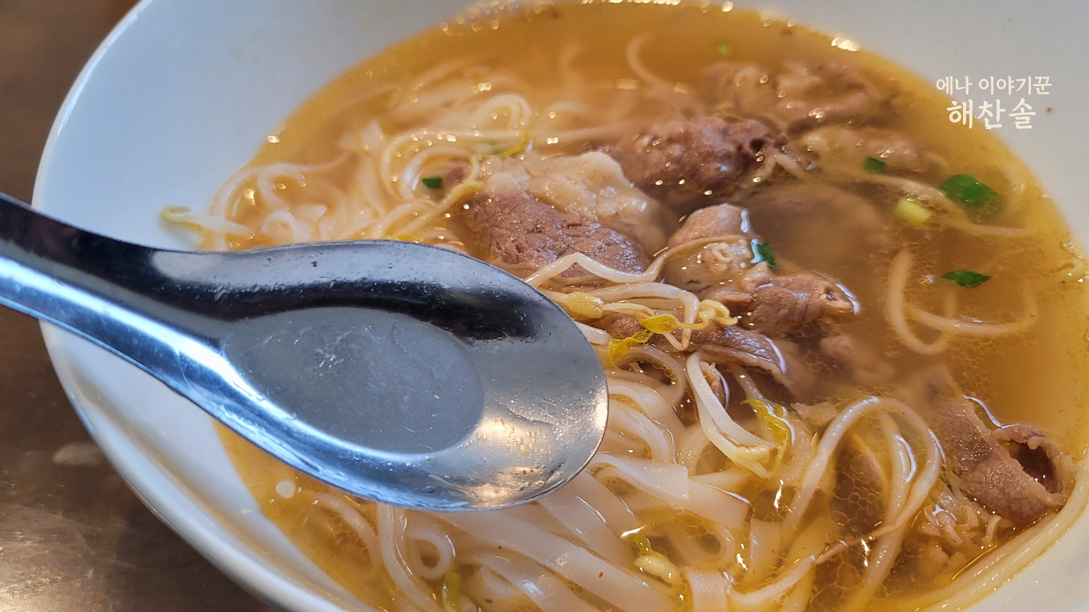 이윽고 쌀국수가 옵니다. 먼저 국물을 숟가락 한입 떠먹었습니다. 국물은 맑은데 가볍지 않습니다. 숟가락을 넣으면 향이 앞서지 않고, 삼킨 뒤에야 깊이가 따라옵니다. 과하지 않게. 국물의 흐름을 정리해 준다. 도 추어 한 젓가락 집어 먹고 다시 국물을 마시면, 육수의 깊이가 더욱 또렷해지는 기분입니다.