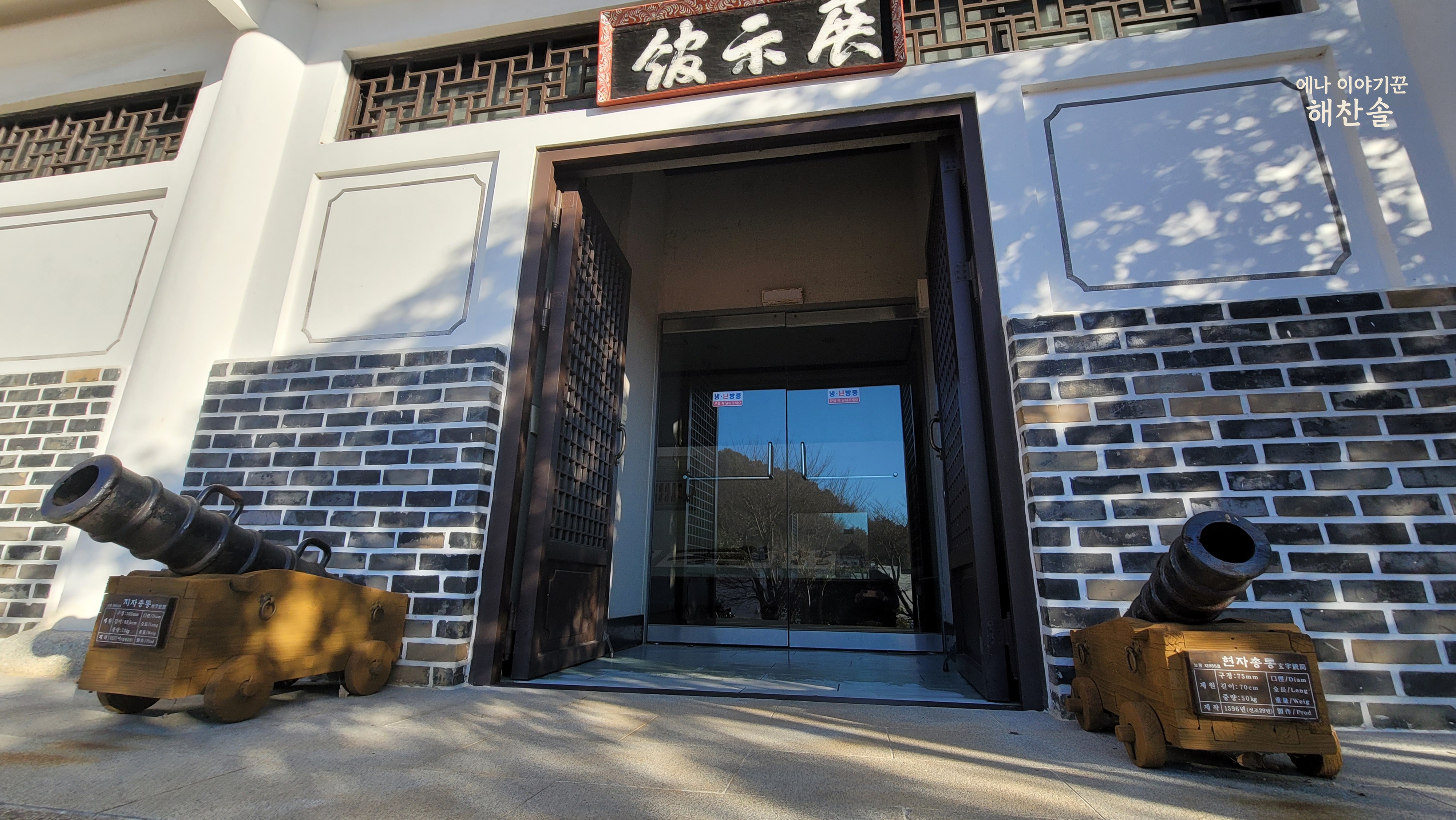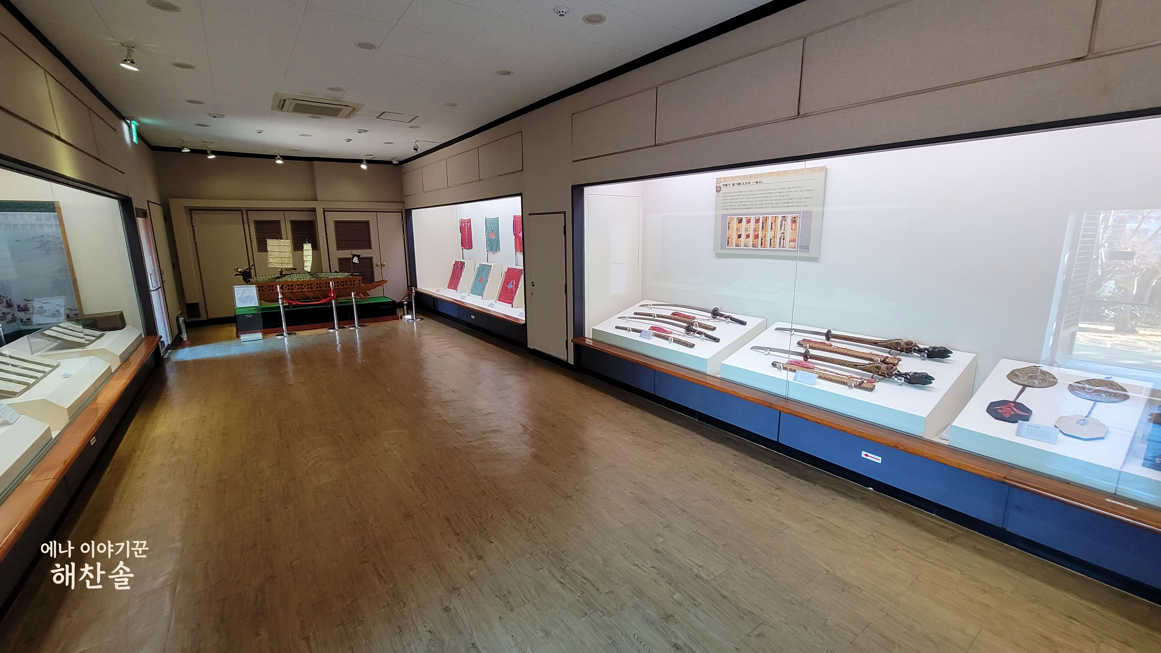 사당을 내려오며 지나왔던 누각 옆 기념관으로 향했습니다. 팔사품이 전시된 공간입니다. 이순신 장군의 무공이 명나라에 전해지며 황제가 하사한 도독인과 곡나팔, 독전기 등 여덟 종류의 유물들이 이곳에 놓여 있습니다.