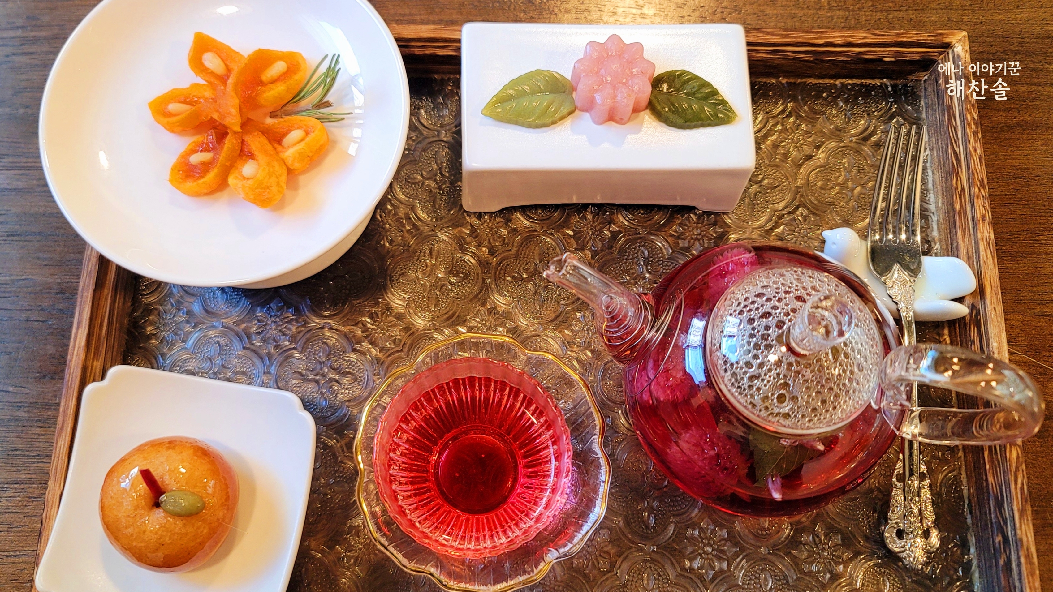 자리에 앉자 비로소 시간이 차분히 내려앉았습니다. 말은 음 소거처럼 줄어들며 시선은 자연스럽게 테이블 위를 향합니다. 잠시 후, 다과 한 상이 놓이는 순간 테이블 위에 작은 정원이 펼쳐졌습니다. 이 한 상은 먹기 전에 먼저 바라보라고 놓인 풍경이었습니다. 순식간에 넉넉한 정원의 기운이 우리의 가슴 속으로 스며들었습니다.