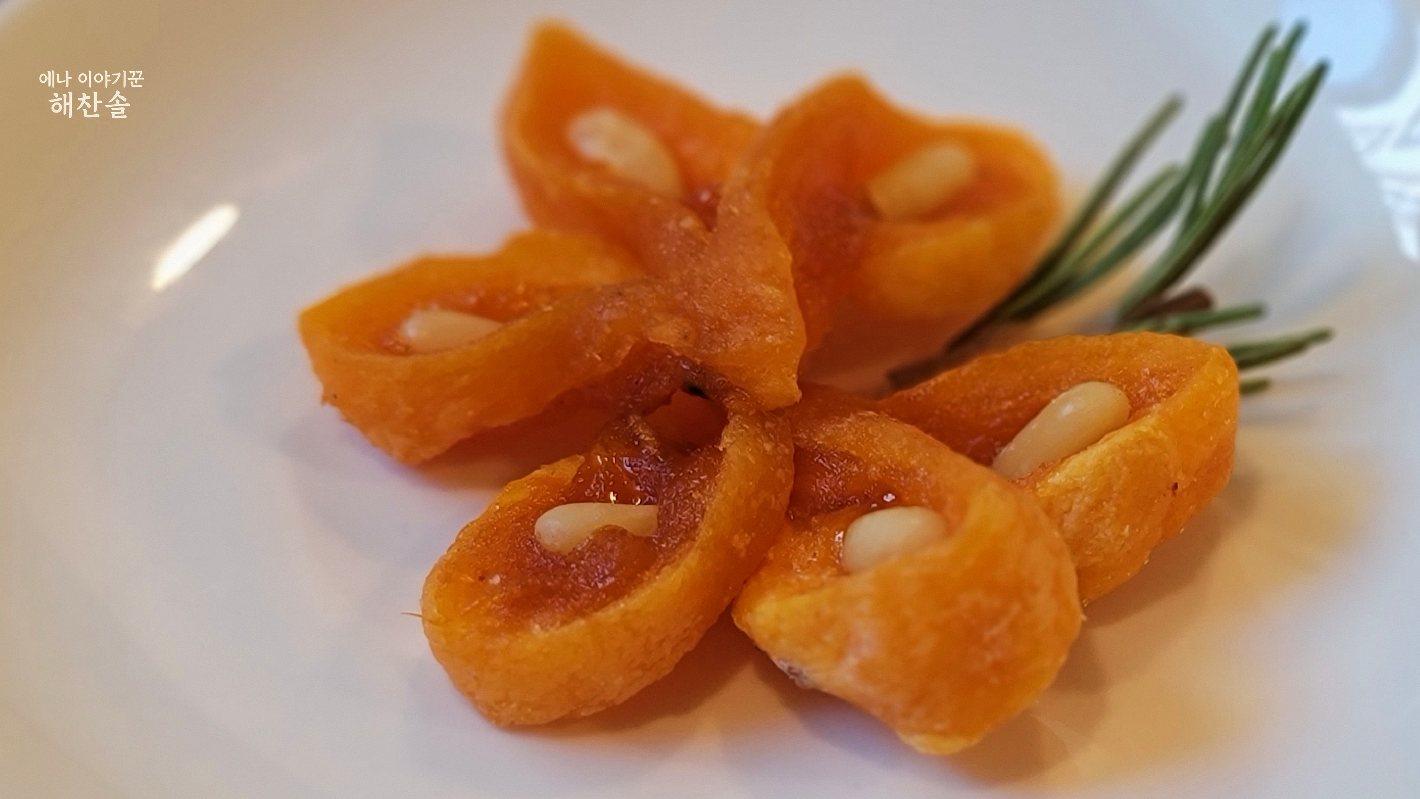 가운데에는 대봉감으로 만든 꽃이 겨울 선물처럼 놓여 있습니다. 감을 얇게 저며 꽃잎처럼 만든 장식이지만, 이 또한 먹을 수 있는 다과입니다. 눈으로 한 번 즐기고, 입으로 다시 한번 확인합니다. 진주 늘새솔의 다과는 보기와 맛이 분리되지 않는 한 상이었습니다.