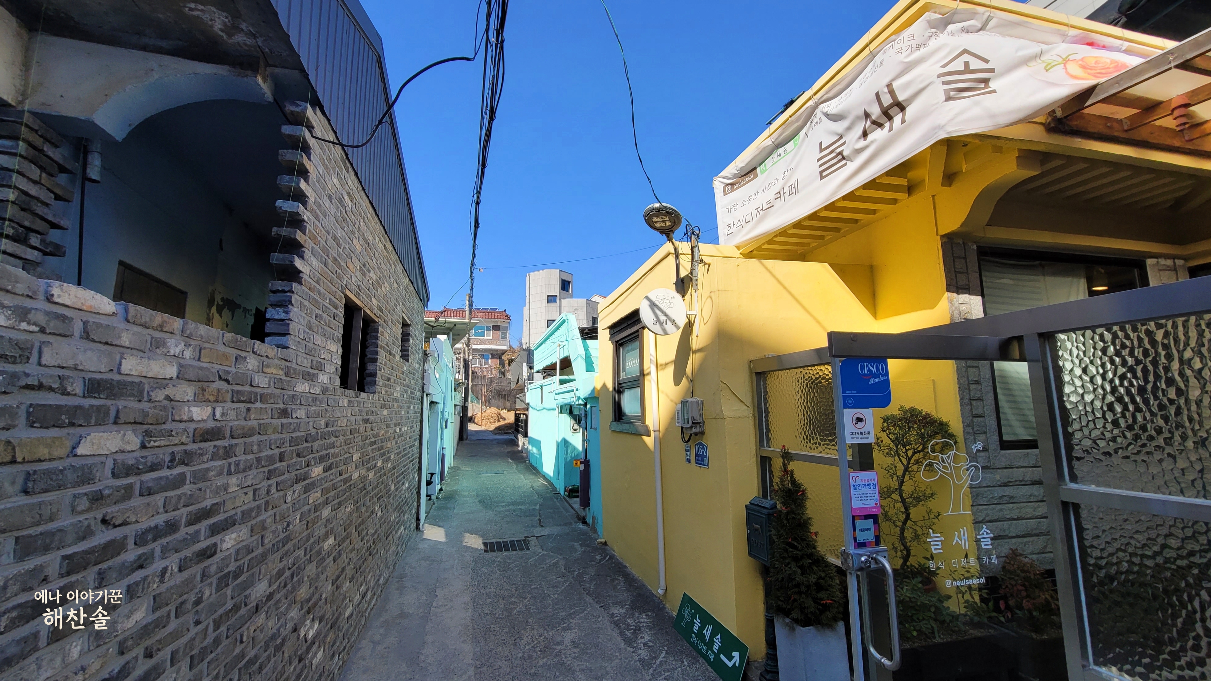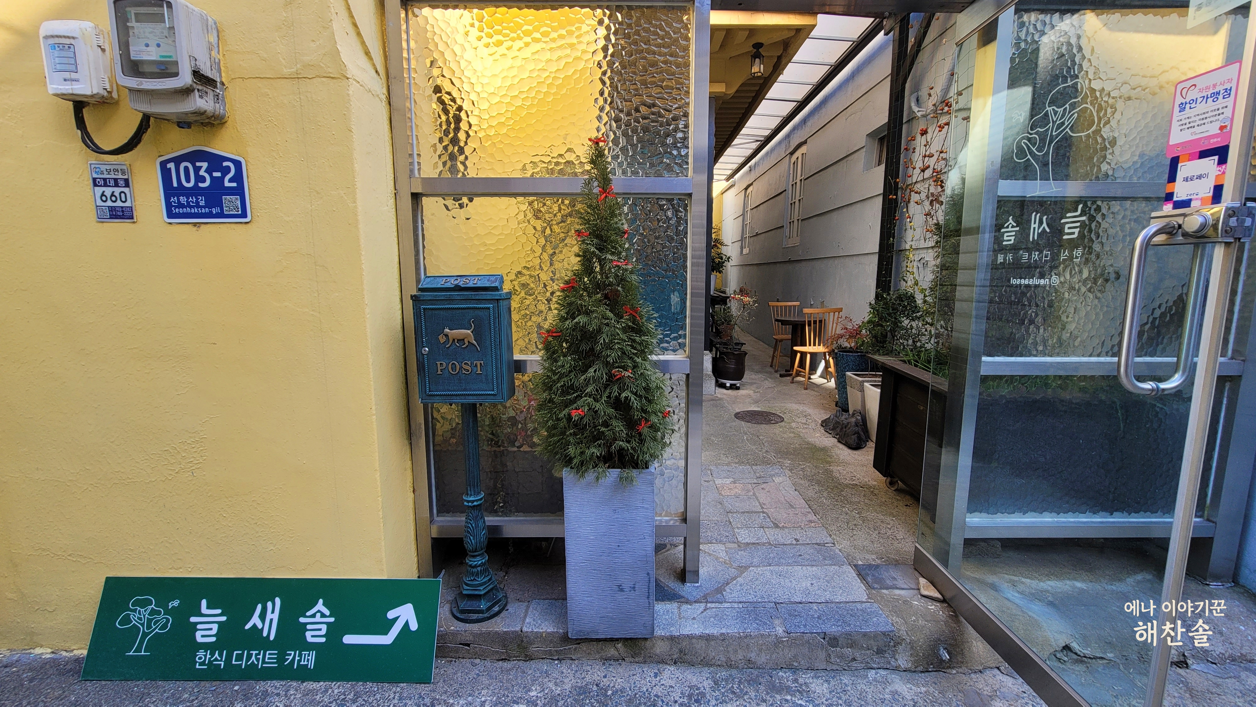 노란 외벽의 작은 집, 늘새솔. 진주 선학산 골목에 자리한 단층주택을 개조한 한식 디저트 카페입니다.