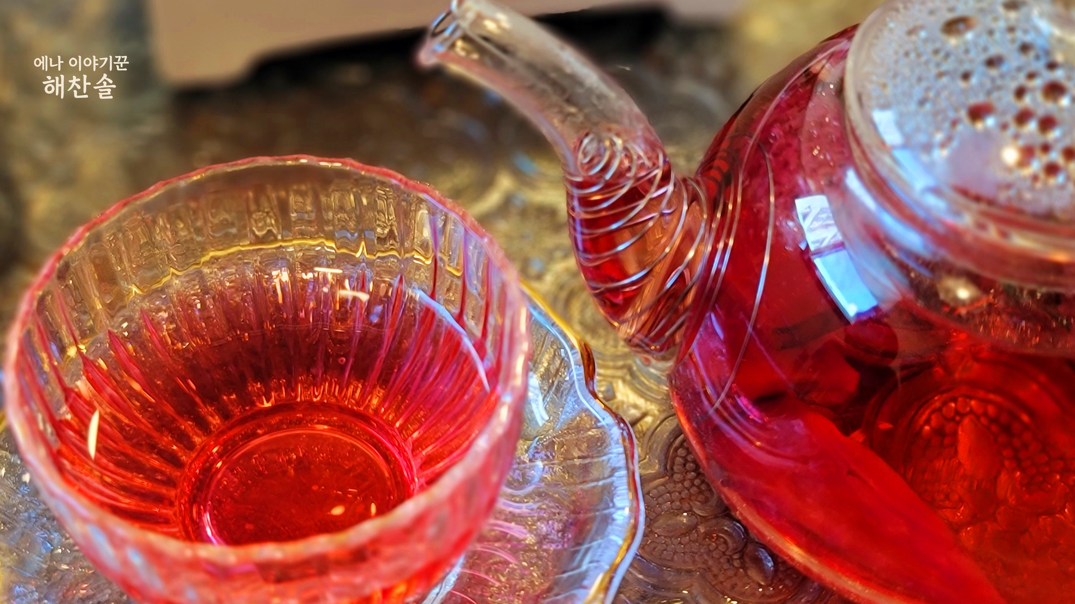유리 주전자 속 꽃차는 천일홍과 비트, 애플민트가 어우러진 밝은 자줏빛입니다. 찻잔에 따르는 순간 두 눈이 빛에 흔들리고, 향이 먼저 다가옵니다. 은은한 꽃 향 뒤로 민트의 맑은 기운이 따라옵니다. 한 모금 마시는 순간, 몸 안에 남아 있던 피로가 온천욕을 하듯 풀리는 기분입니다. 다과와 차를 번갈아 음미하는 동안 말은 줄어들고 감각은 또렷해집니다. 달지 않고 과하지 않으며 남기지 않는 맛. 이 한 상은 배를 채우는 디저트가 아니라, 일상에서 힘겨운 하루하루를 보낸 우리를 대접하는 작지만 큰 상차림입니다.