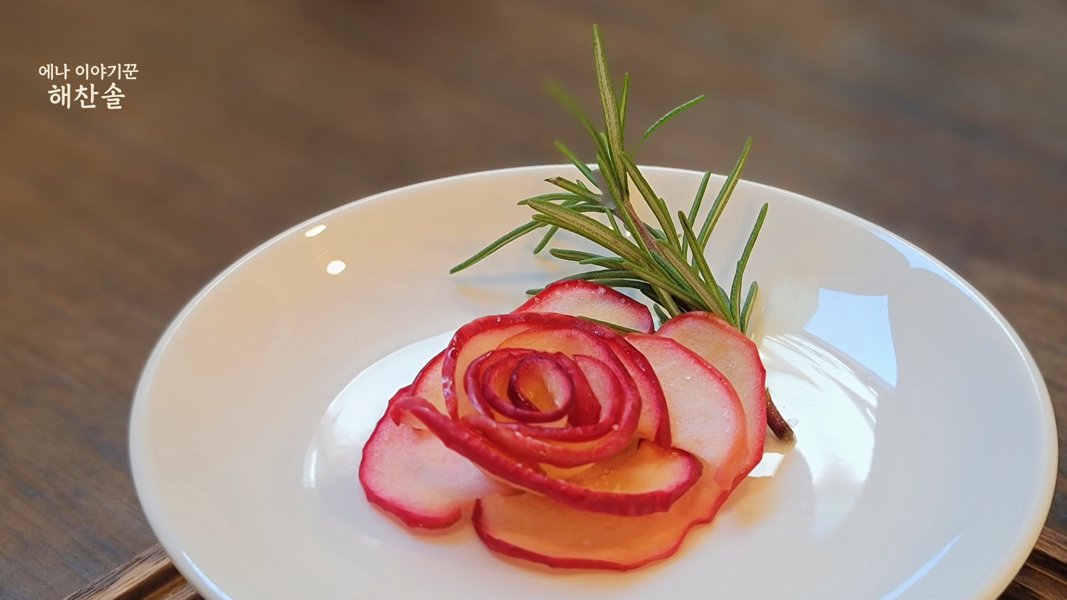 사과 홍옥을 얇게 깎아 꽃잎처럼 말아 올린 다과가 곱습니다. 붉은 껍질의 선이 그대로 남아 있어 계절의 결이 보입니다. 입에 넣는 순간 산뜻한 향과 단맛이 또렷하게 살아납니다.
