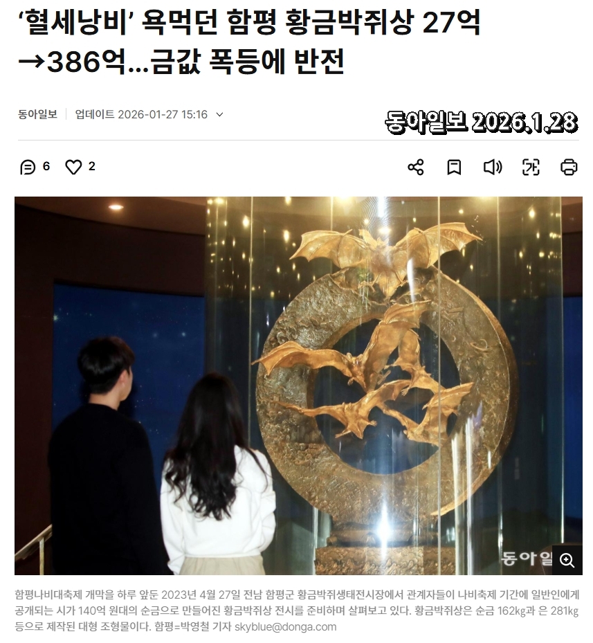 기사에 따르면 순금 162kg과 은 281kg으로 만든 함평 황금박쥐상은 금값 급등으로 가치가 386억 원을 넘겼습니다. 2008년 제작 당시 재료비는 약 27억 원이었습니다. 18년 만에 13배 이상 오른 셈입니다. 가로 1.5m, 높이 2.1m의 이 조형물은 은으로 된 원형 위에 순금으로 만든 황금박쥐 6마리가 날아오르는 모습을 형상화했습니다. 관광객 유입 효과가 기대에 미치지 못한다는 이유로 한때 혈세 낭비라는 비판을 받았지만, 금값이 오를 때마다 다시 평가받고 있습니다.