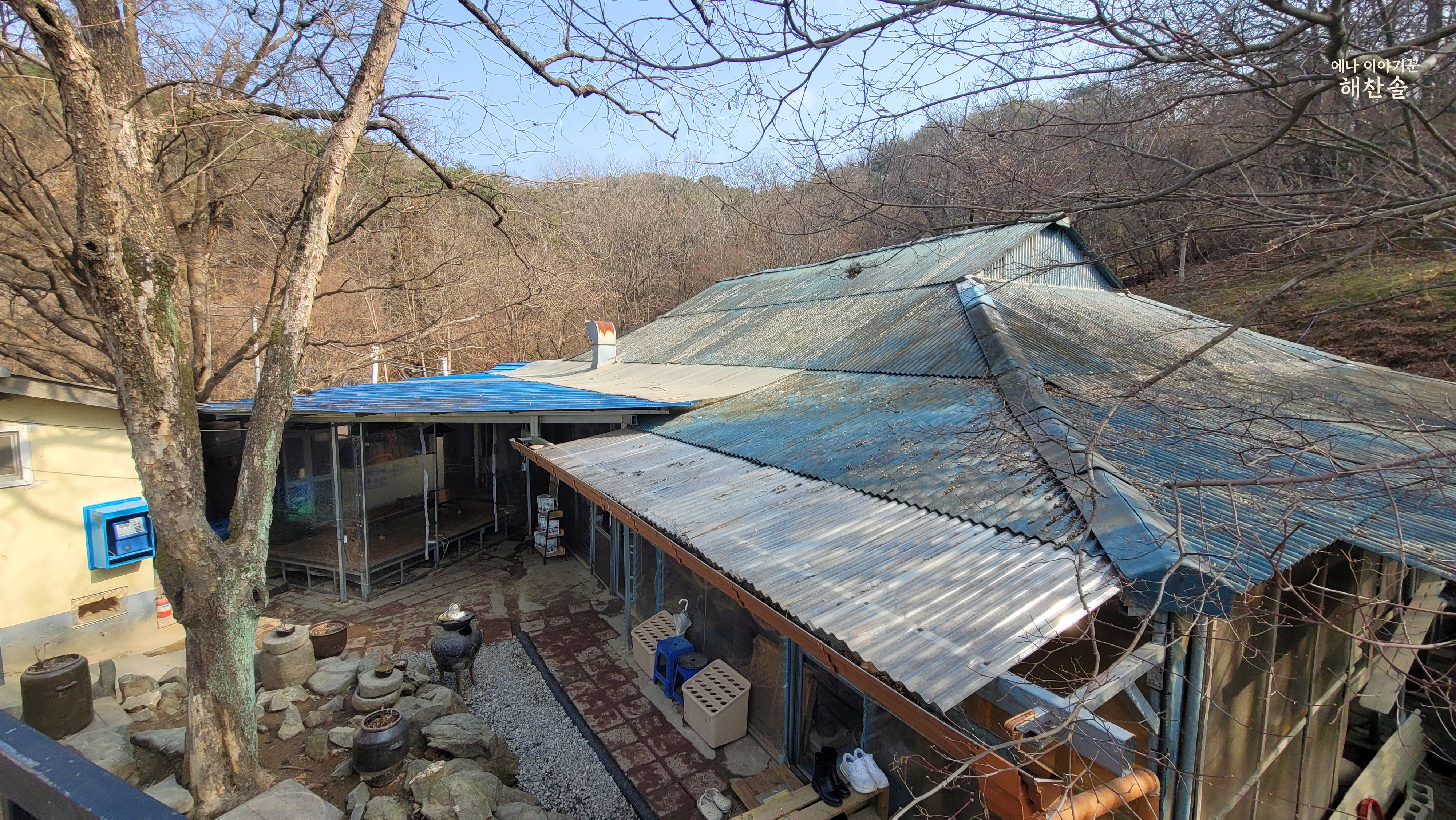 마당 한쪽 옹기와 돌절구는 손님보다 먼저 이 집을 지켜온 얼굴이었습니다. 산비탈 마른 가지들이 지붕 너머로 팔을 뻗고, 그 아래로 우리는 천천히 안쪽 자리로 걸었습니다.