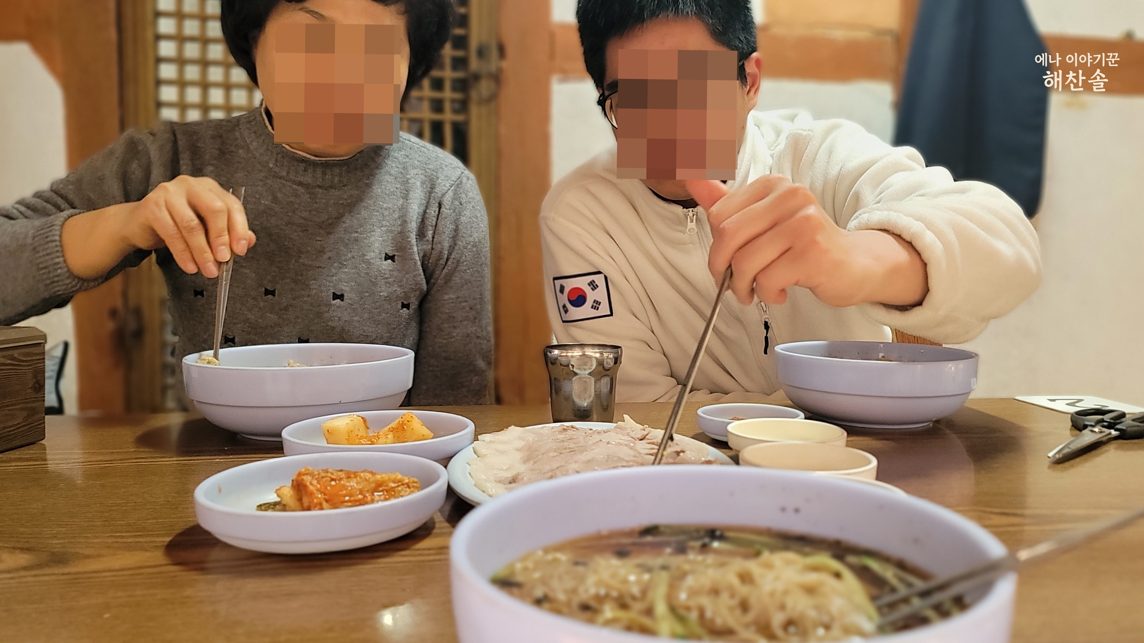 우리가 먼저 자리를 잡고 막국수를 먹기 시작할 즈음, 옆 테이블에 젊은 여자 둘이 들어왔습니다. 잠시 뒤 그들 앞에도 음식이 놓였습니다. 휴대전화를 들고 서로 사진을 찍었습니다. 웃음이 먼저 떠올랐고 젓가락은 그다음이었습니다. 그들이 후루룩 면을 들이키는 모습이 이 집의 또 다른 간판 같았습니다. 젓가락이 그릇에 닿는 소리와 면을 푸는 소리가 이어졌습니다. 우리 셋의 목소리가 방 안에 둥글게 모였습니다. 오늘 점심은 여행이면서 귀가 같은 자리였습니다.
