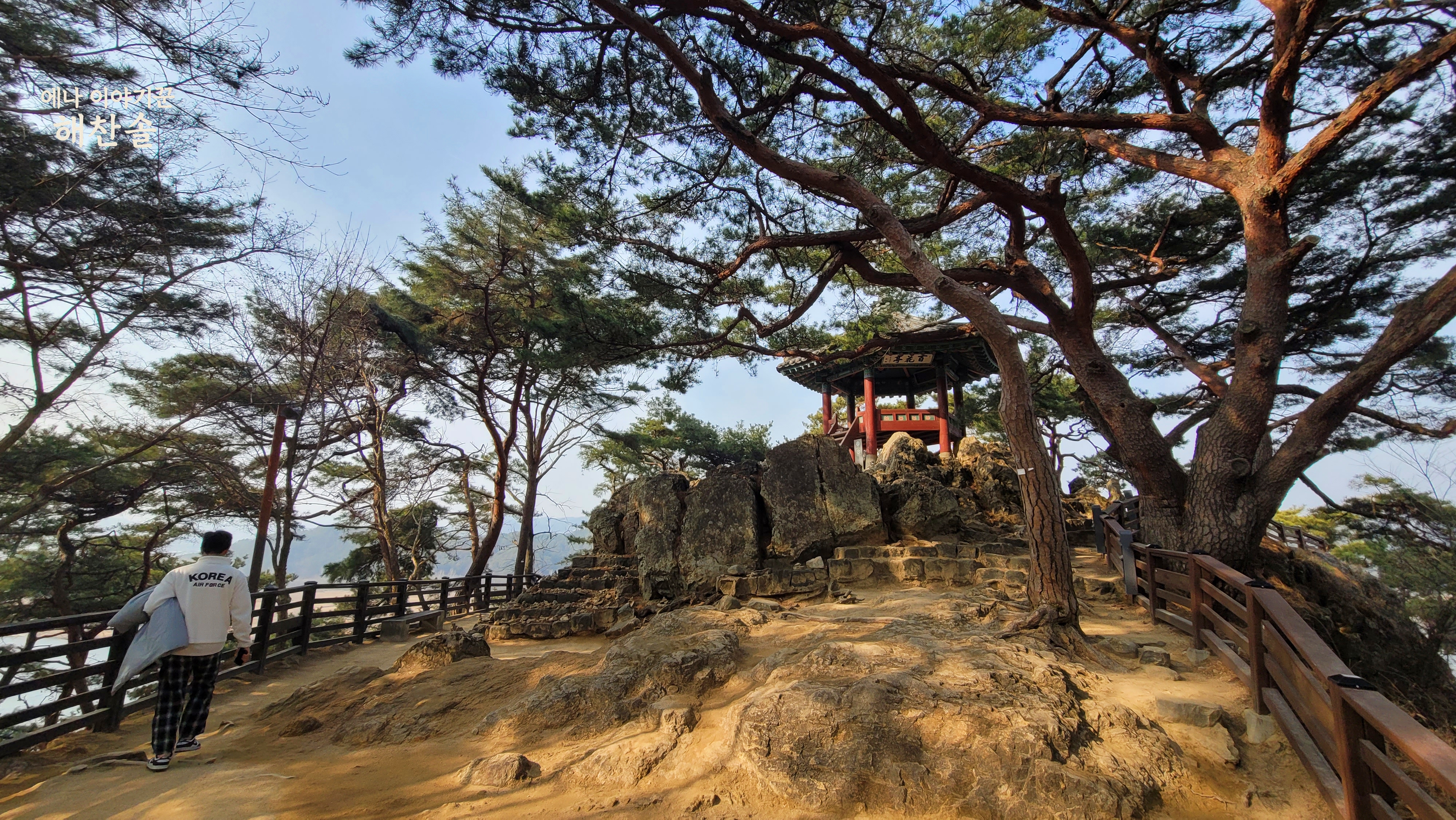 약수의 기운 덕분에 가파른 낙화암까지 한달음에 올랐습니다. 붉은 기둥 솔가지 사이에 걸렸습니다.